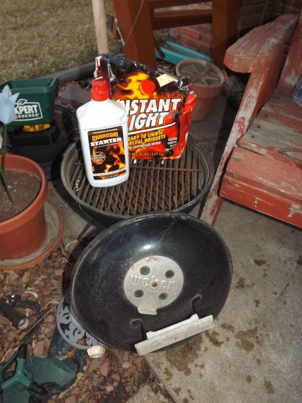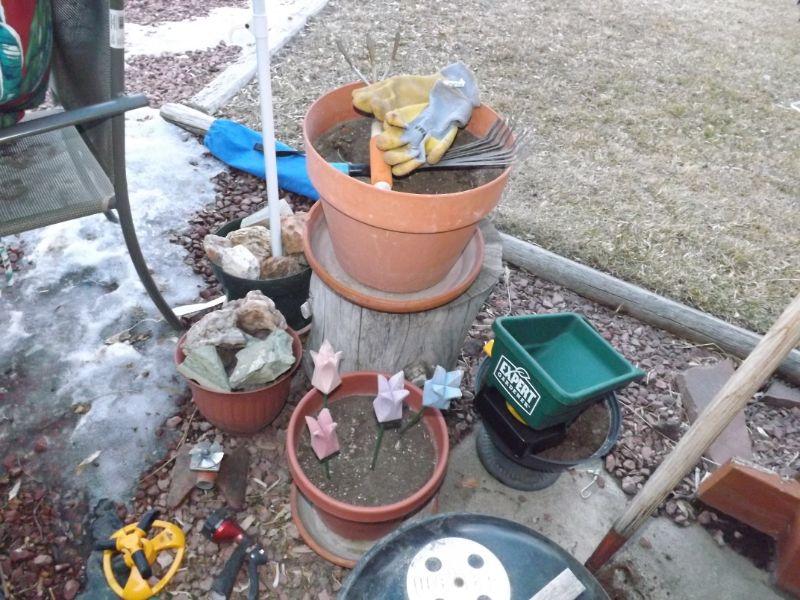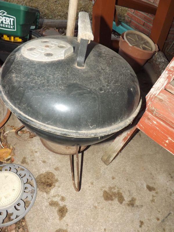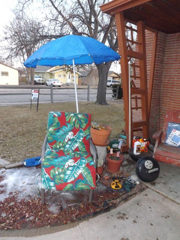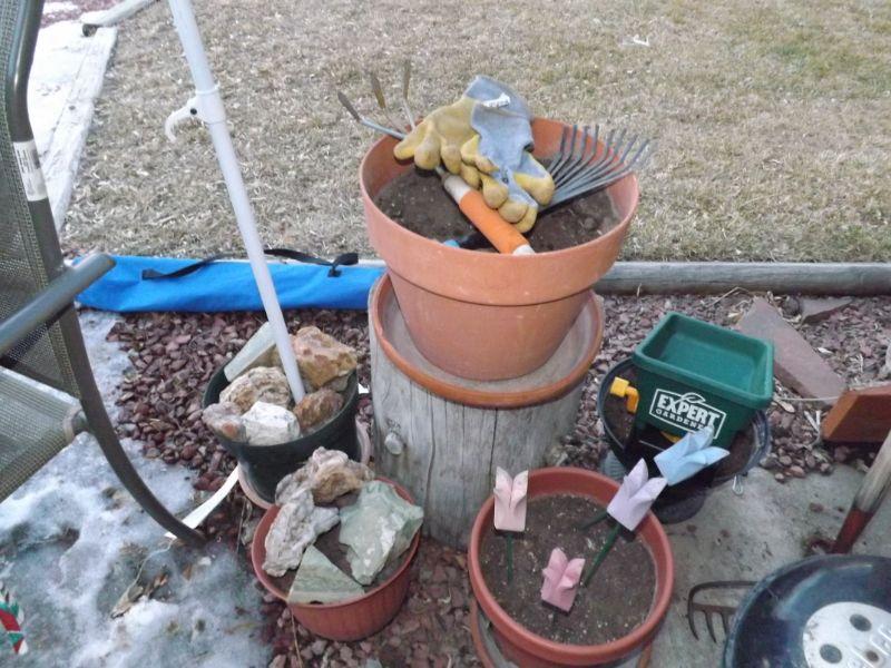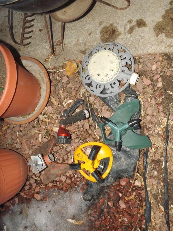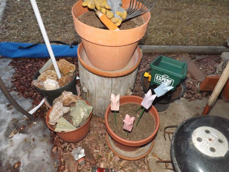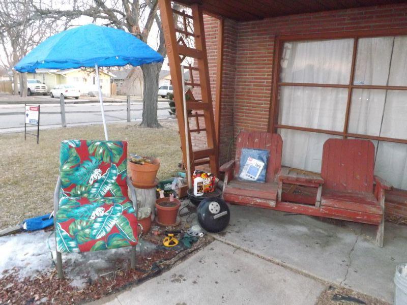 RED OUTDOOR PATIO BENCH (needs a little work) PATIO CHAIR WITH HAWAIIAN CUSHION, SEVERAL FLOWER POTS, SOME SMALL ROCKS, SPRINKLERS, WEBER CHARCOAL GRILL WITH FLUID AND COAL, NEW TARP, BLUE UMBRELLA, AND MORE