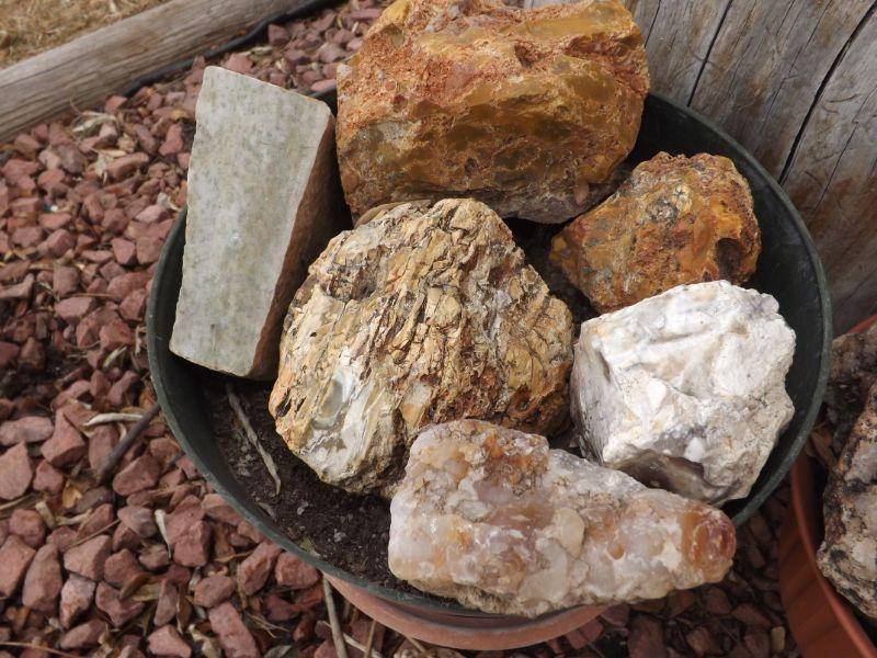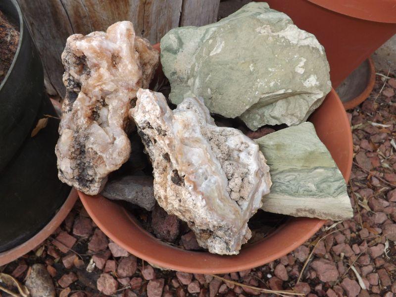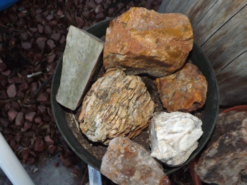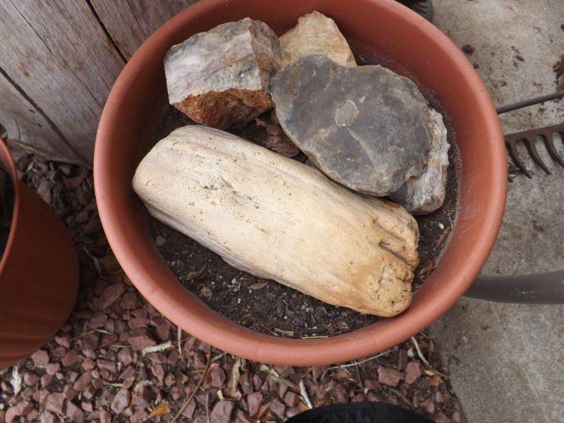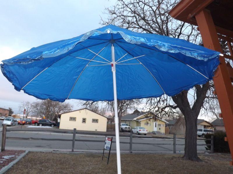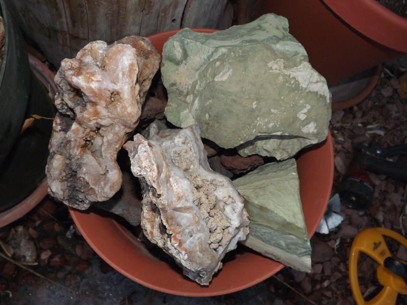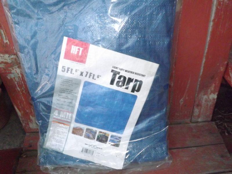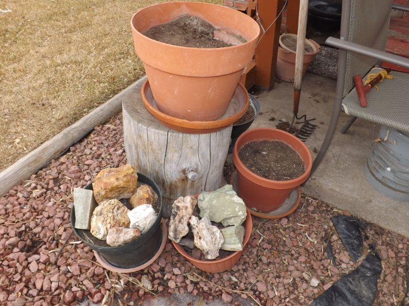 RED OUTDOOR PATIO BENCH (needs a little work) PATIO CHAIR WITH HAWAIIAN CUSHION, SEVERAL FLOWER POTS, SOME SMALL ROCKS, SPRINKLERS, WEBER CHARCOAL GRILL WITH FLUID AND COAL, NEW TARP, BLUE UMBRELLA, AND MORE