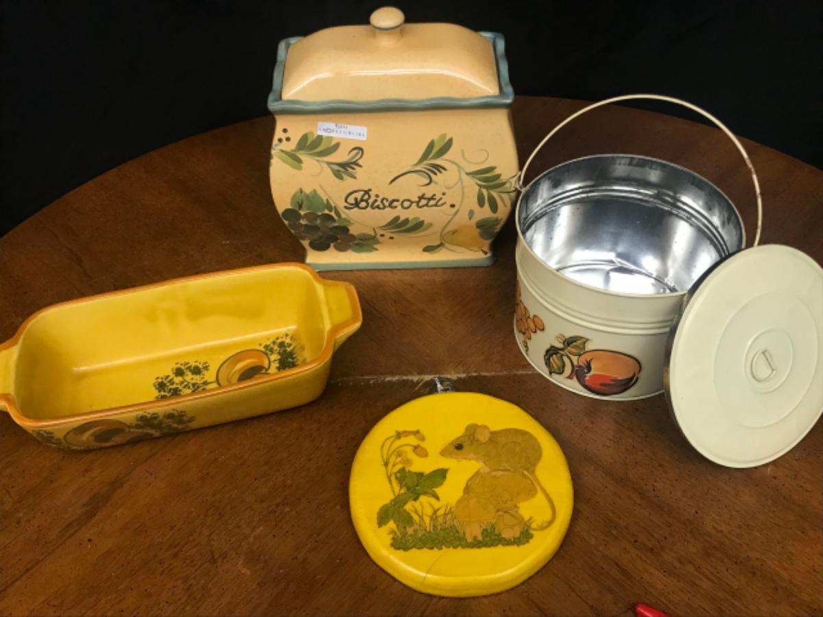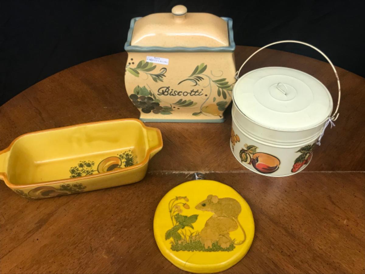 home decor:lot Biscotti cookie jar, vintage lunch pail, california pottery loaf pan, vintage mouse & mushroom hanging decor;