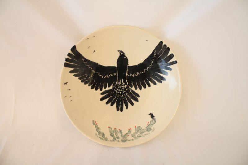 Blazek Clay Arts Flying Raven Stoneware Decorative Plate Made in ATX - A decorative painted pottery plate with a raven. Made by Blazek in Austin, Texas.