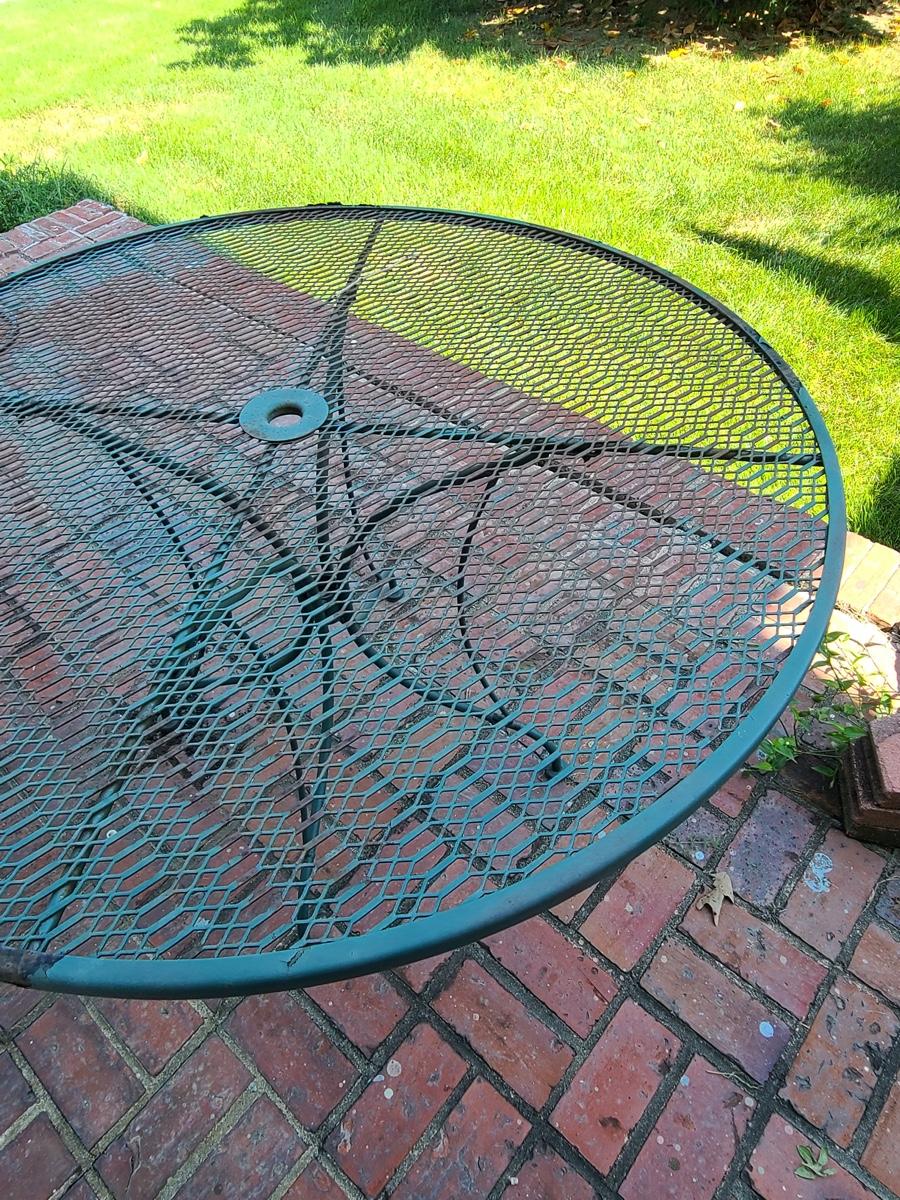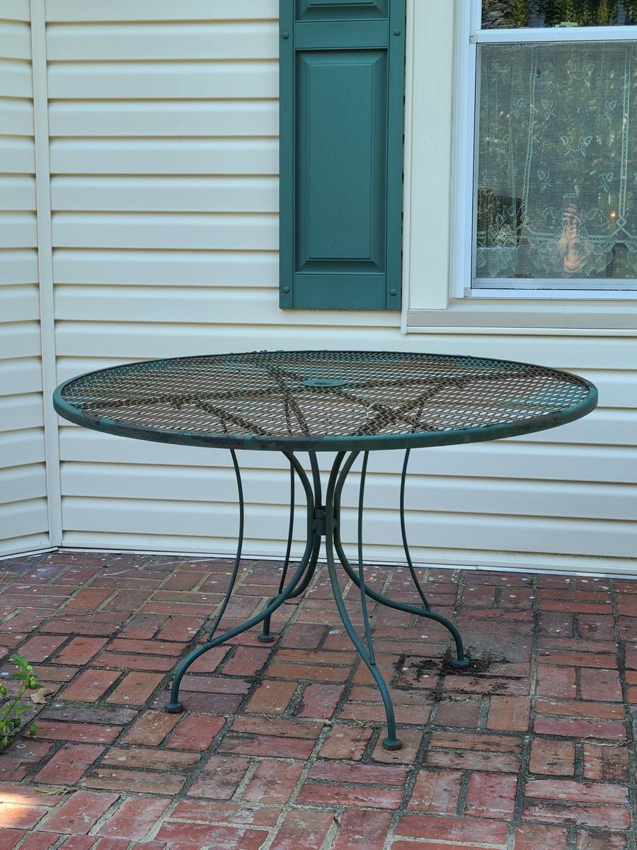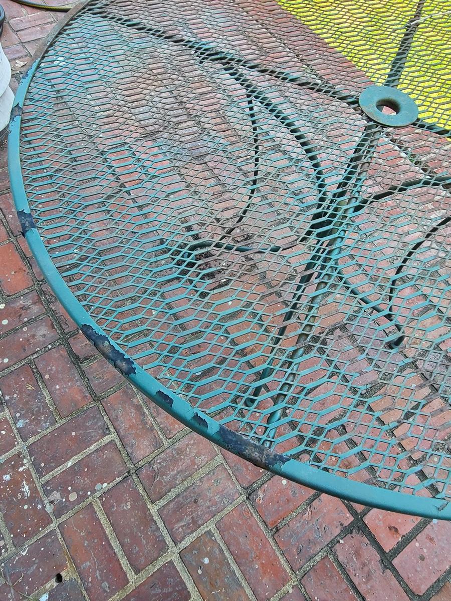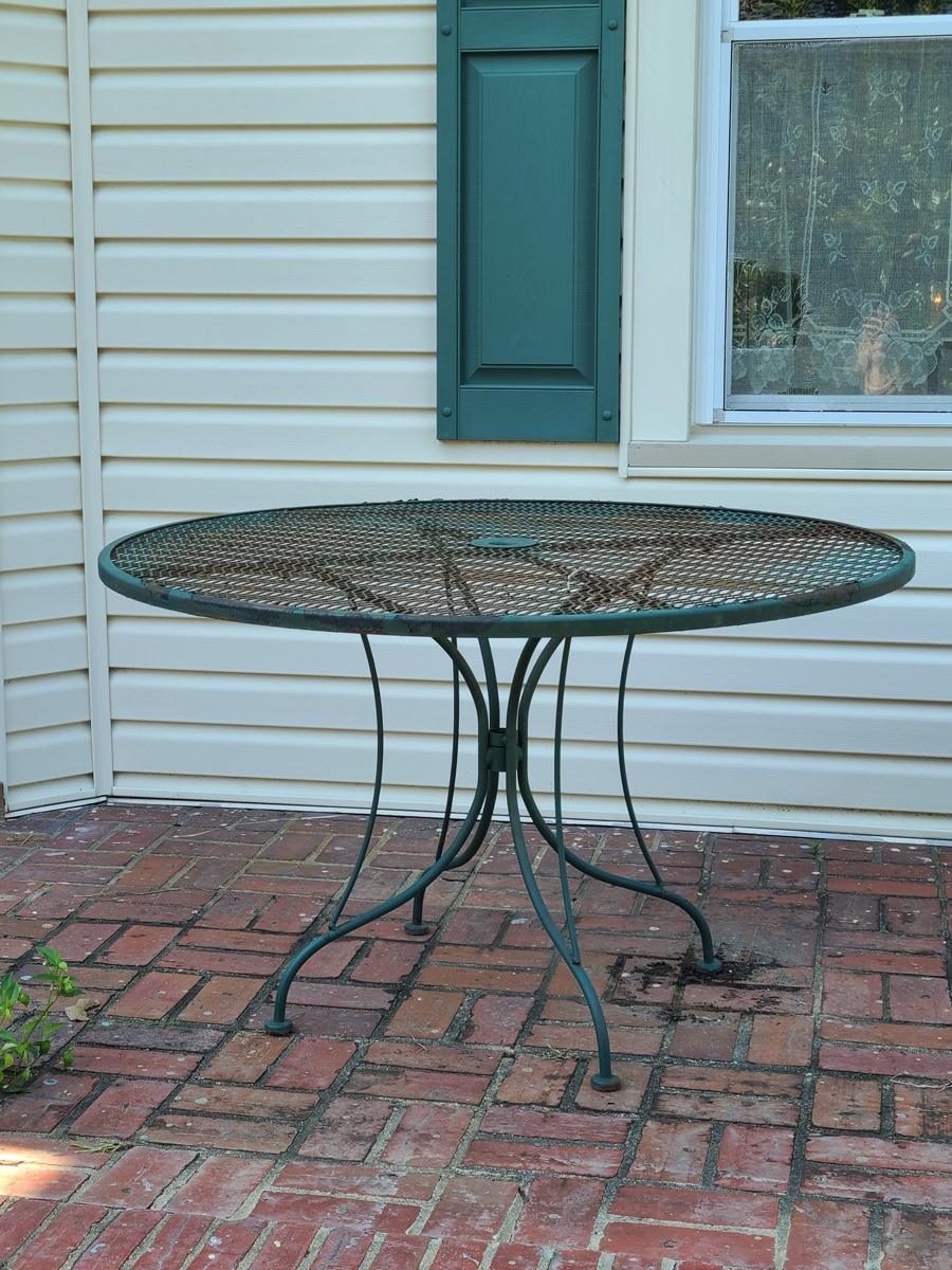 This is a solid screen top metal table that is green in color. It could use a new paint job and would look renewed!