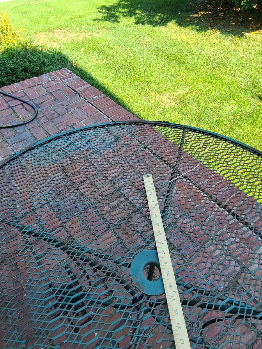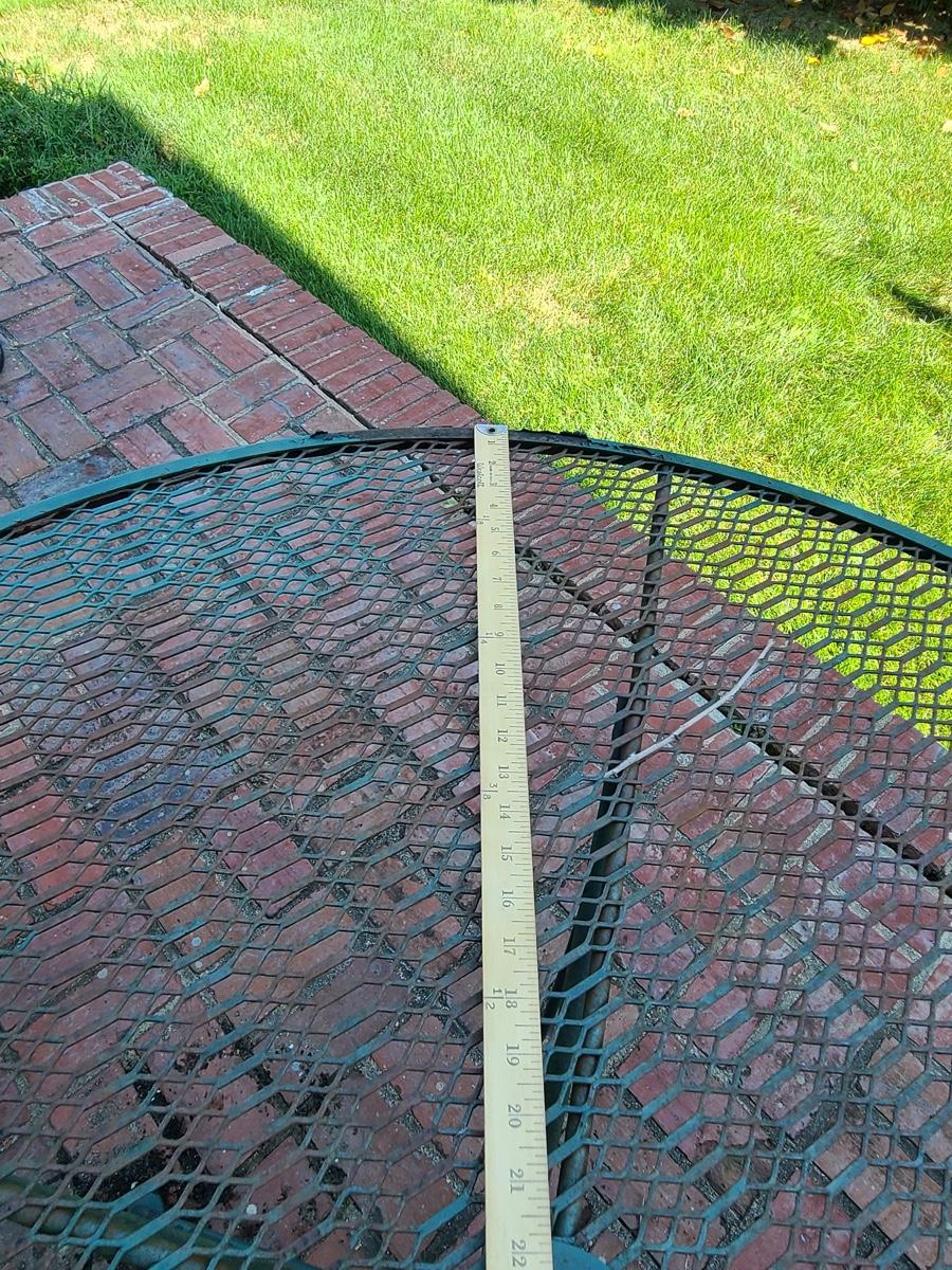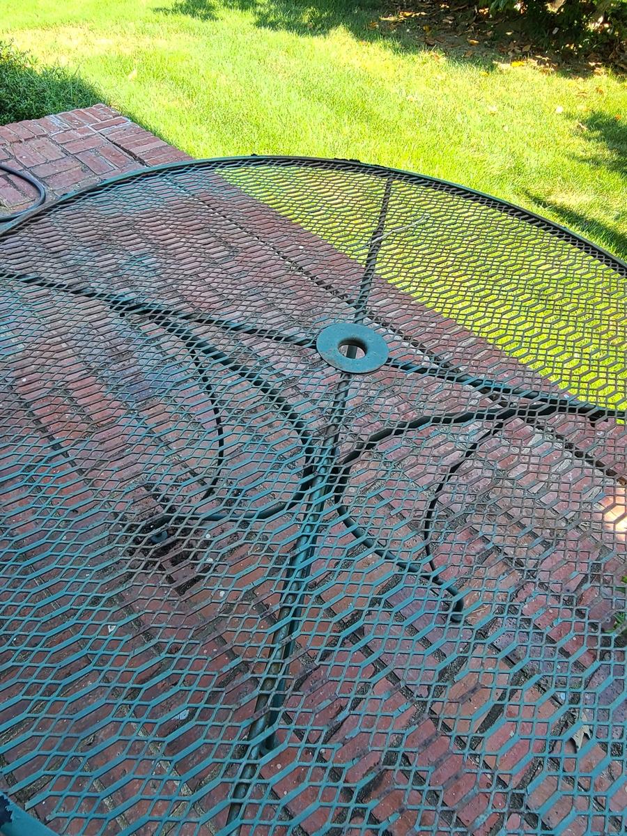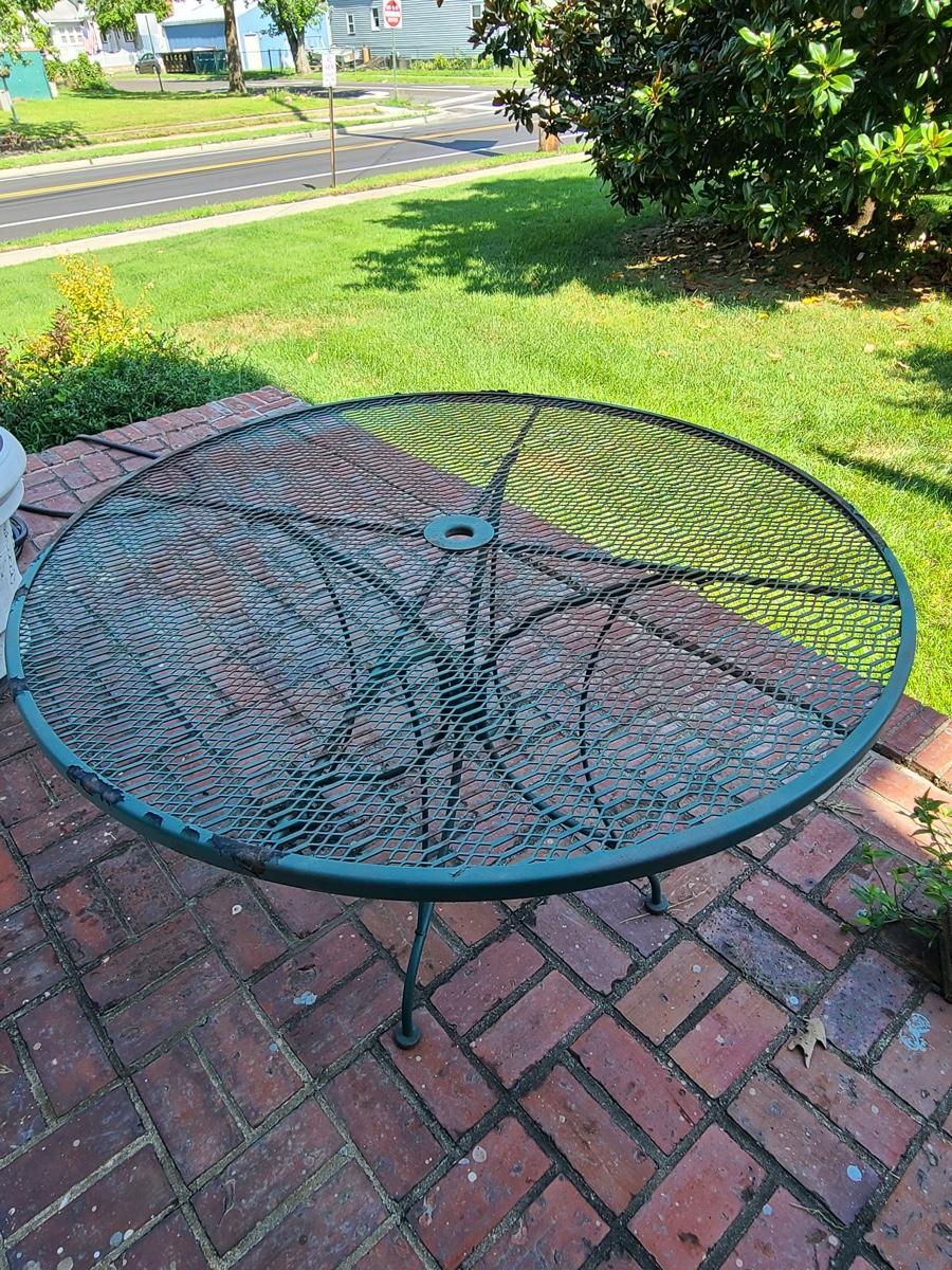 This is a solid screen top metal table that is green in color. It could use a new paint job and would look renewed!
