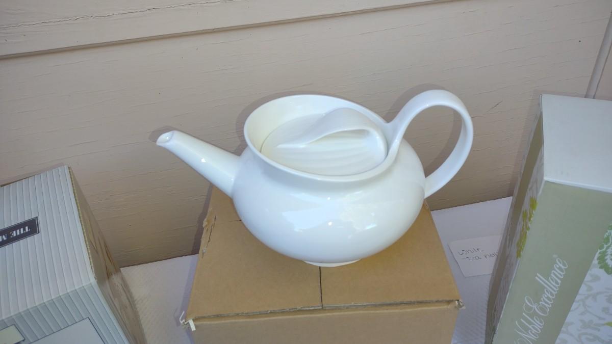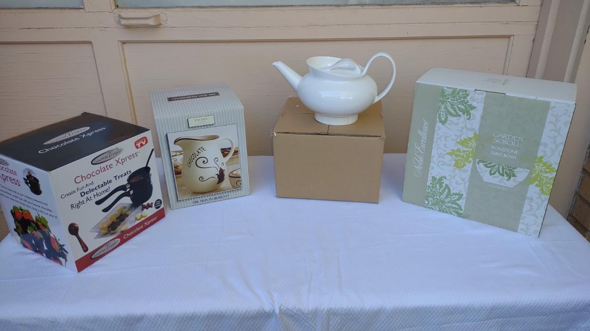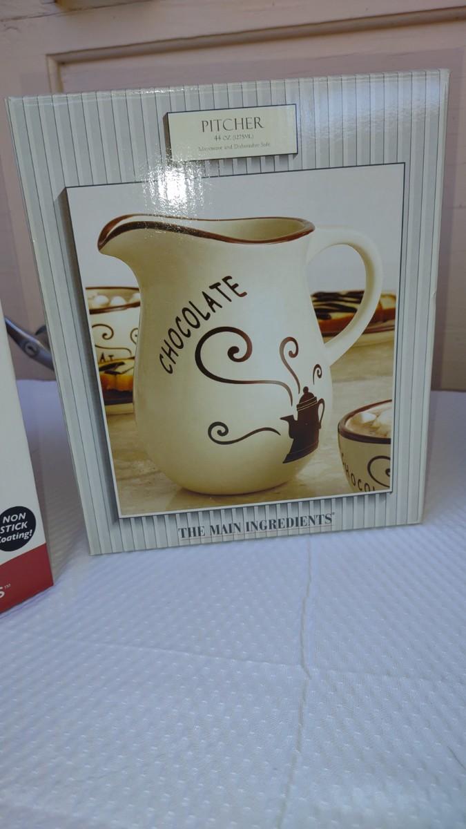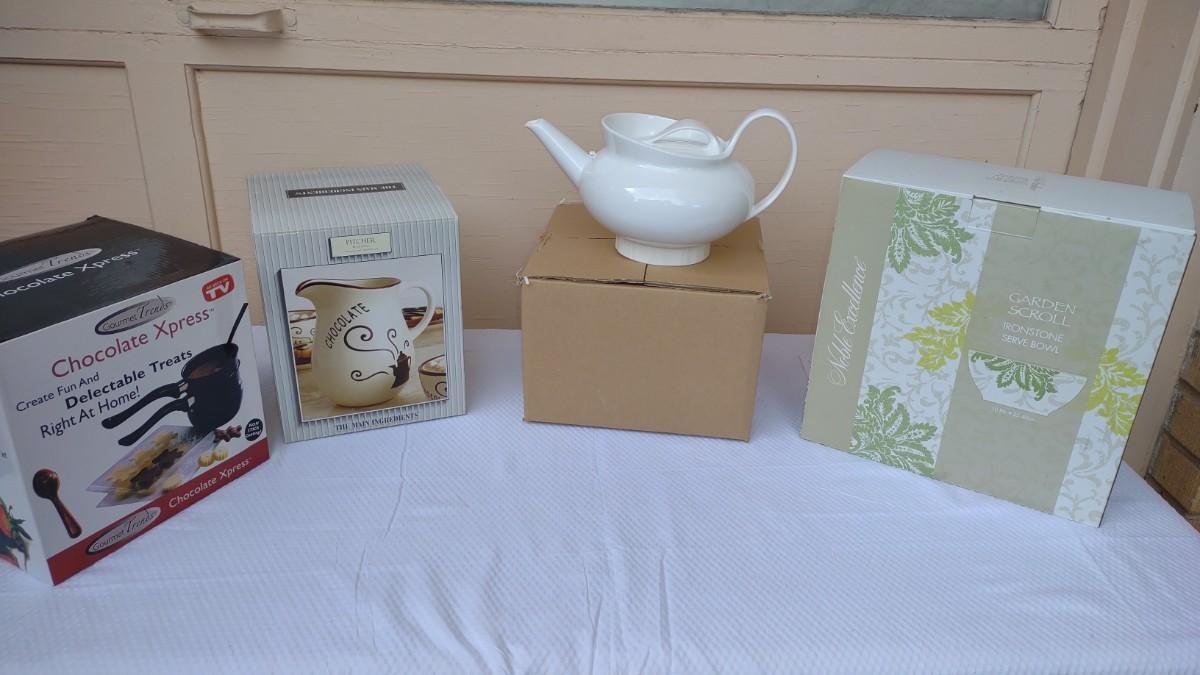 THESE ARE PERFECT ADDITION TO YOUR HOME OR EVEN FOR GIFTS FOR THE UPCOMING HOLIDAY. WHITE TEA KETTLE, CHOCOLATE XPRESS FOR CREATING DELICIOUS TREATS, IRONSTONE SERVE BOWL, AND A PITCHER.