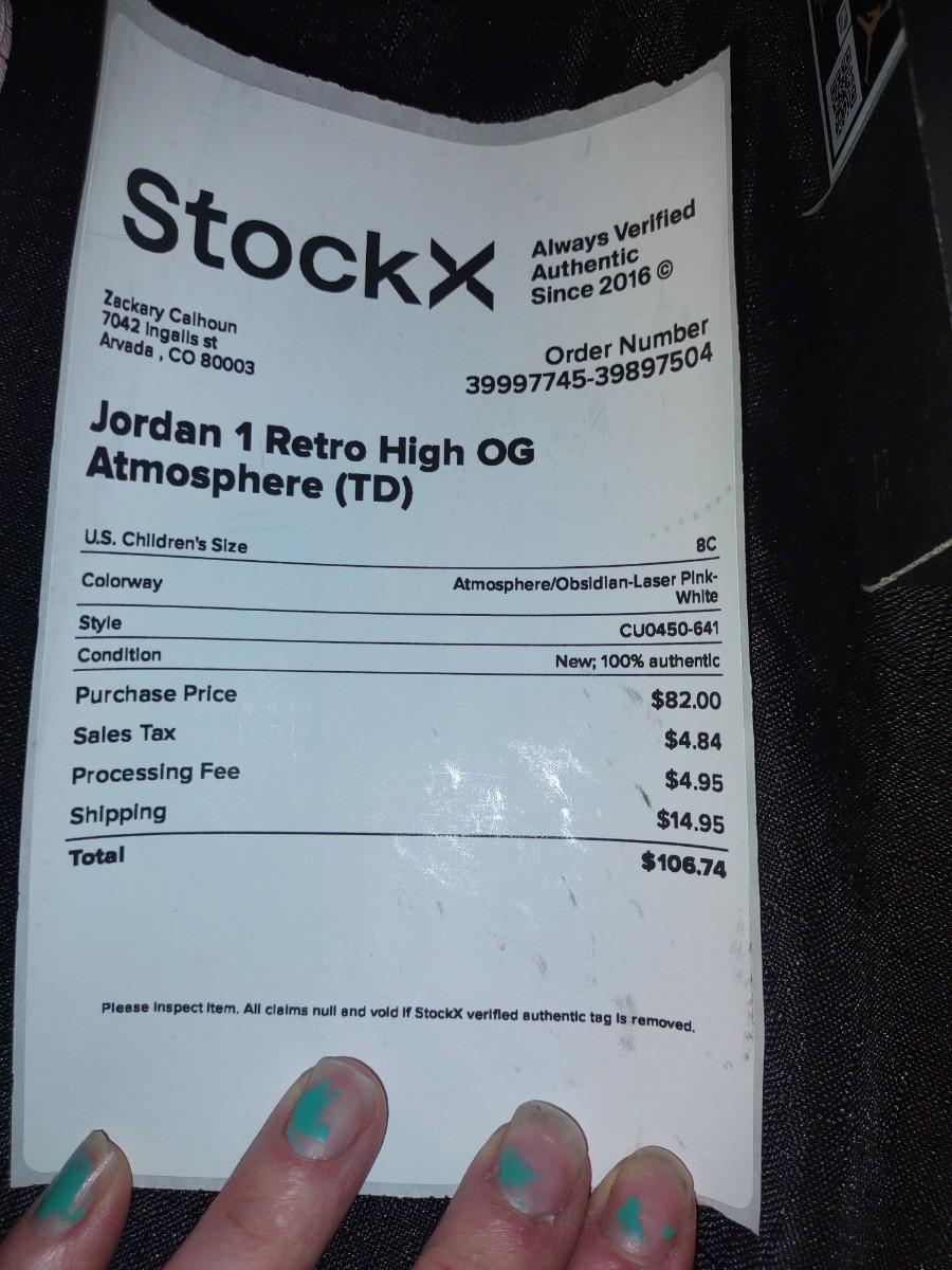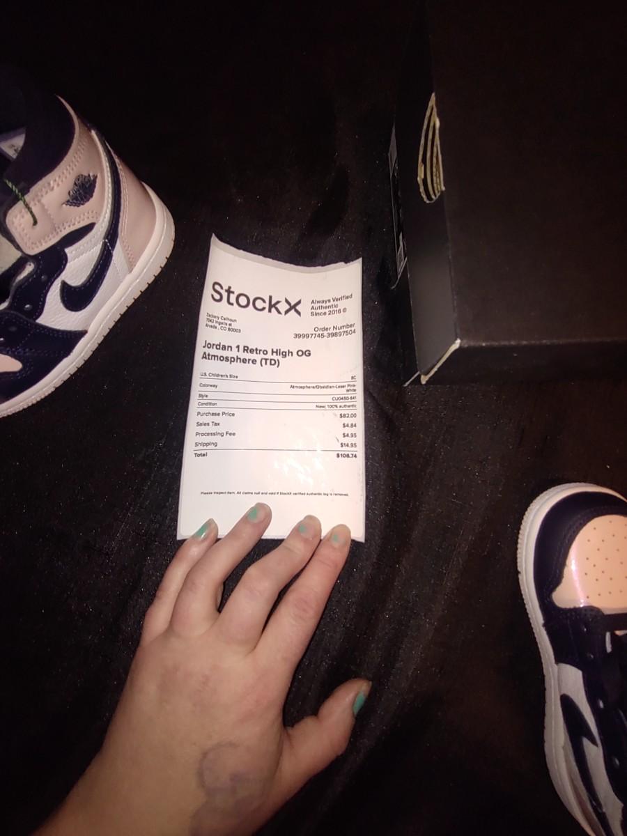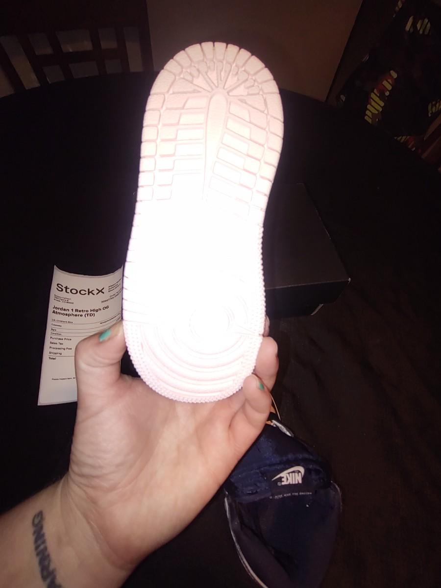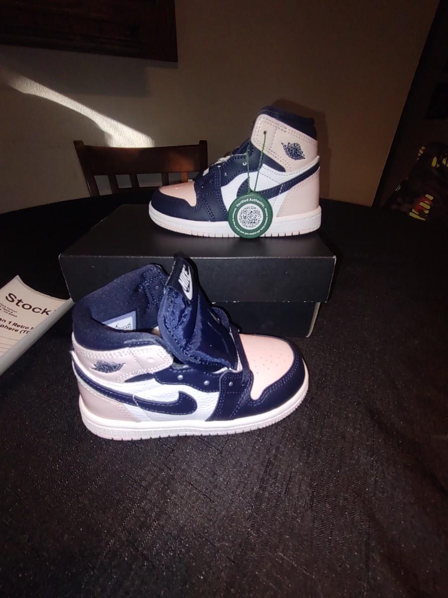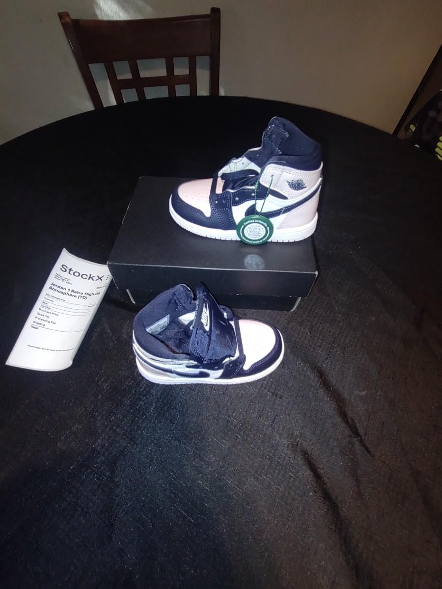 NEVER BEFORE WORN CHILDREN NIKES. JORDAN 1 RETRO HIGH OG ATMOSPHERE. SLIGHTLY PINK SIZE 8C