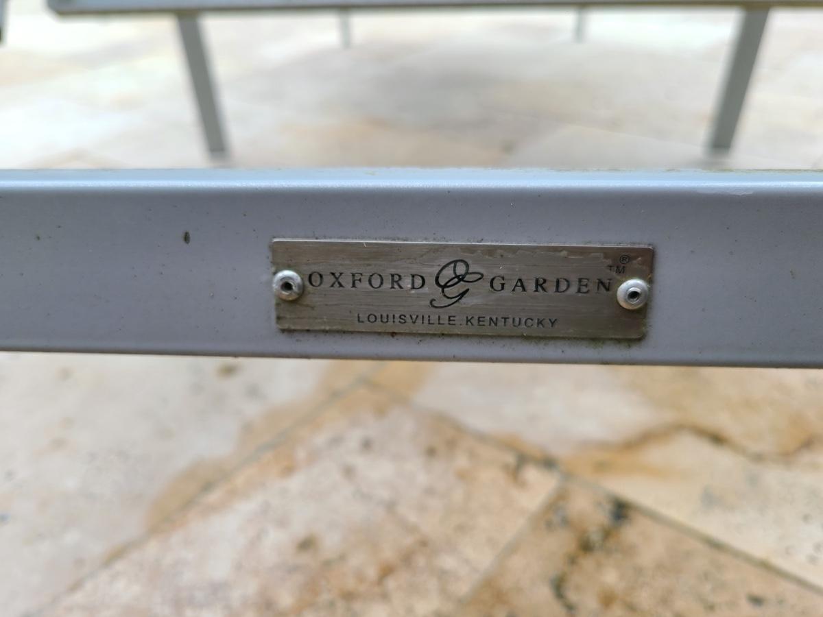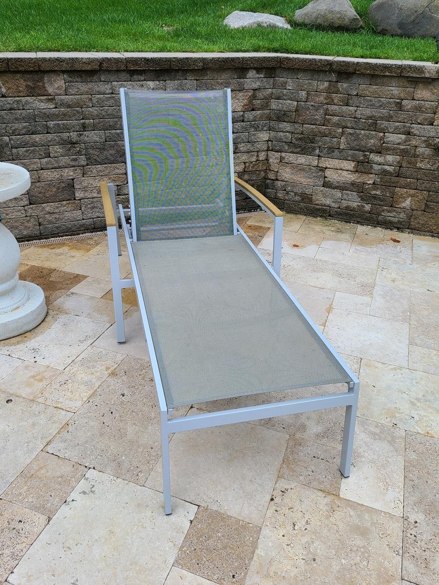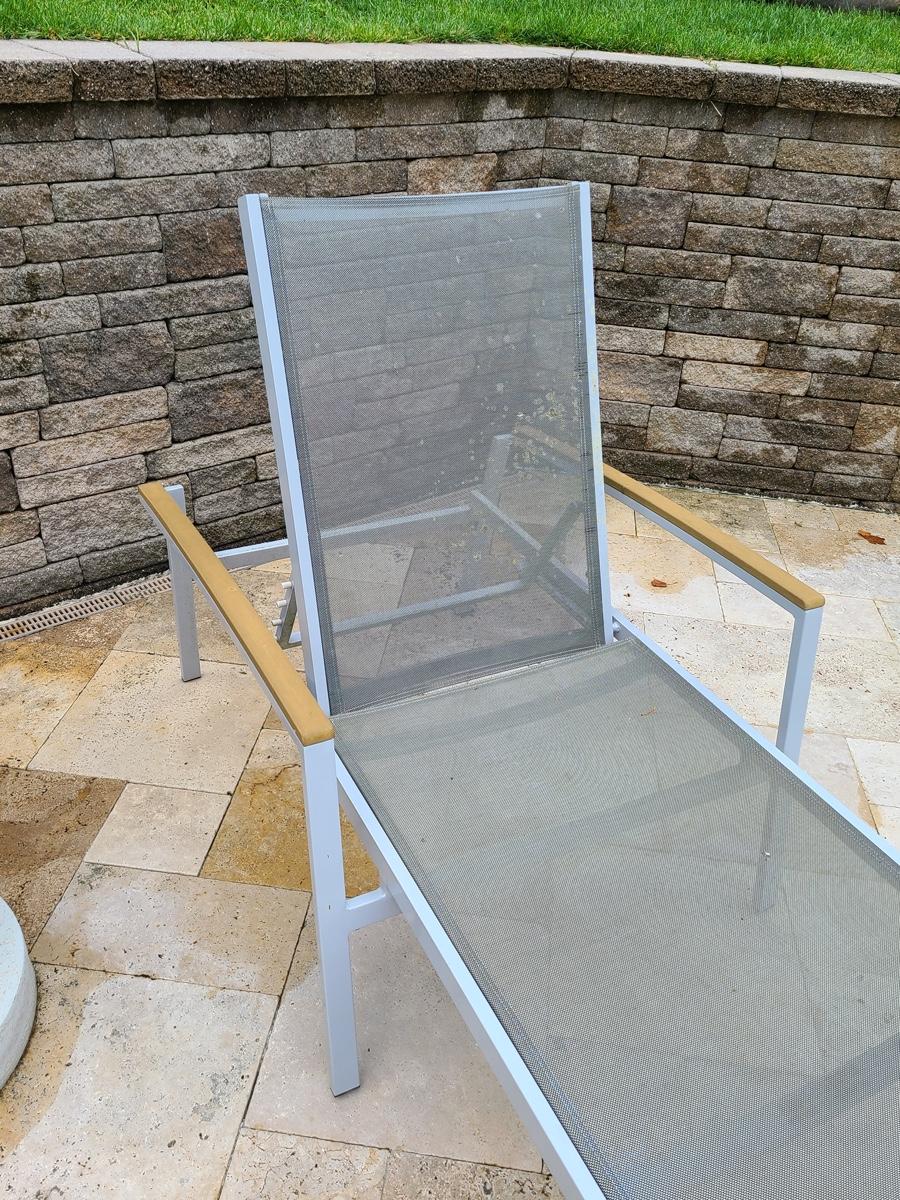 These patio chairs are part of the Travira collection from Oxford Gardens. They are made of Aluminum so they are lightweight and Tek-wood arm covers. They do show wear from being outside and could use a cleaning. They are fully functional. The table is faux concrete designed and easy to move, and is designed to be used alone or with umbrella which is included. These are located in the back yard and will need to be moved to the front. They are lightweight so easy to move!