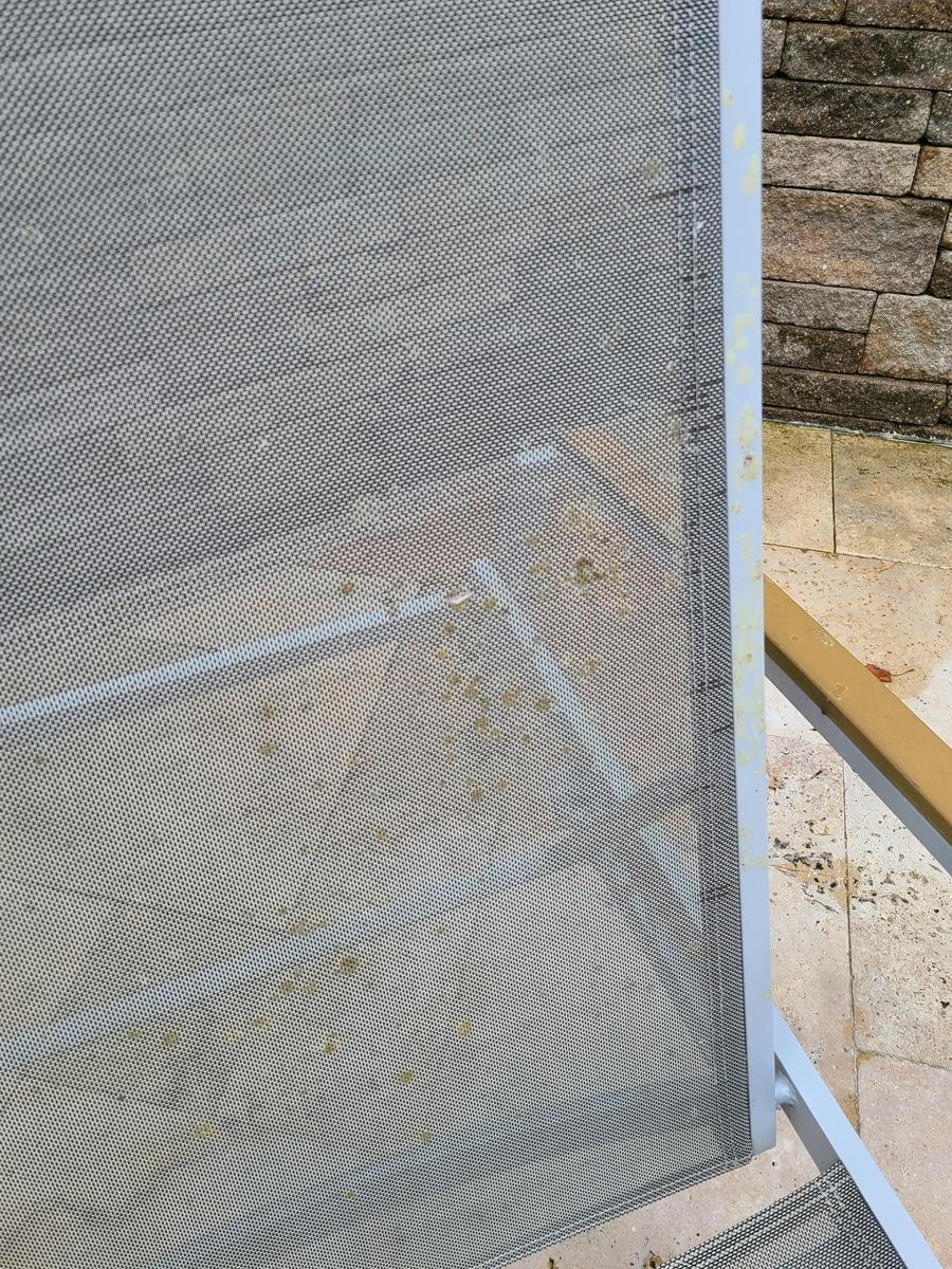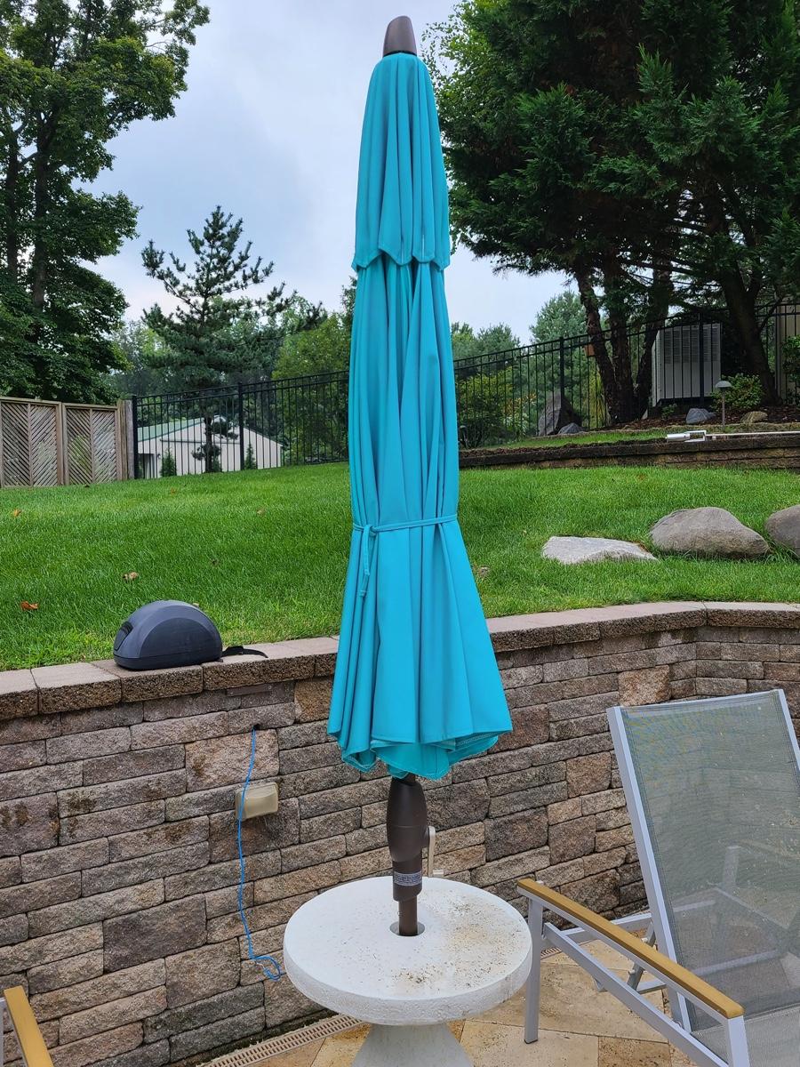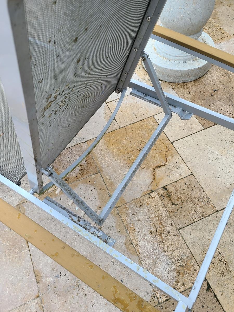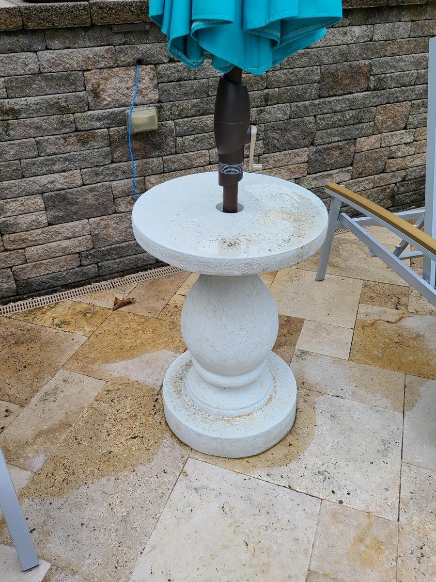 These patio chairs are part of the Travira collection from Oxford Gardens. They are made of Aluminum so they are lightweight and Tek-wood arm covers. They do show wear from being outside and could use a cleaning. They are fully functional. The table is faux concrete designed and easy to move, and is designed to be used alone or with umbrella which is included. These are located in the back yard and will need to be moved to the front. They are lightweight so easy to move!