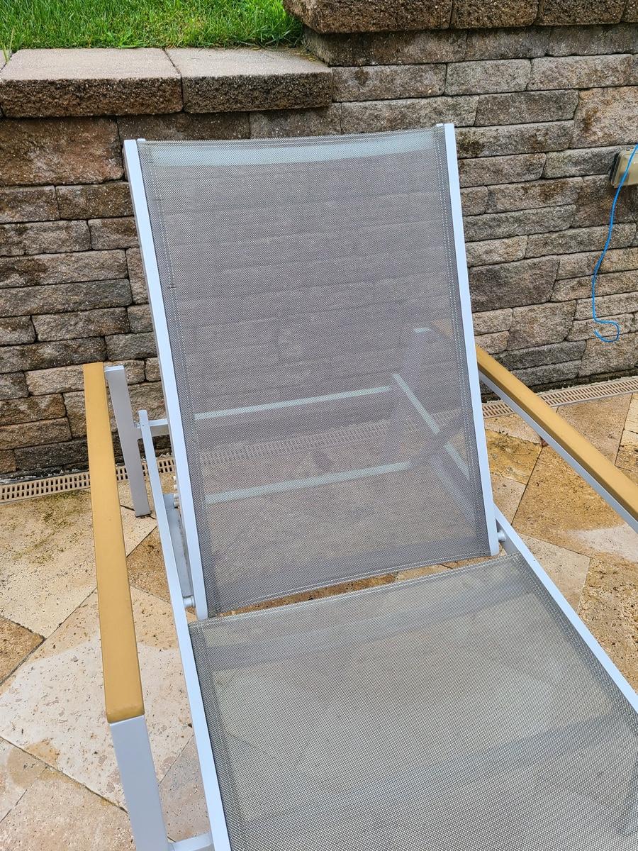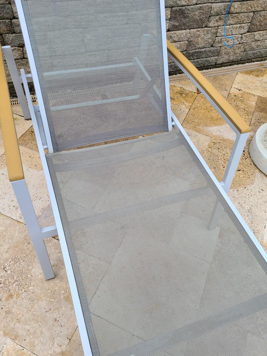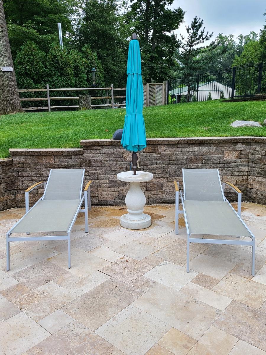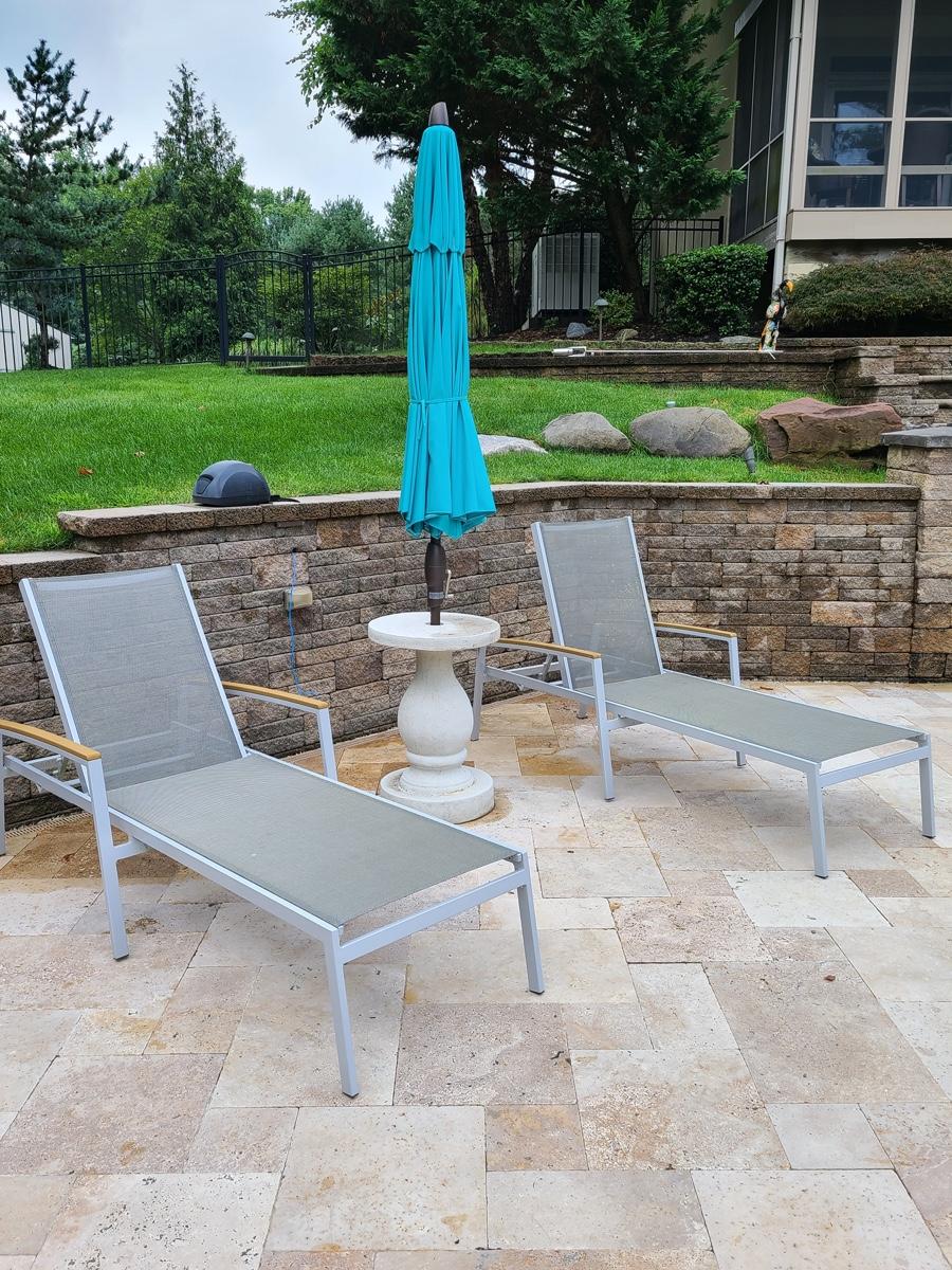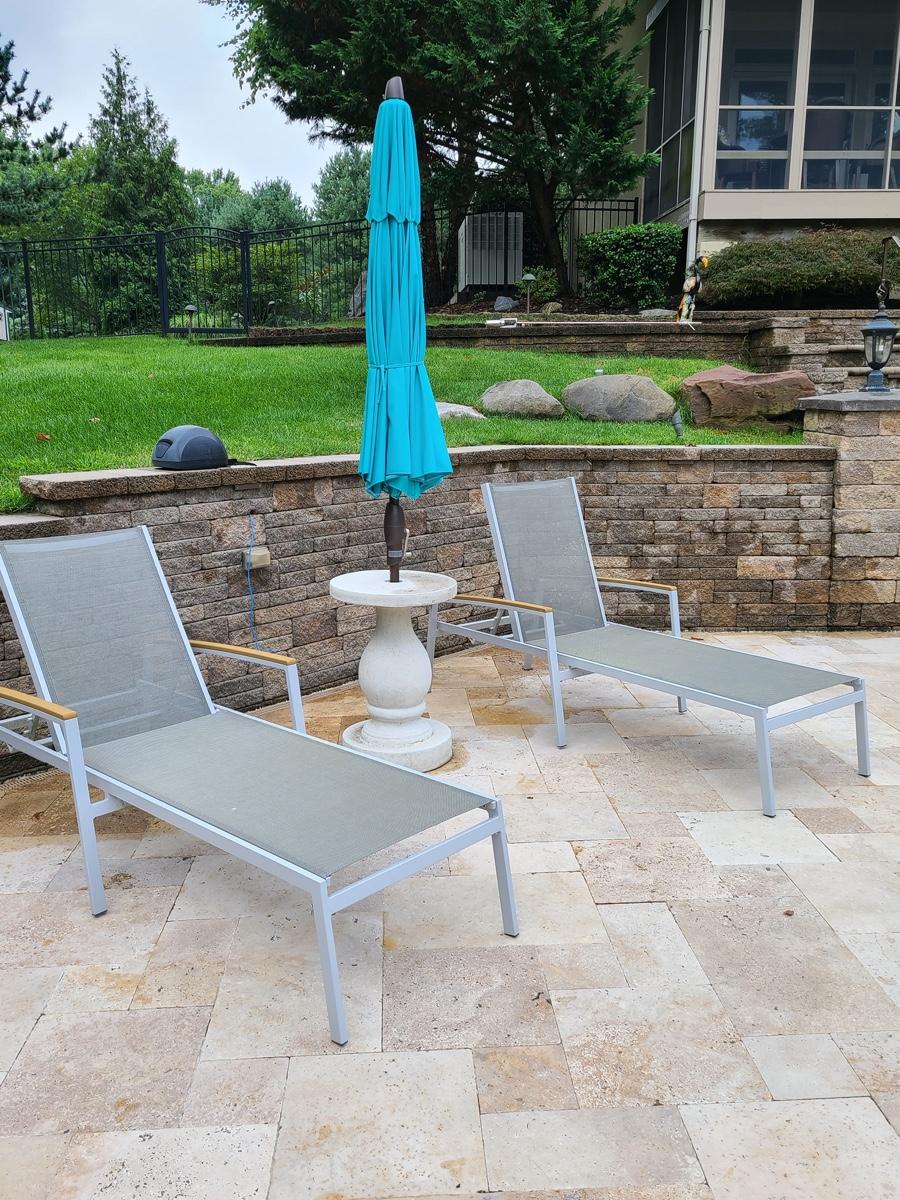 Lot BY35: Oxford Gardens "Travira Collection" Aluminum Chaise Lounge Patio Chairs with Accent Table/Umbrella