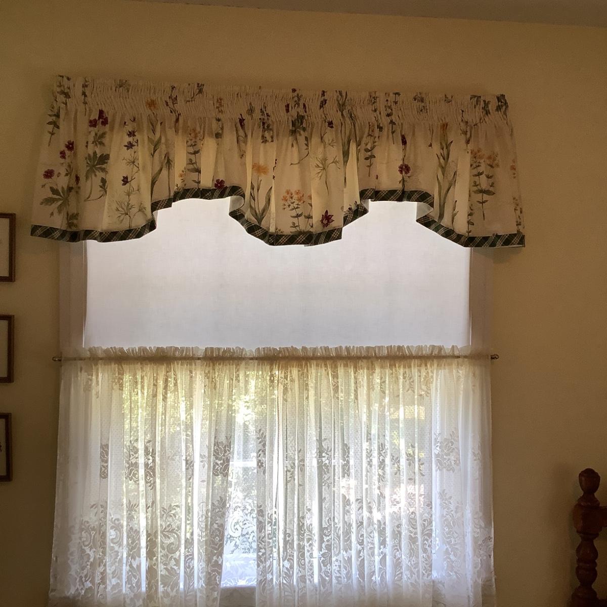 Lot C - 1128. Pair of Vintage Ethan Allen Maple Twin Beds with Custom Handmade Bedspread, Bedskirt, Pillow Shams, & Window Dressings