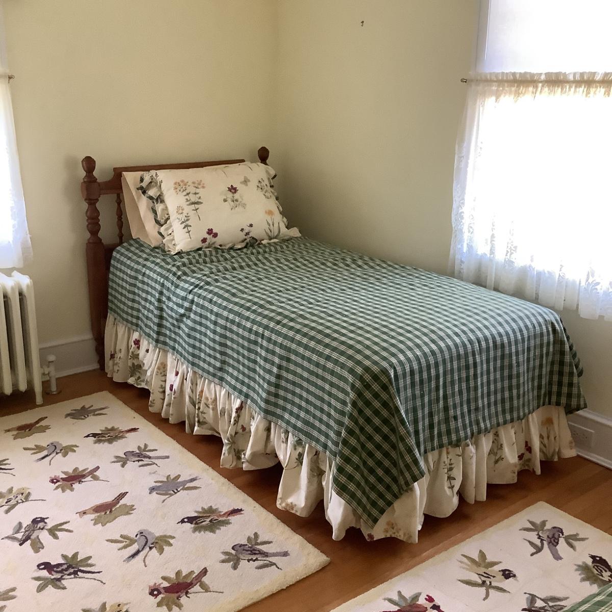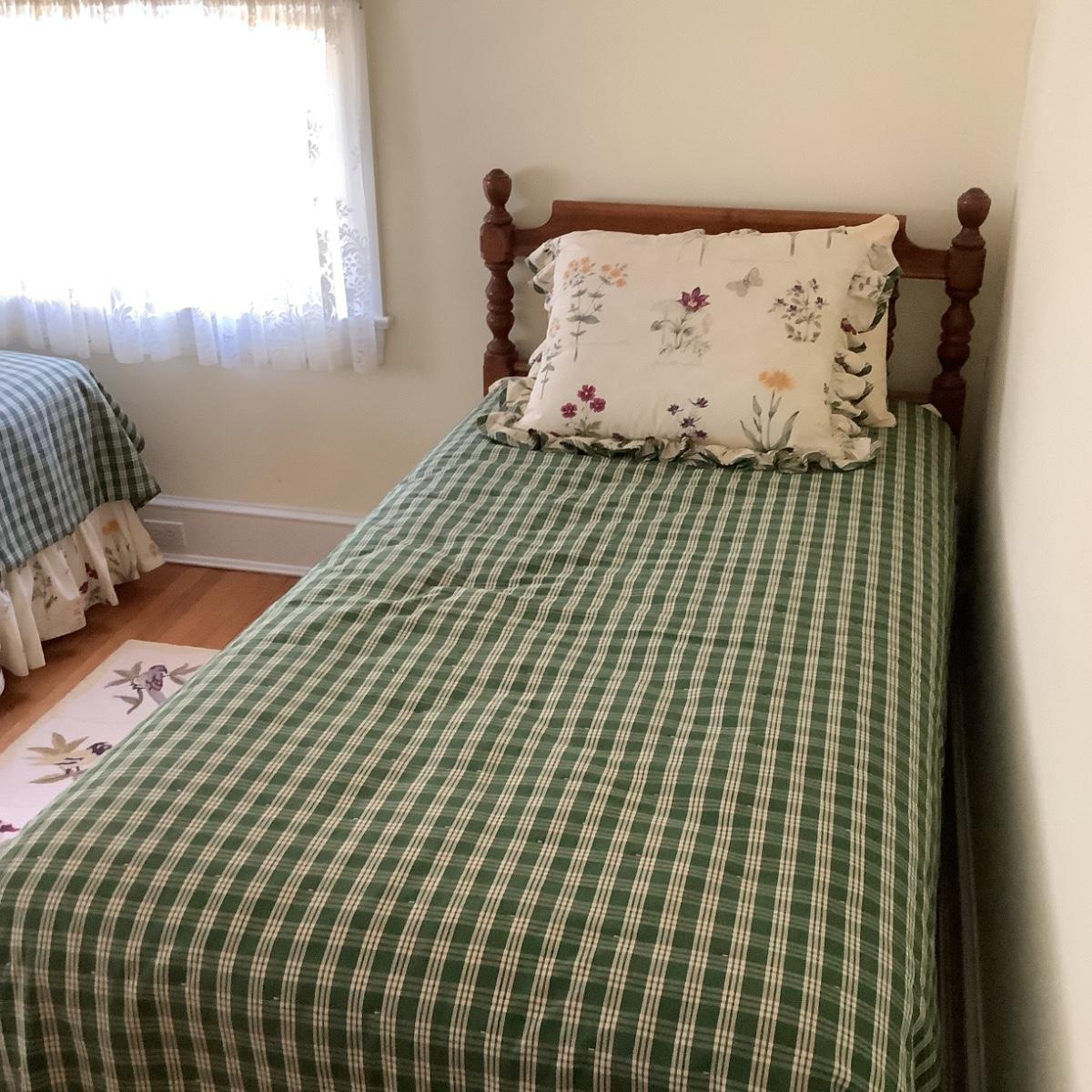 Pair of Vintage Ethan Allen Wooden Twin Beds with Custom Handmade Bedspread, Bedskirt, Pillow Shams, & Window Dressings
