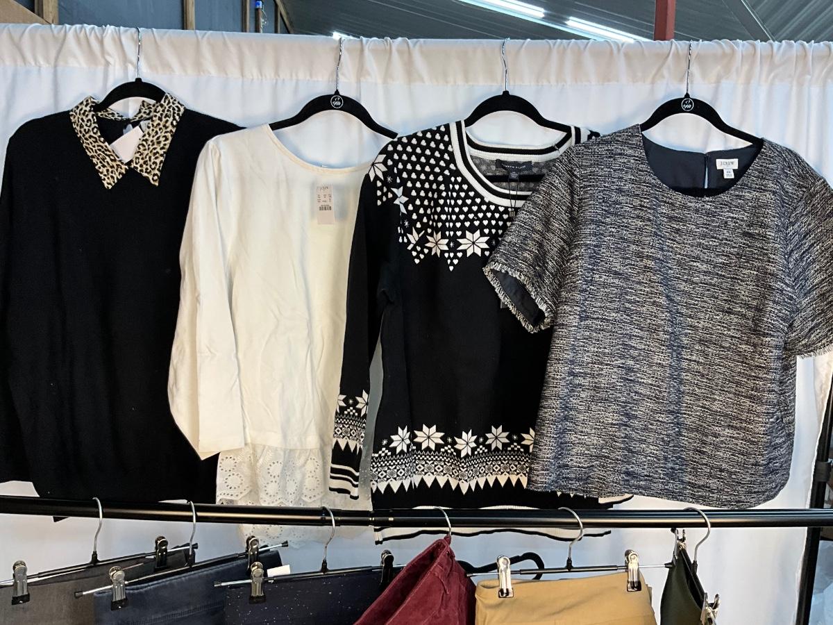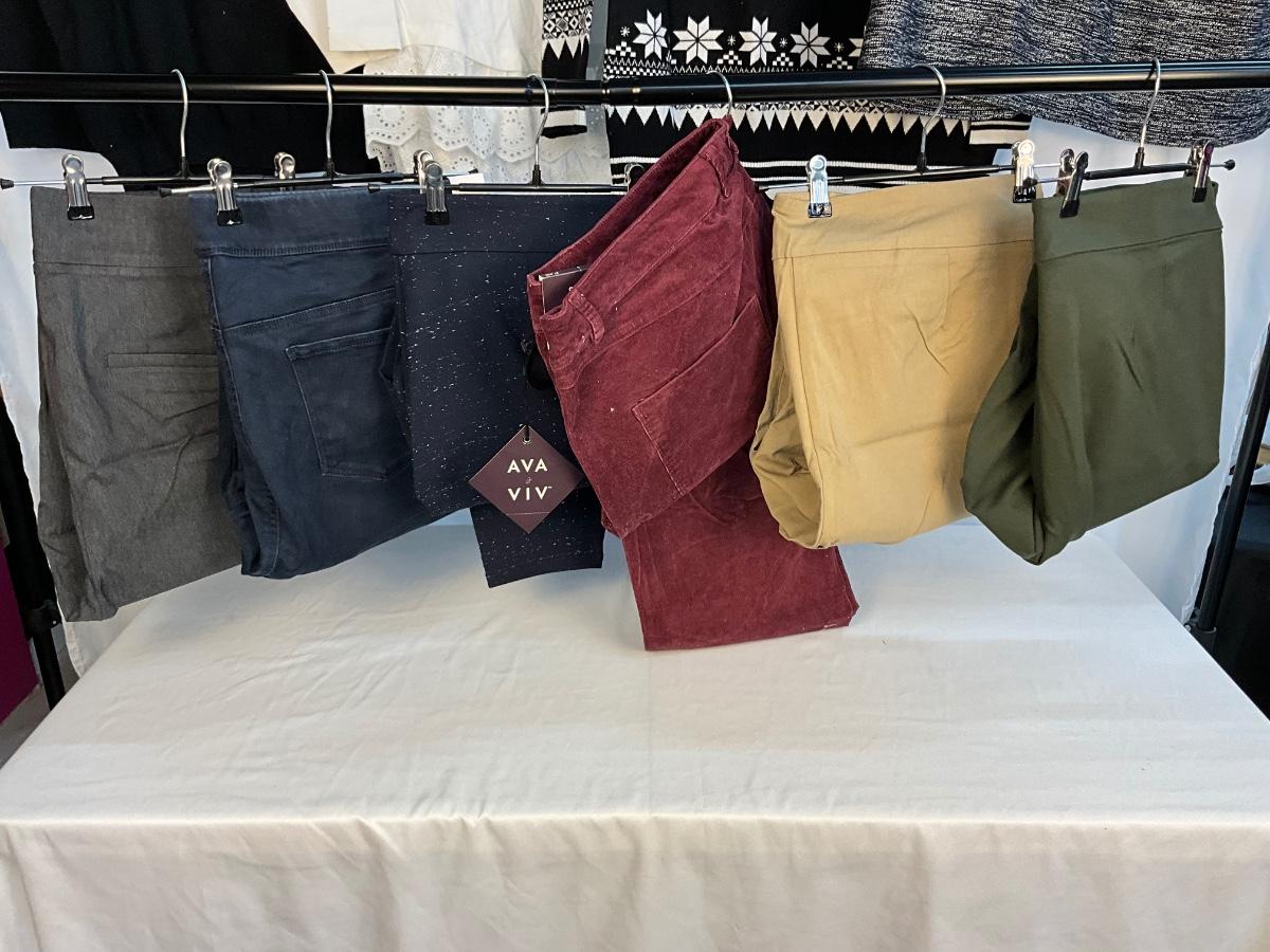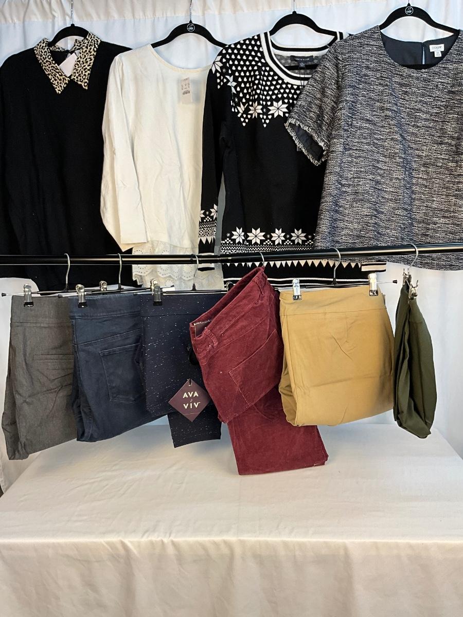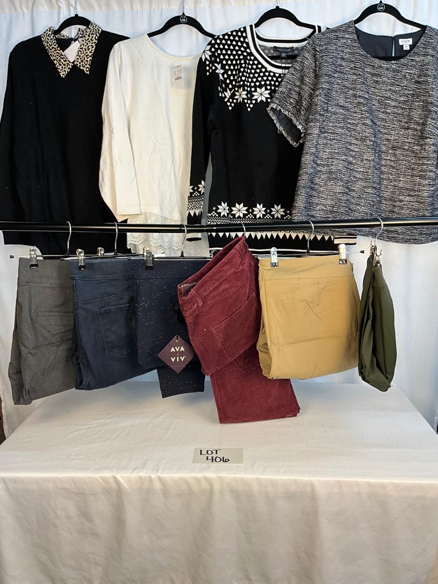 This lot contains 6 pair of pants, and 4 tops, The tops are XXL and the pants are a size 20. Brands included in this lot J. Crew, Tommy Hilfiger, Ava & Viv, Gloria Vanderbilt, Mercantile and Loft. Most items are new with tags.