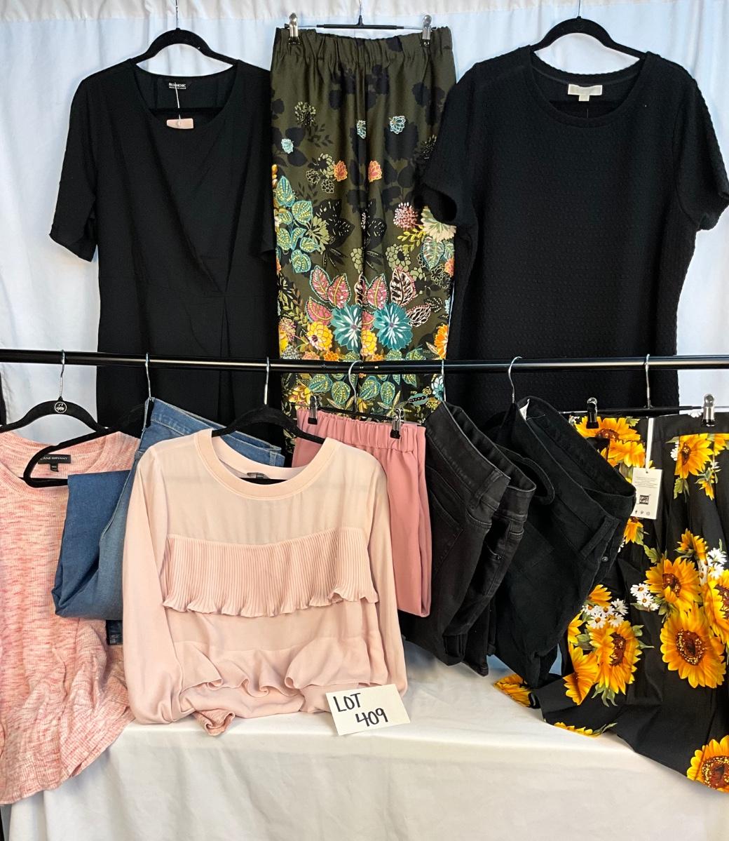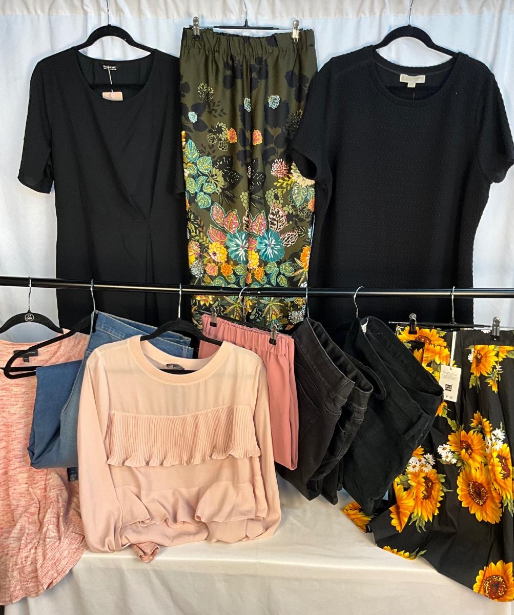 This lot contains dresses, palazzo pants, tops, jeans in sizes XXL/18-20. Most items are new with tags. Brands included in this lot are Michael KORS, Lane Bryant, Bloom Chic, Ava & Viv and J. Crew.