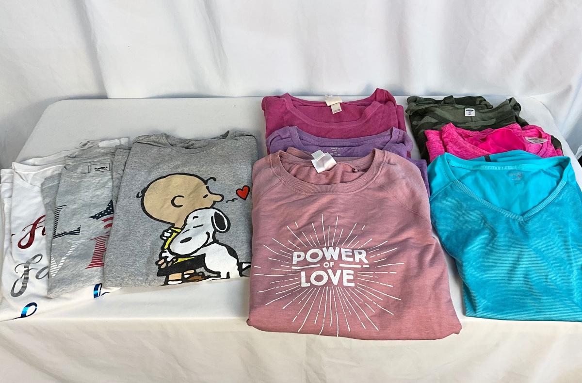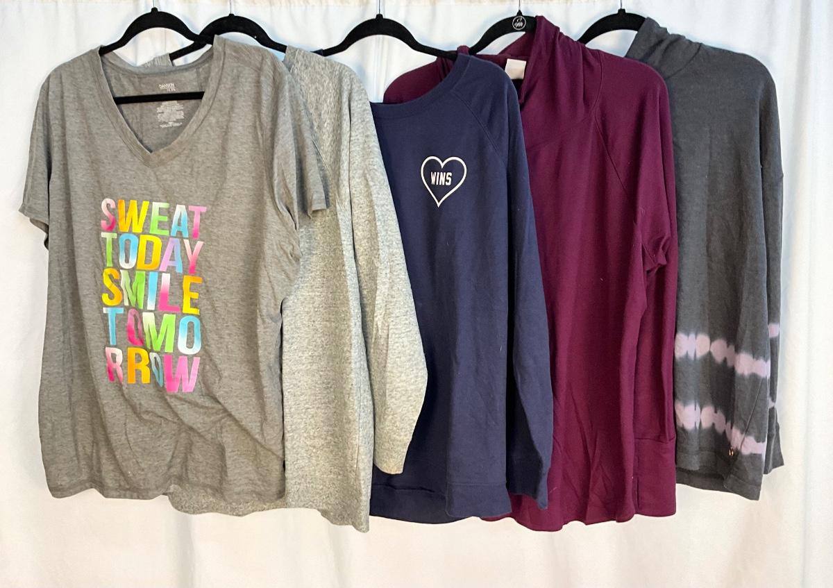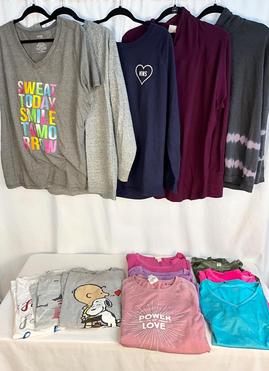 The lot contains lots of T-shirts, tops and sweatshirts. The brands included are Danskin, Old Navy, Mossimo, Sonoma and more.