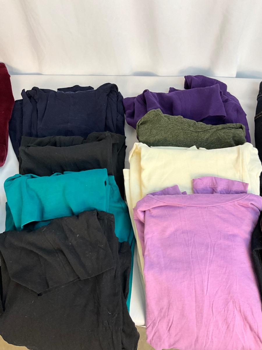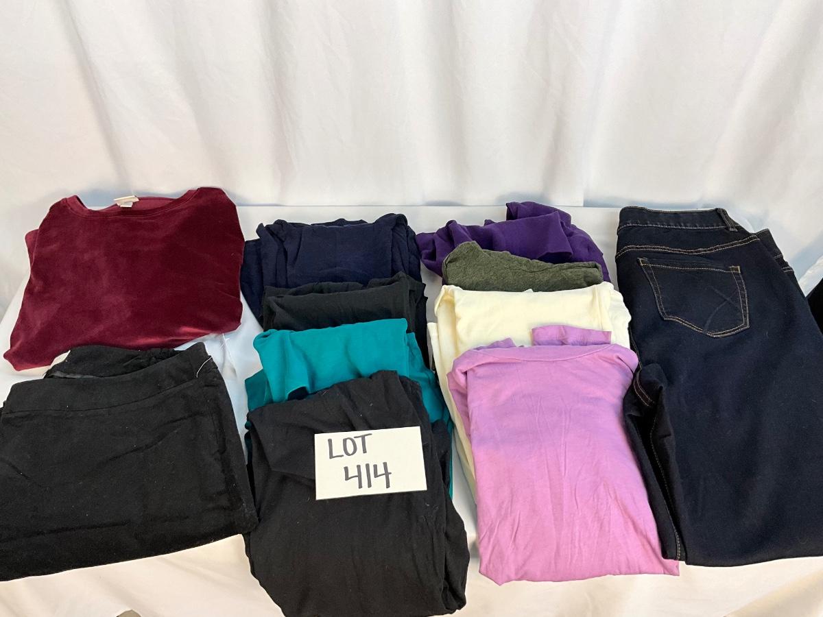 The lot contains 8 turtlenecks that are xl, velour top, Jeans (18) and pants. Brands included are J. Crew, Charter CLub, Lane Bryant and more. Most items are new with tags.