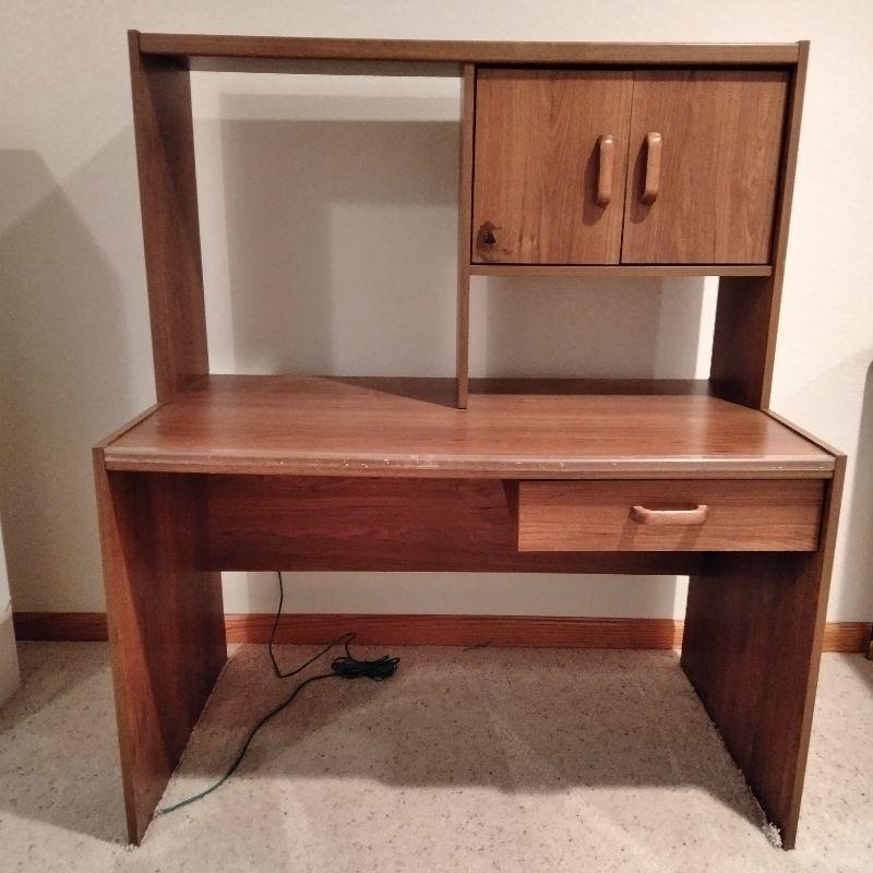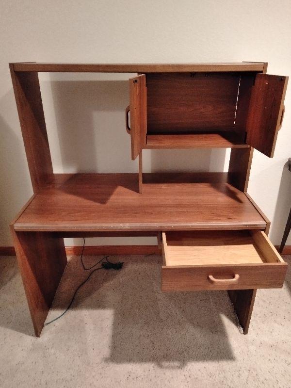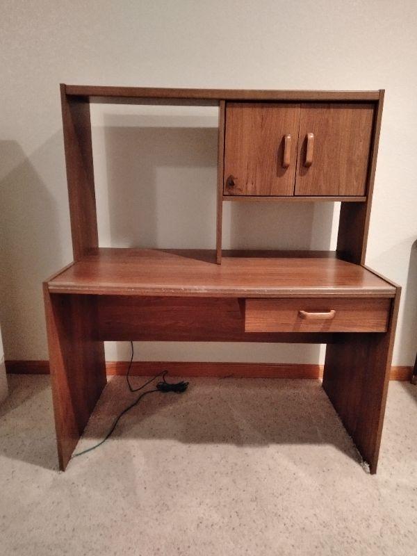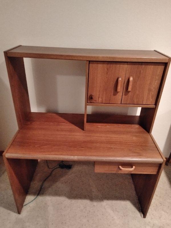 DESK WITH STORAGE CUPBOARD AND DRAWER. 50" X 43" X 24" 27" DESK TOP HEIGHT.