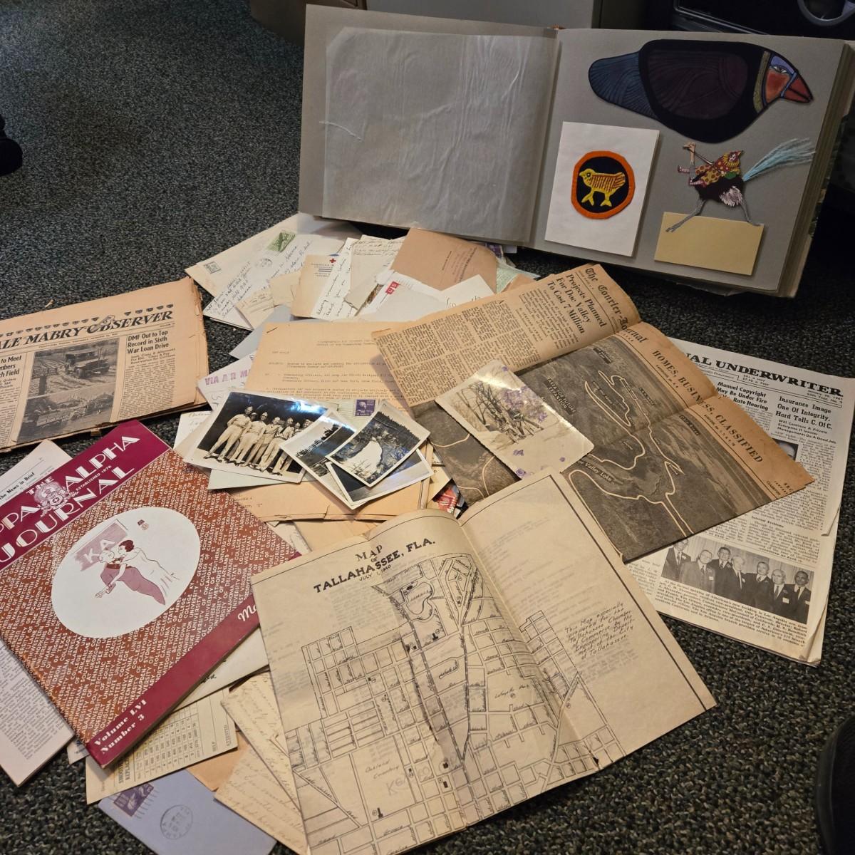 This auction lot is for WWII Ephemera - Lot C. This lot is a grouping of miscellaneous items from the same collection as other offerings in this auction. It includes old letters, newspapers, some war photos, 1940 Kappa Alpha Journal, an old map of Tallahassee, Florida which is not in good shape and a scrap book that dates 1985 - 1988, This is one very interesting grouping. Buy it and see.