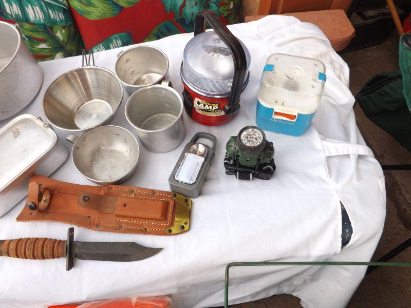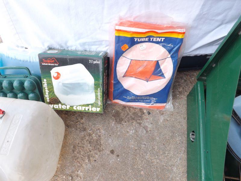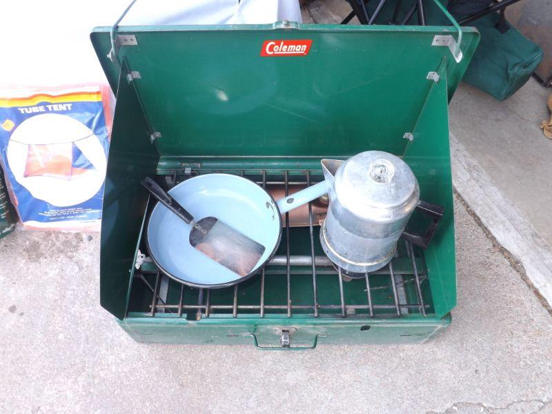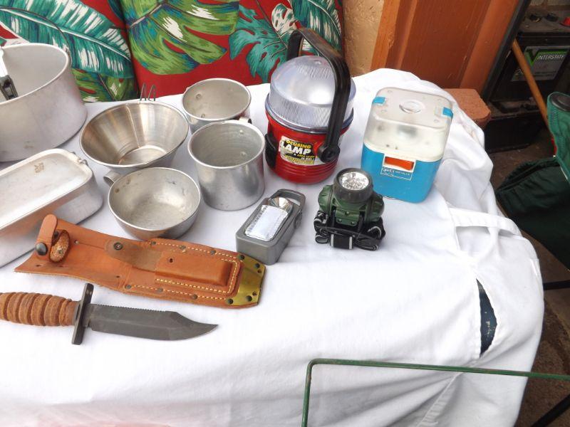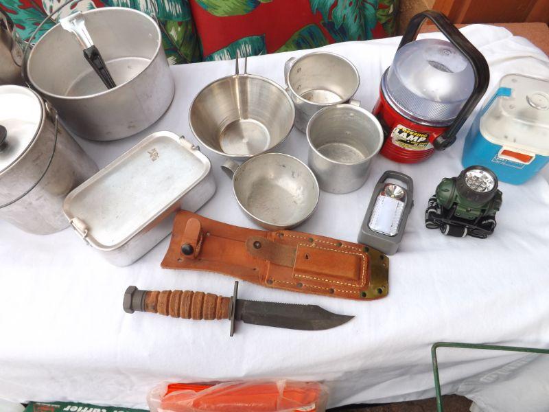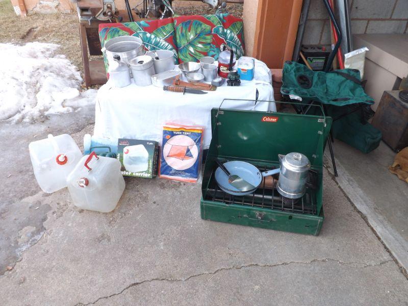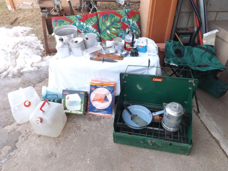 LARGE LOT OF CAMPING ITEMS, COLEMAN STOVE, COFFEE POT, FRYING PAN, ASSORTMENT OF OTHER POTS & PANS, WATER JUGS, TENT, KNIFE WITH SHEATH, FOLD UP NYLON CAMP TABLE / SEAT, FLASHLIGHTS, AND MORE