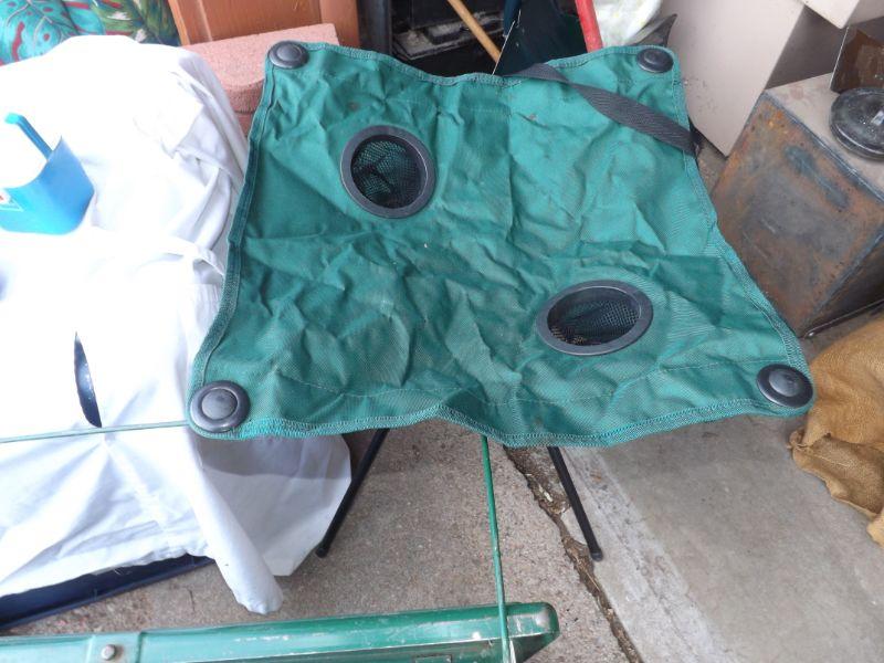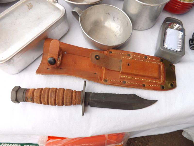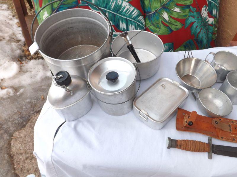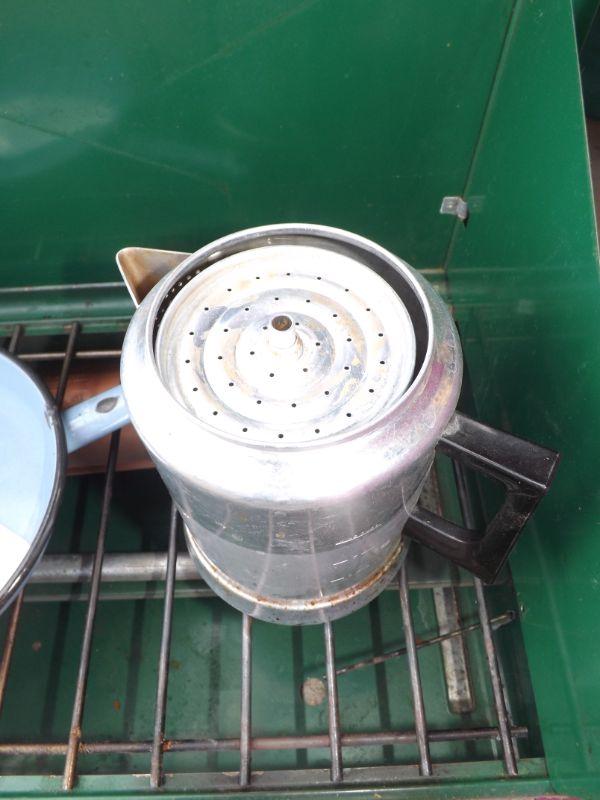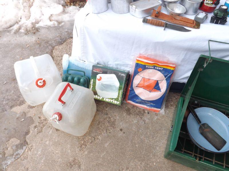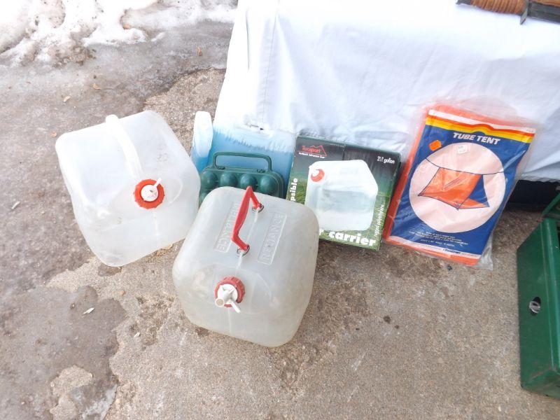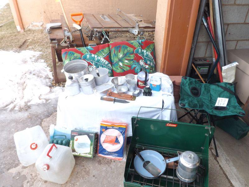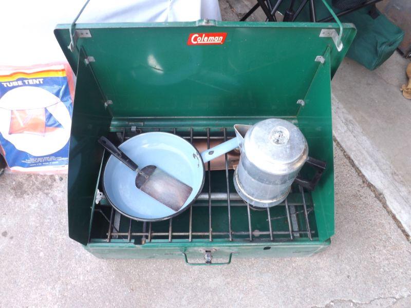 LARGE LOT OF CAMPING ITEMS, COLEMAN STOVE, COFFEE POT, FRYING PAN, ASSORTMENT OF OTHER POTS & PANS, WATER JUGS, TENT, KNIFE WITH SHEATH, FOLD UP NYLON CAMP TABLE / SEAT, FLASHLIGHTS, AND MORE