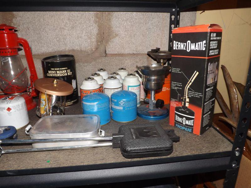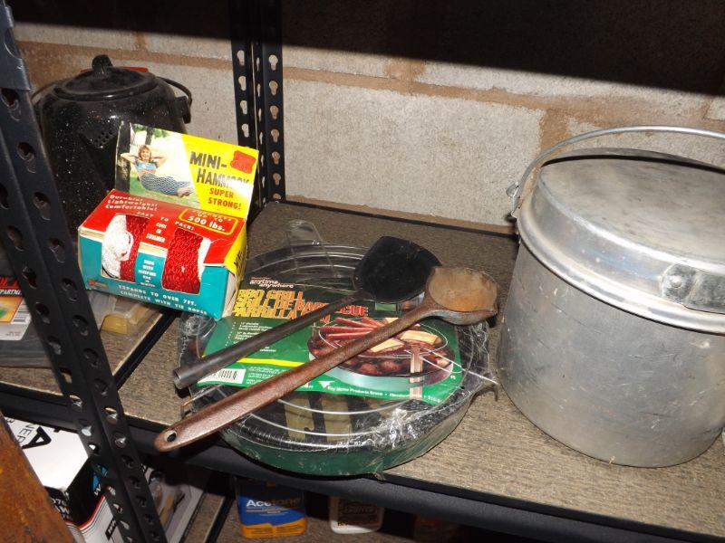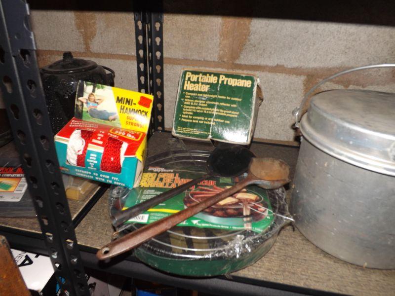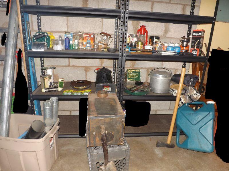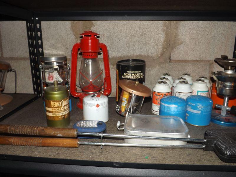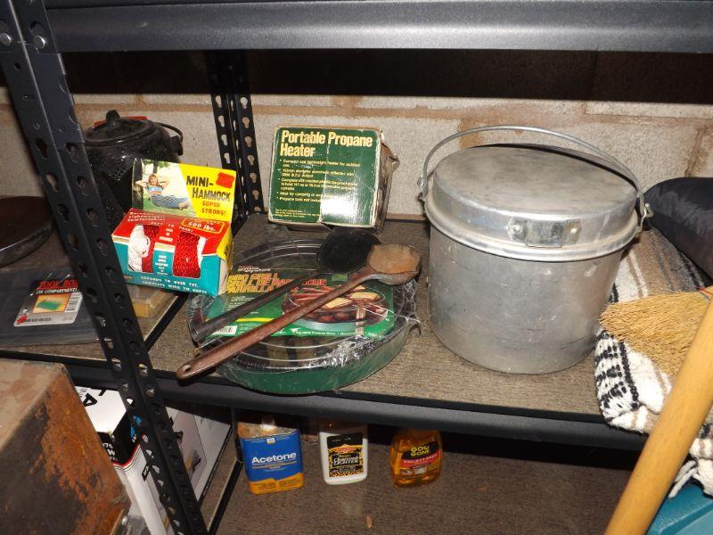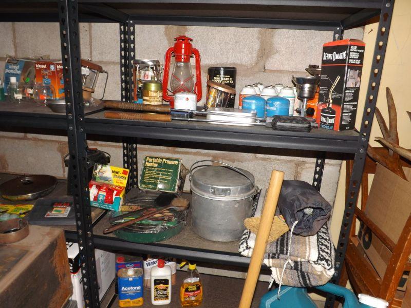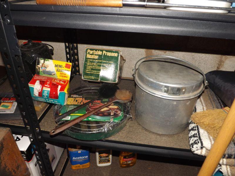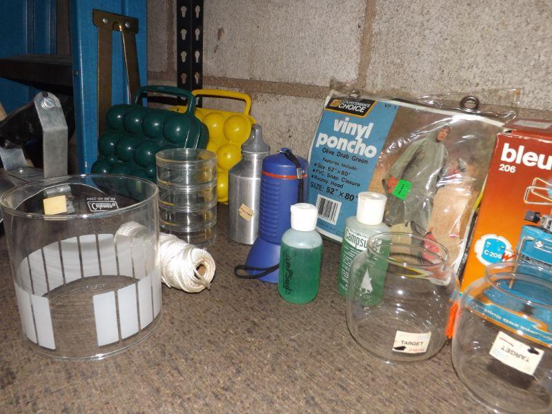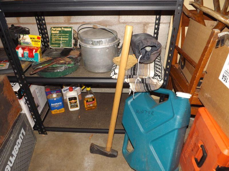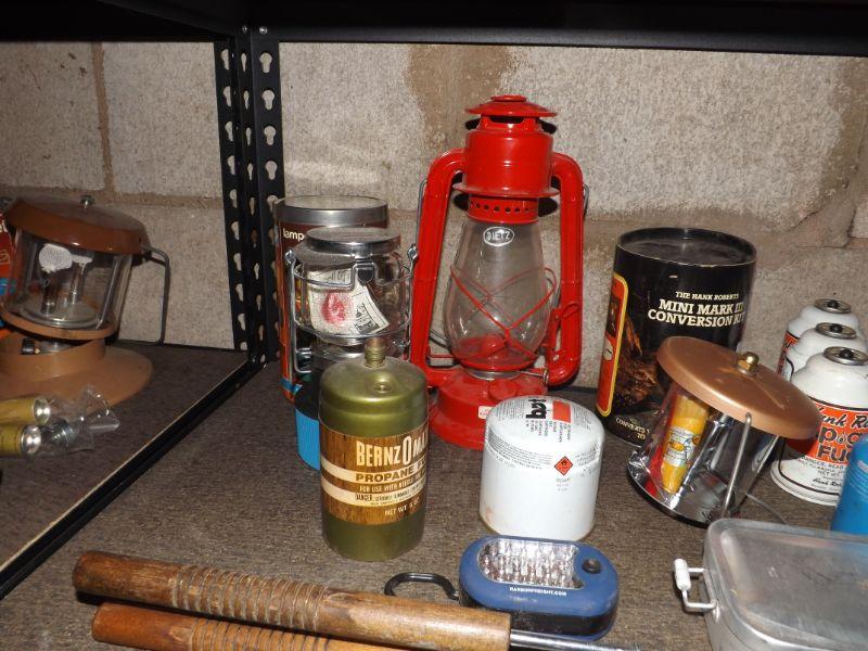 WOOD STOVE WITH FOLDING LEGS AND STOVE PIPE, WATER JUG, AX, ASSORTED POTS AND PANS, LANTERNS, BOTTLES OF GAS, FLASHLIGHTS, SMALL TENT, GLASS GOLBES, ROPE, SMALL HAMMOCK, DIETZ LANTERN, AND MORE