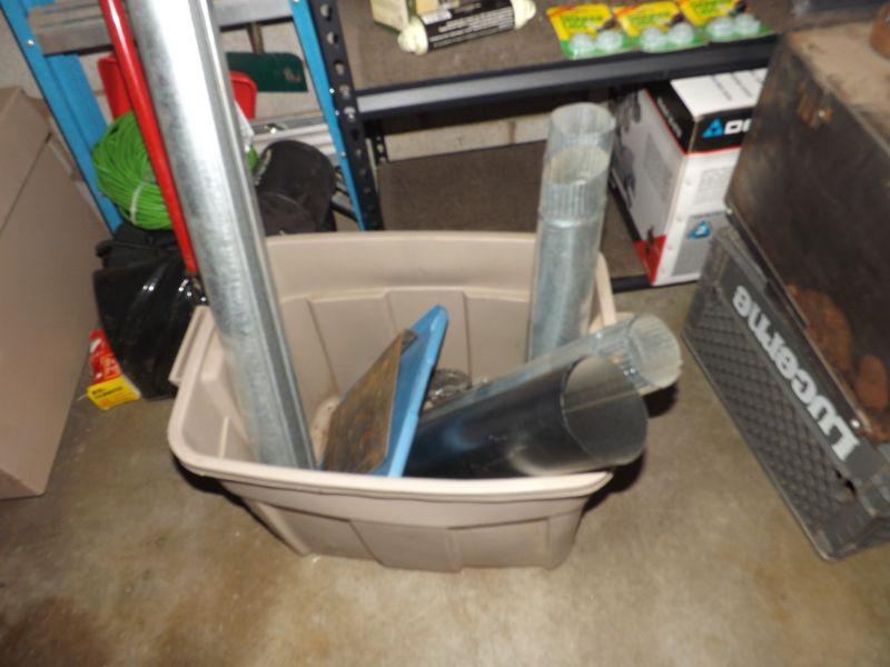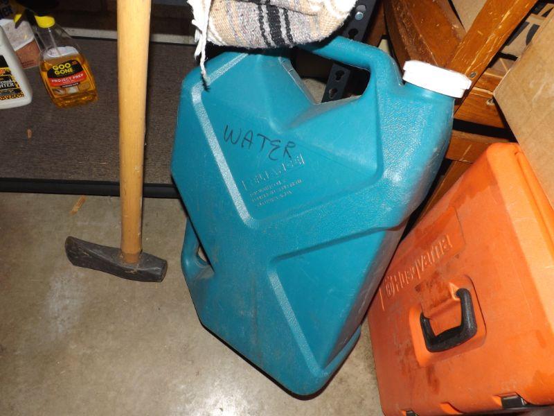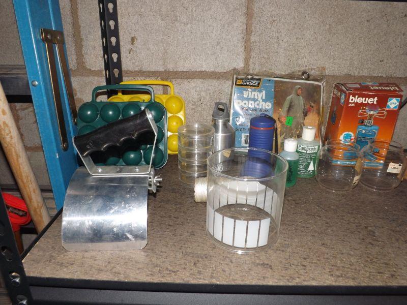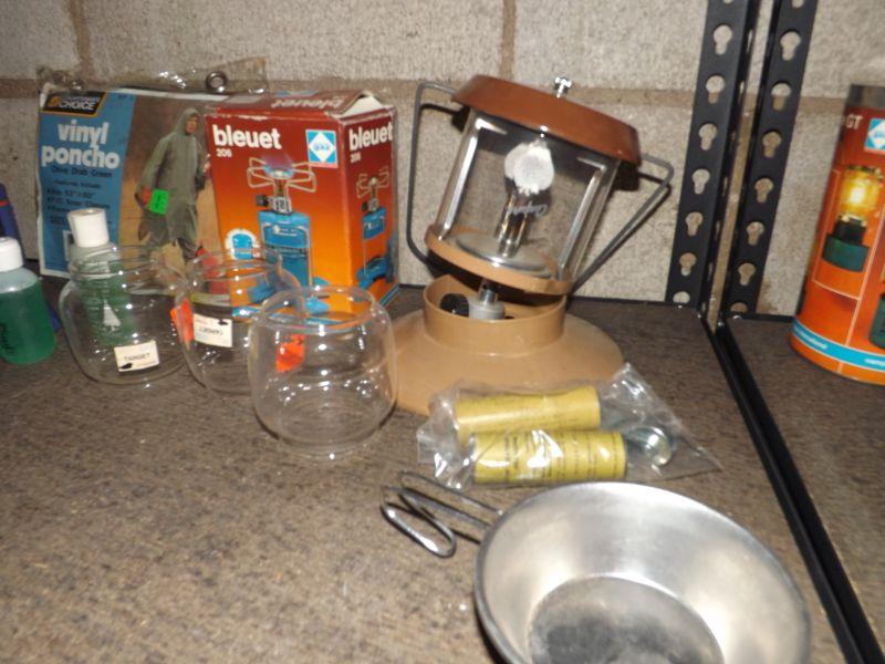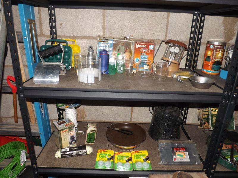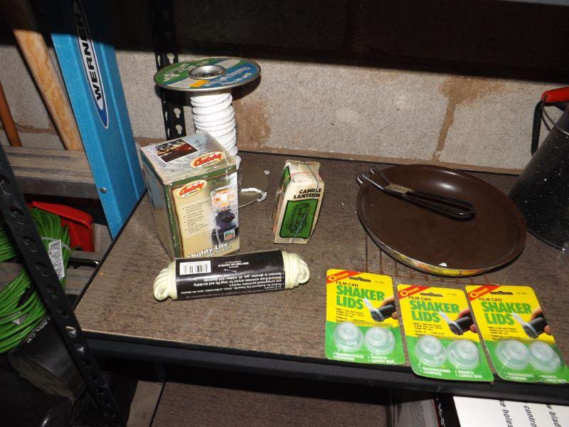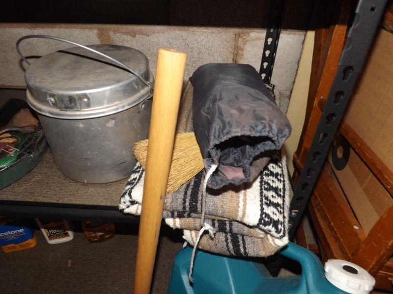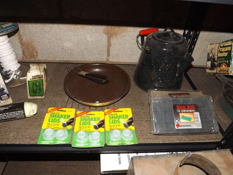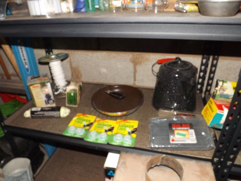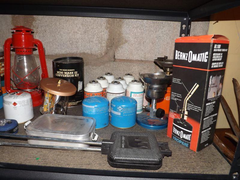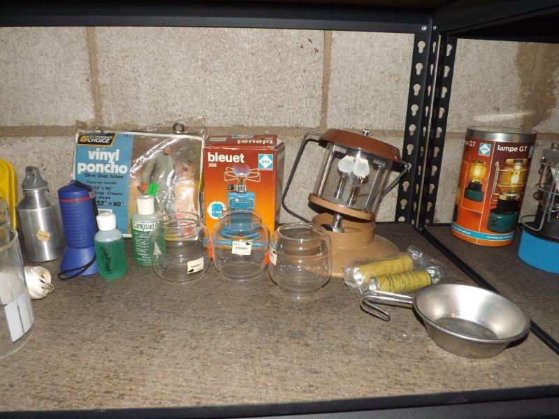 WOOD STOVE WITH FOLDING LEGS AND STOVE PIPE, WATER JUG, AX, ASSORTED POTS AND PANS, LANTERNS, BOTTLES OF GAS, FLASHLIGHTS, SMALL TENT, GLASS GOLBES, ROPE, SMALL HAMMOCK, DIETZ LANTERN, AND MORE
