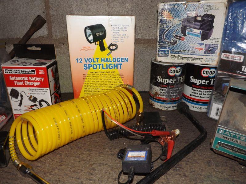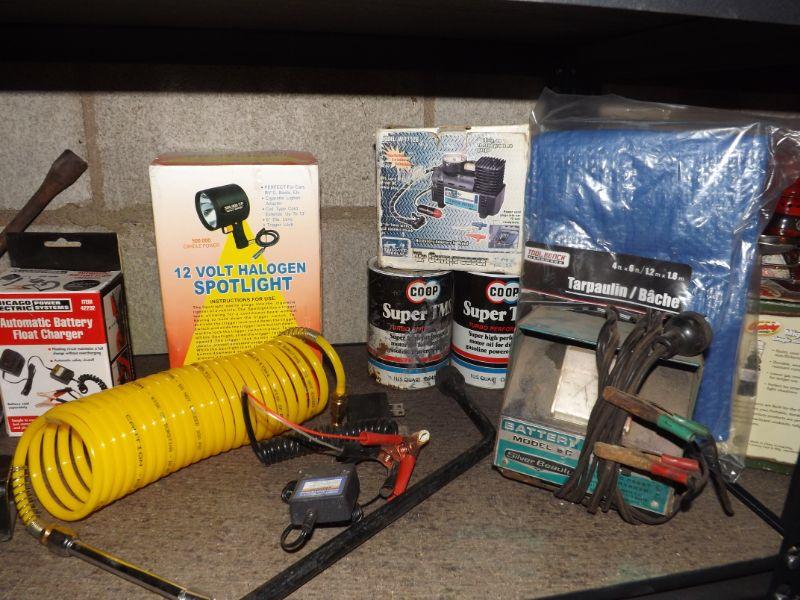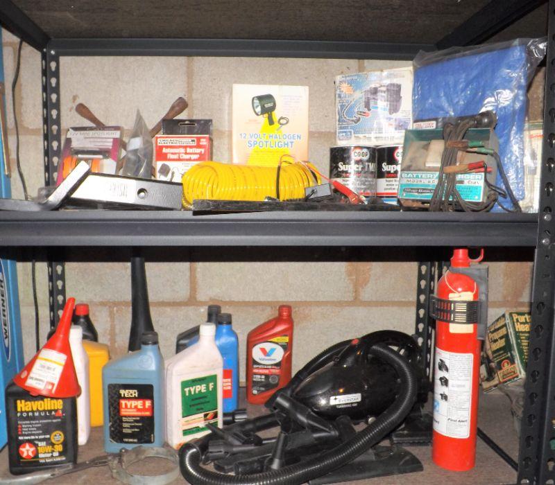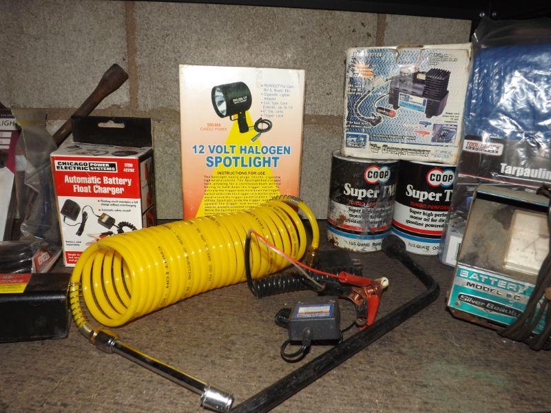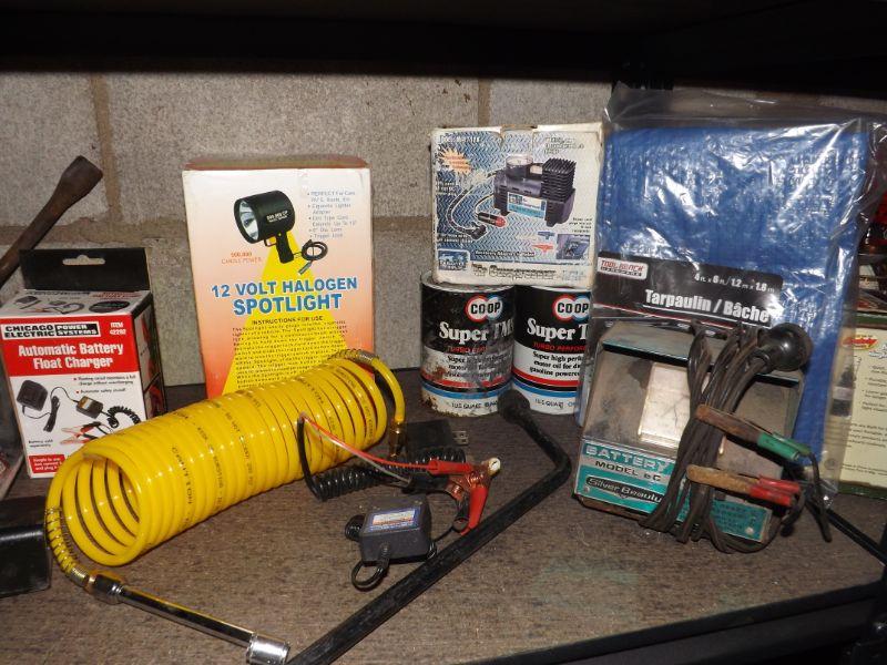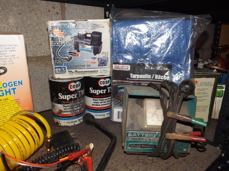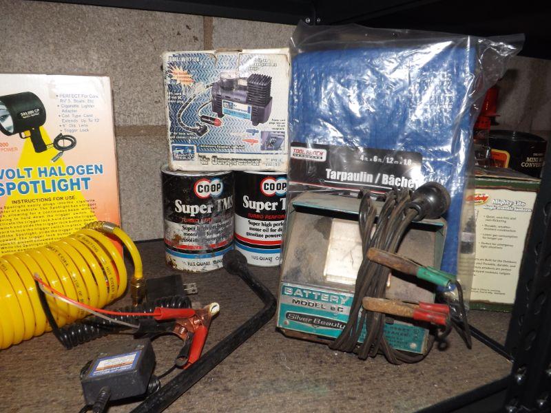 LOT 426 CAR VACUUM, TARP, AUTO FLUIDS, SPOTLIGHT, BATTERY CHARGER & MORE
