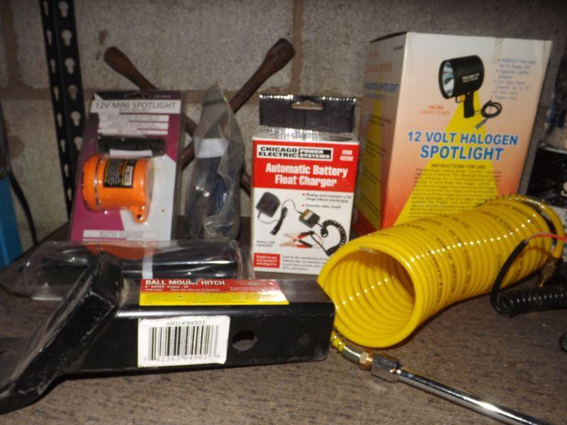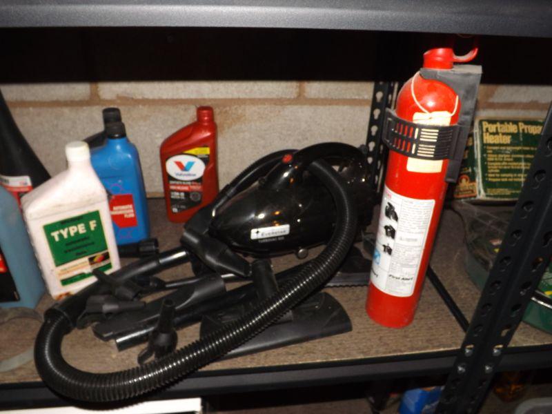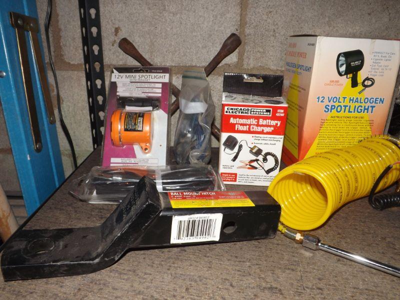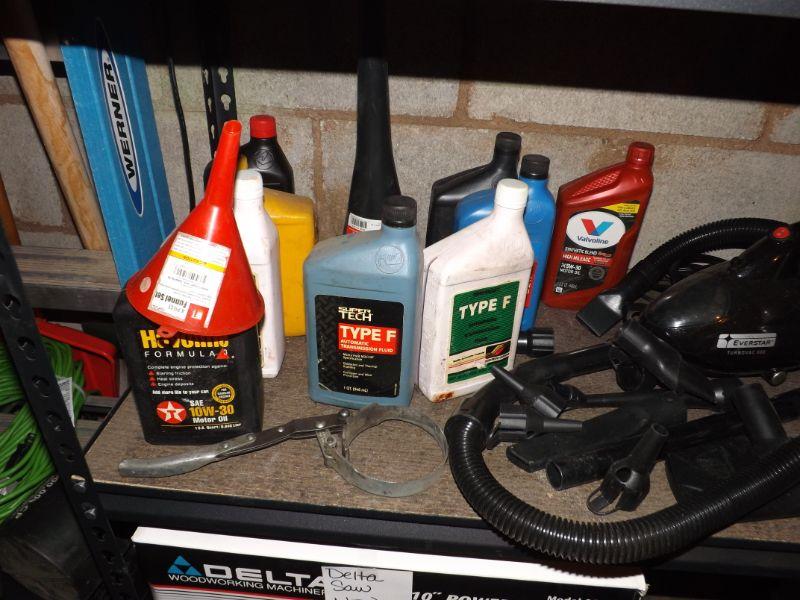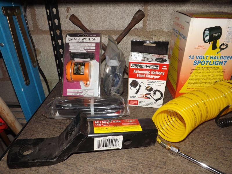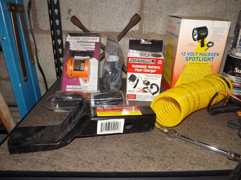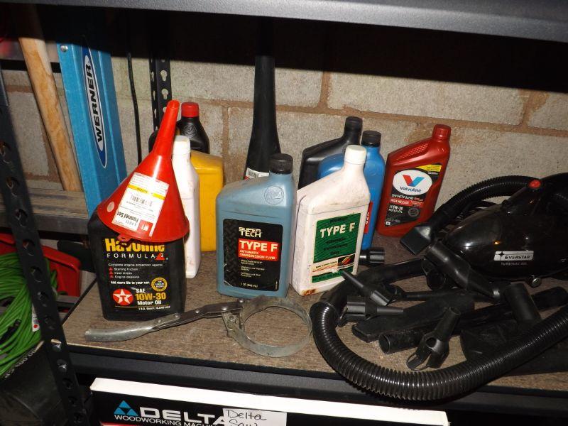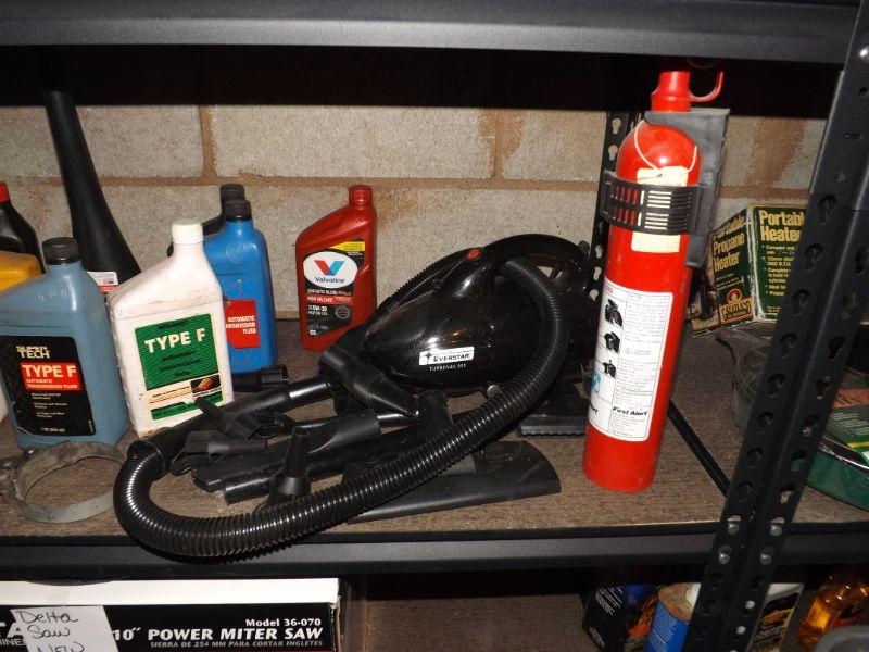 LOT 426 CAR VACUUM, TARP, AUTO FLUIDS, SPOTLIGHT, BATTERY CHARGER & MORE