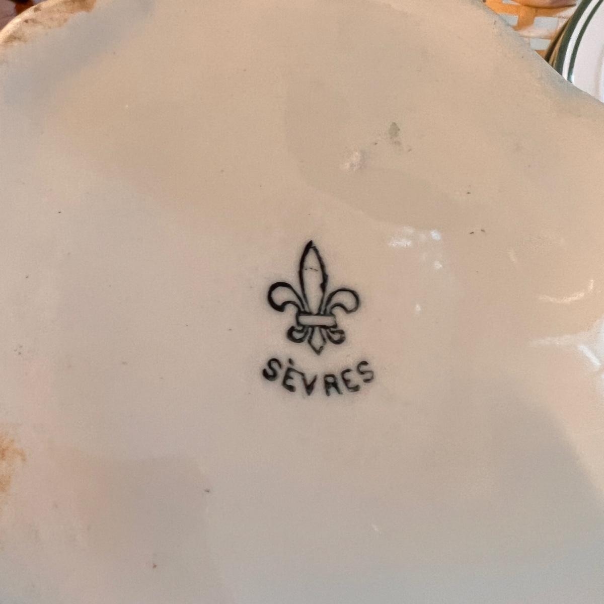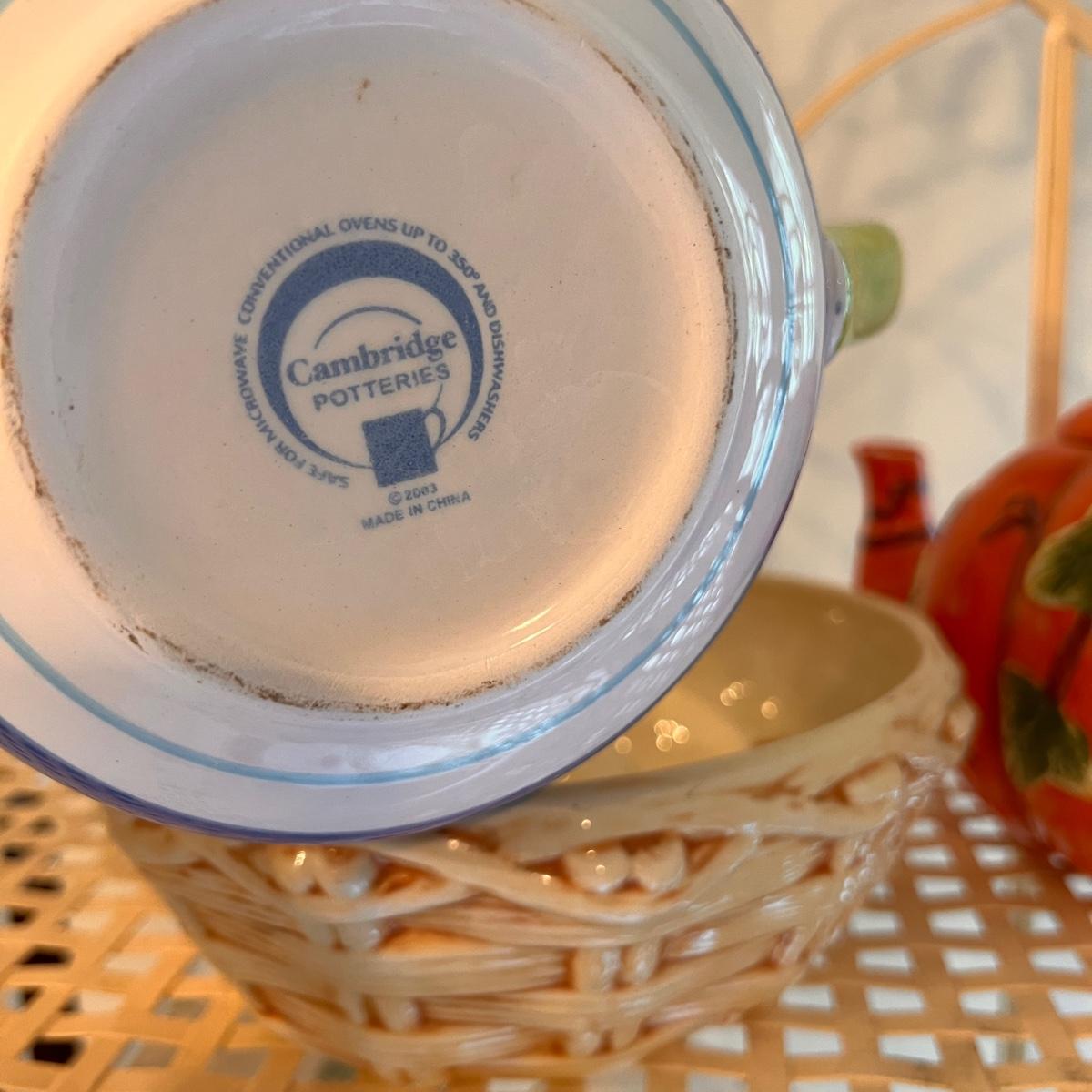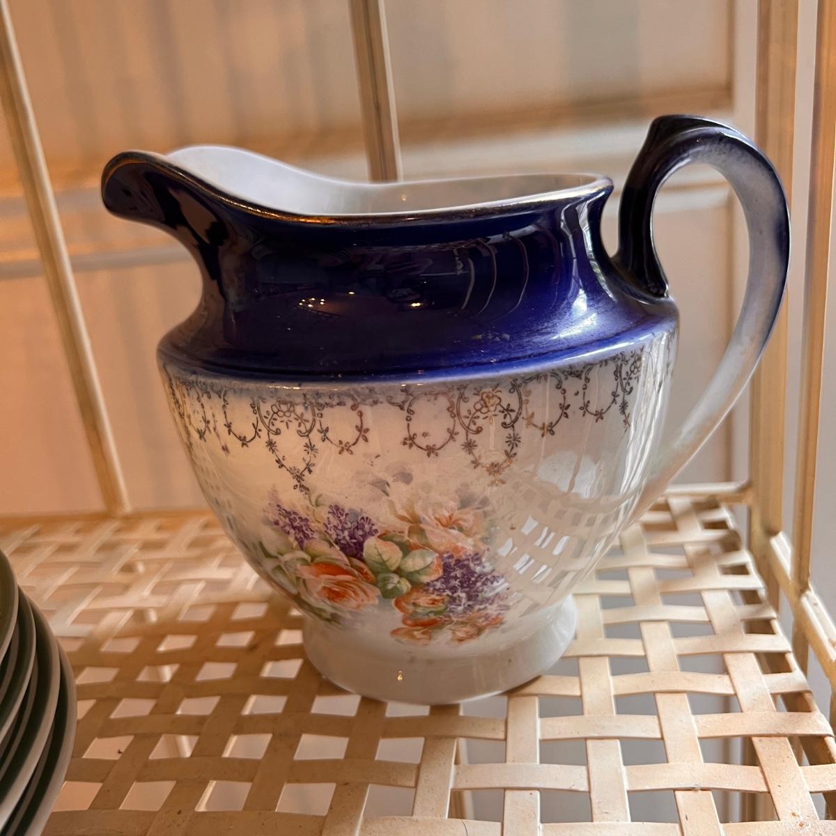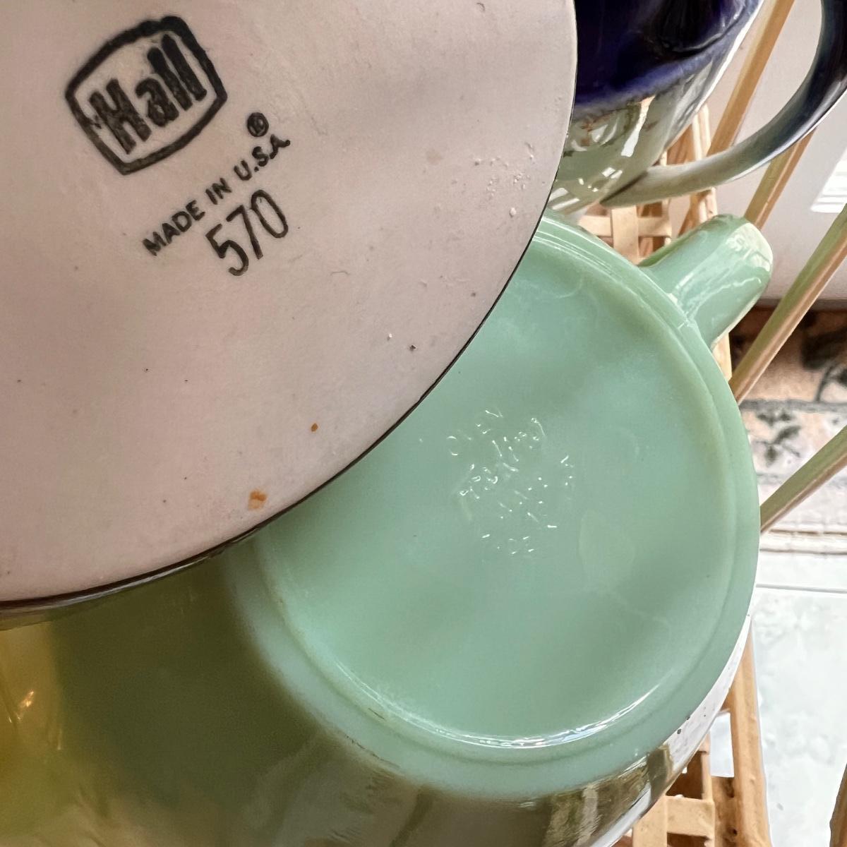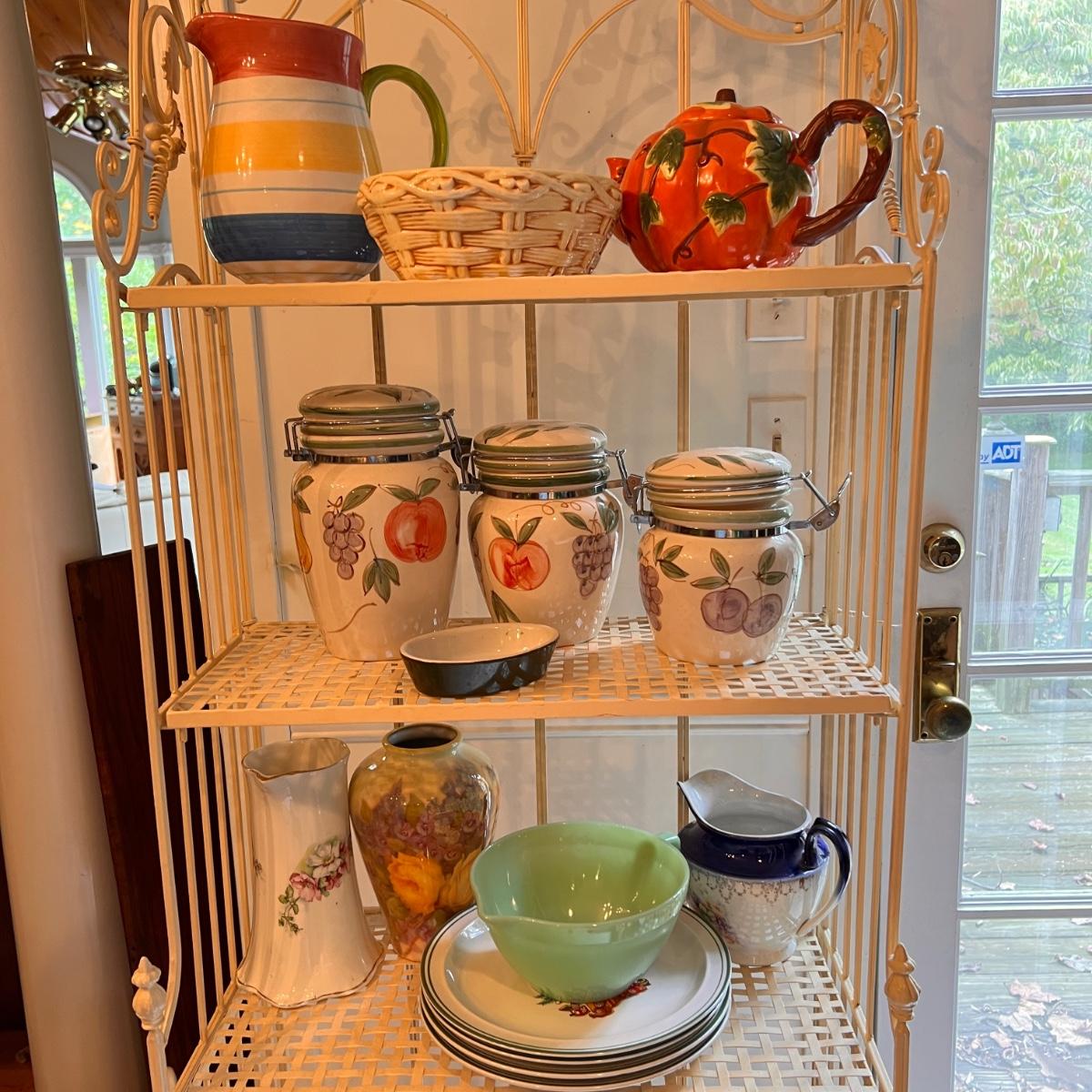 3 cannister lot, Hall ceramic small oval bowl, jadeit green Fire King glass mixing bowl, Cambridge Pottery pitcher, Anchor Christmas plates, antique Sevres pitcher and more. Shelf not included.