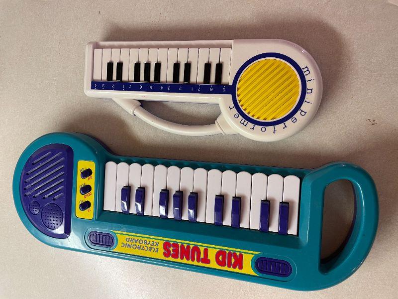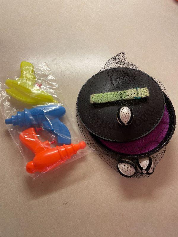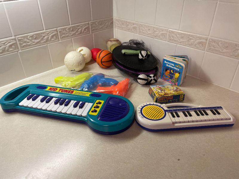TWO BATTERY OPERATED KEYBOARDS, THREE WATER GUNS, AND AN ASSORTMENT OF SMALL BALLS.