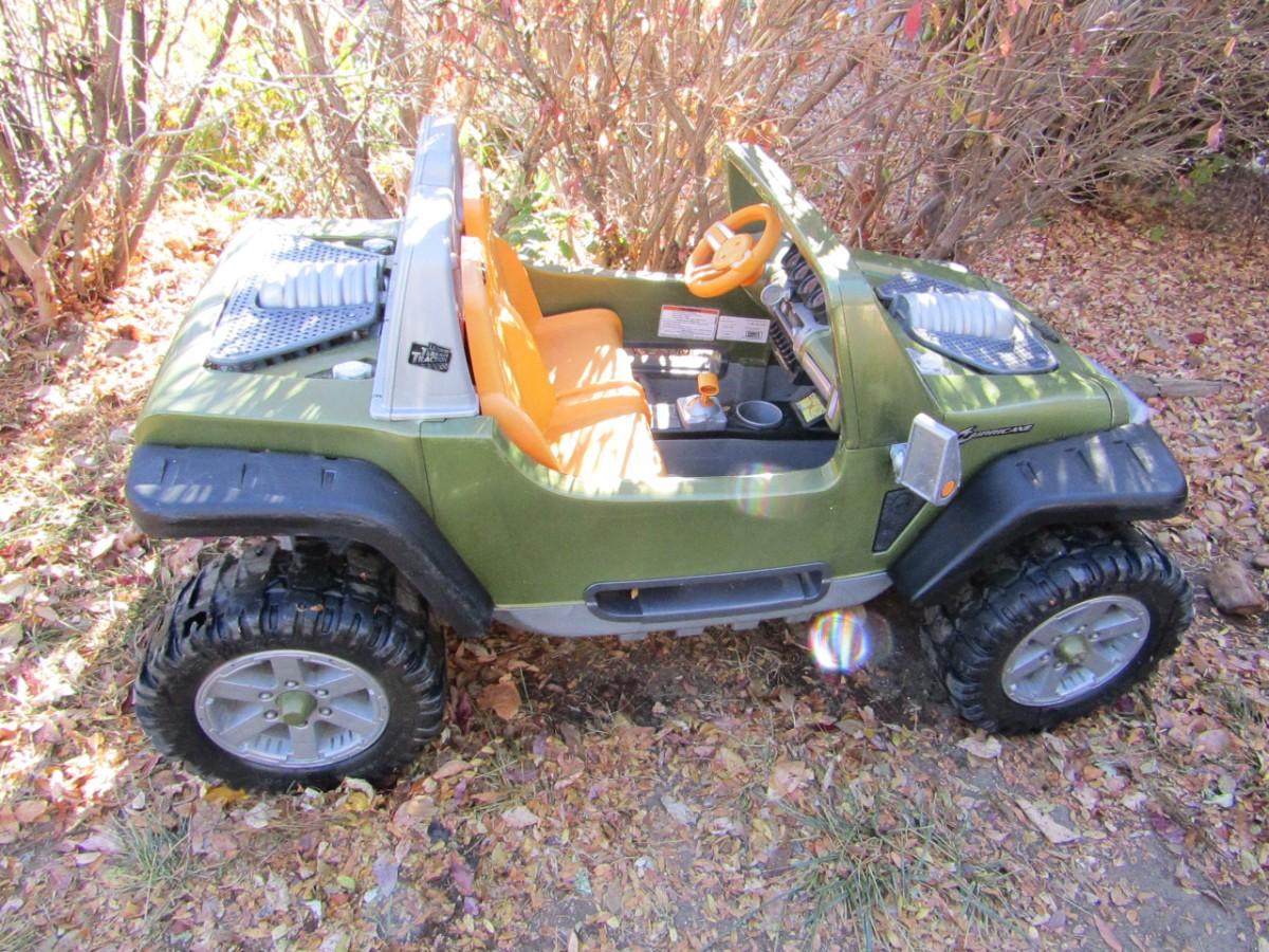 2 SEATED CHILDS RIDING JEEP WITH 2 GOOD BATTERIES AND CHARGER. THE JEEP GOES FORWARD AND BACKWARD AND IS IN GREAT SHAPE