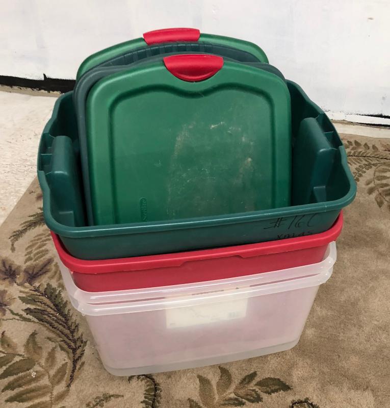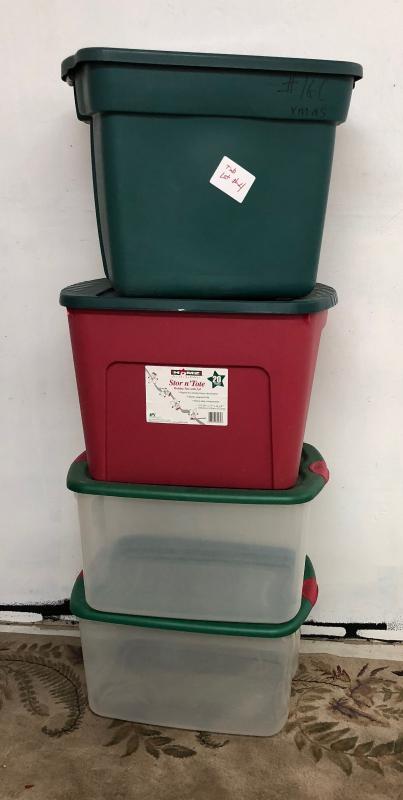 Good condition on these four plastic tubs...Christmas storage, etc..with lids...as shown...