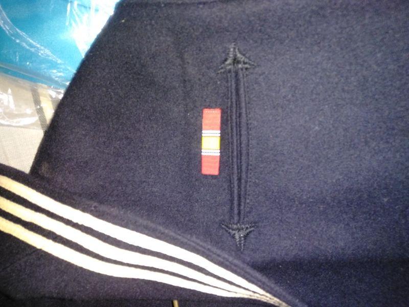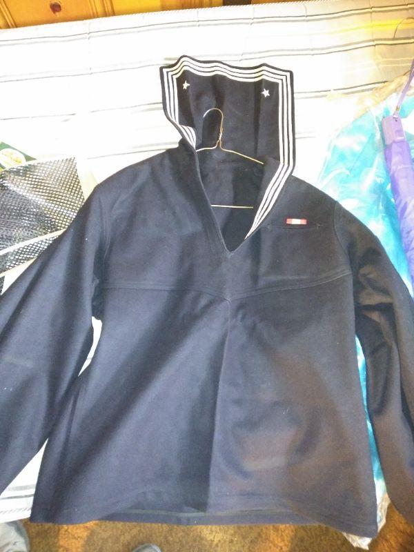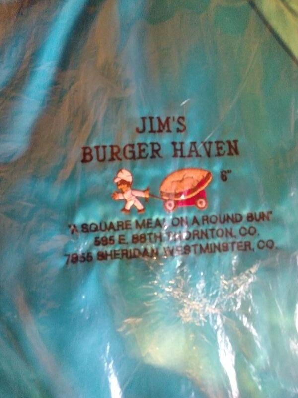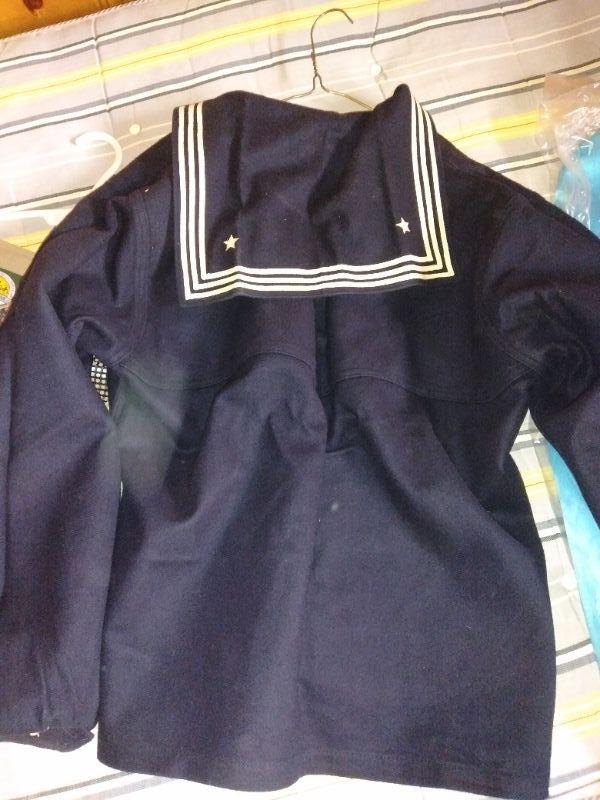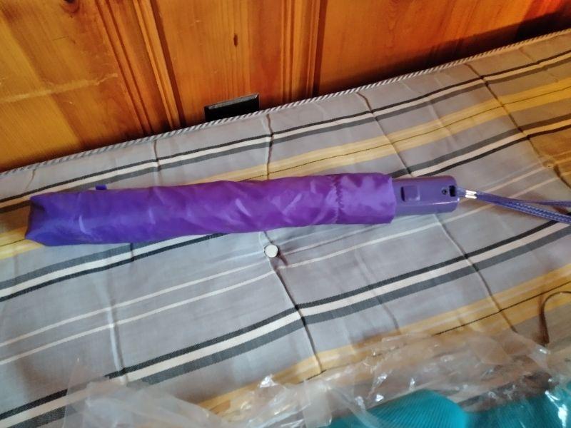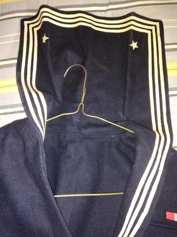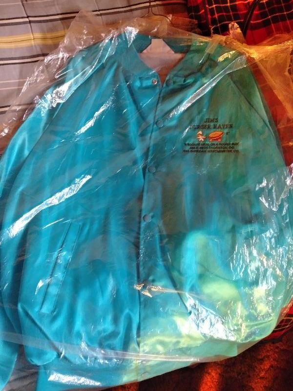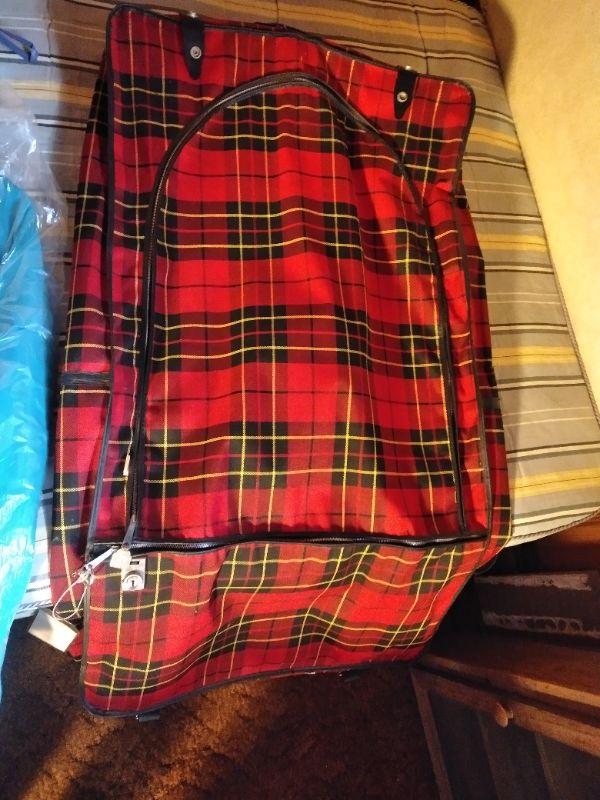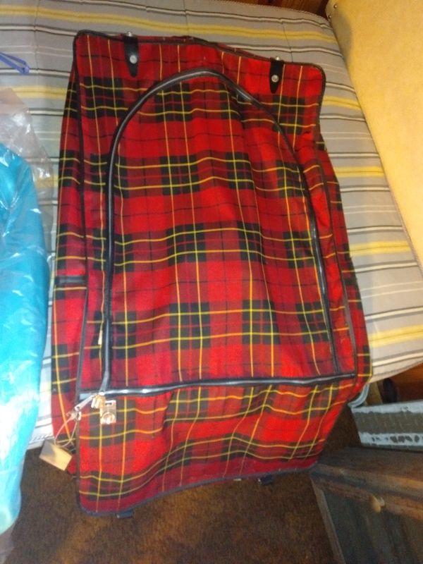 CABELA'S OUTDOOR GEAR 3XL FISHING VEST, OLD WOOL NAVY? JACKET, JIMS BURGER HAVEN NYLON JACKET, PURPLE UMBRELLA, RED CLOTHING SUITCASE, AND A PAIR OF WOODEN SHOE STRETCHERS.