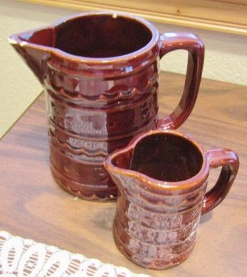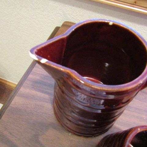 BROWN CLAY PITCHER HAS CHIPS AROUND THE SPOUT