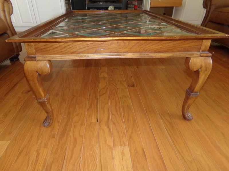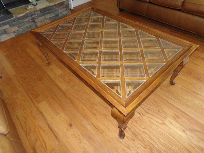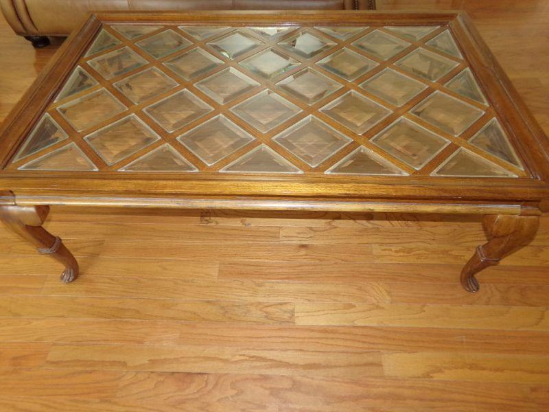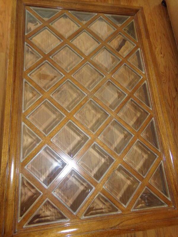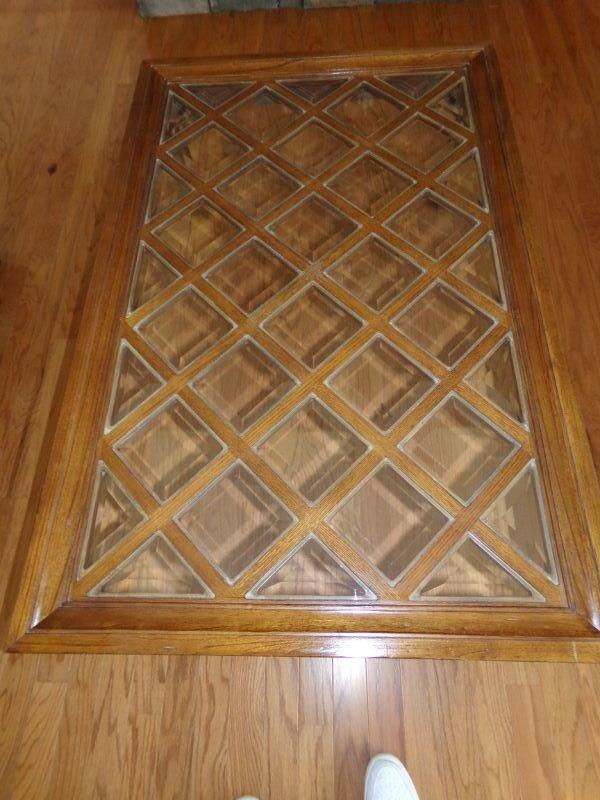 COFFEE TABLE WITH CROSSBAR PATTERN AND INDIVIDUAL PIECES OF BEVELED GLASS INSET. OVERALL VERY GOOD CONDITION.