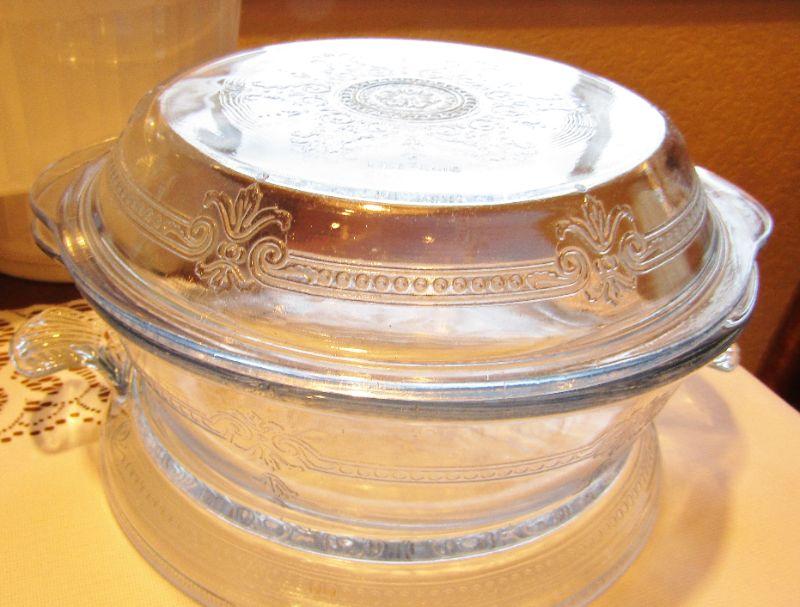 FEDERAL GLASS REFRIGERATOR DISH WITH EMBOSSED FRUIT.
