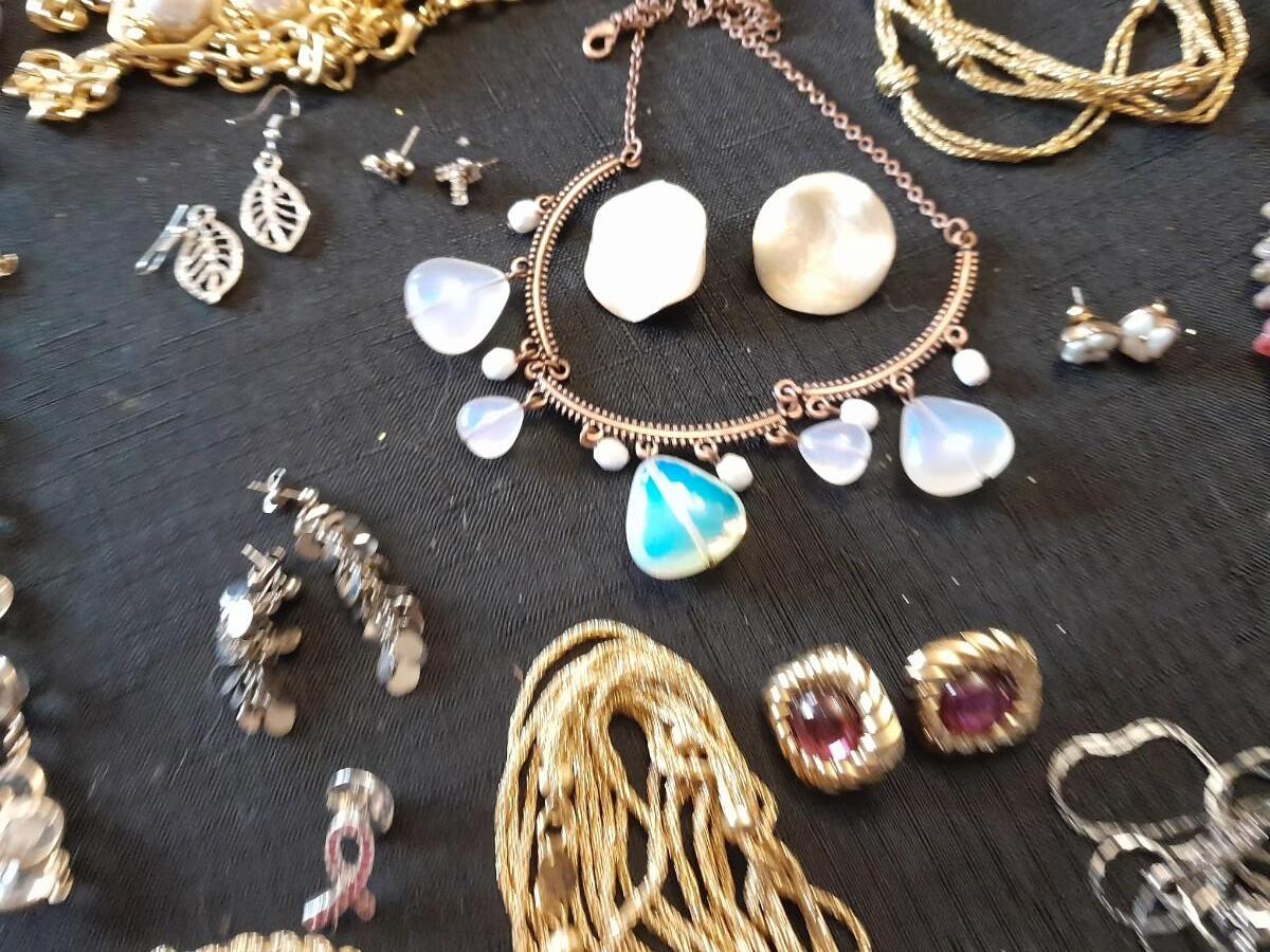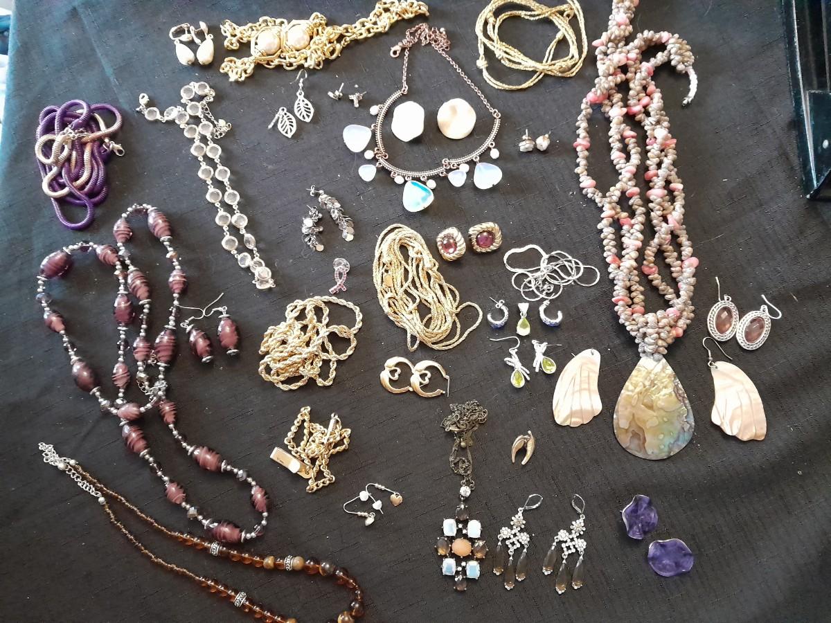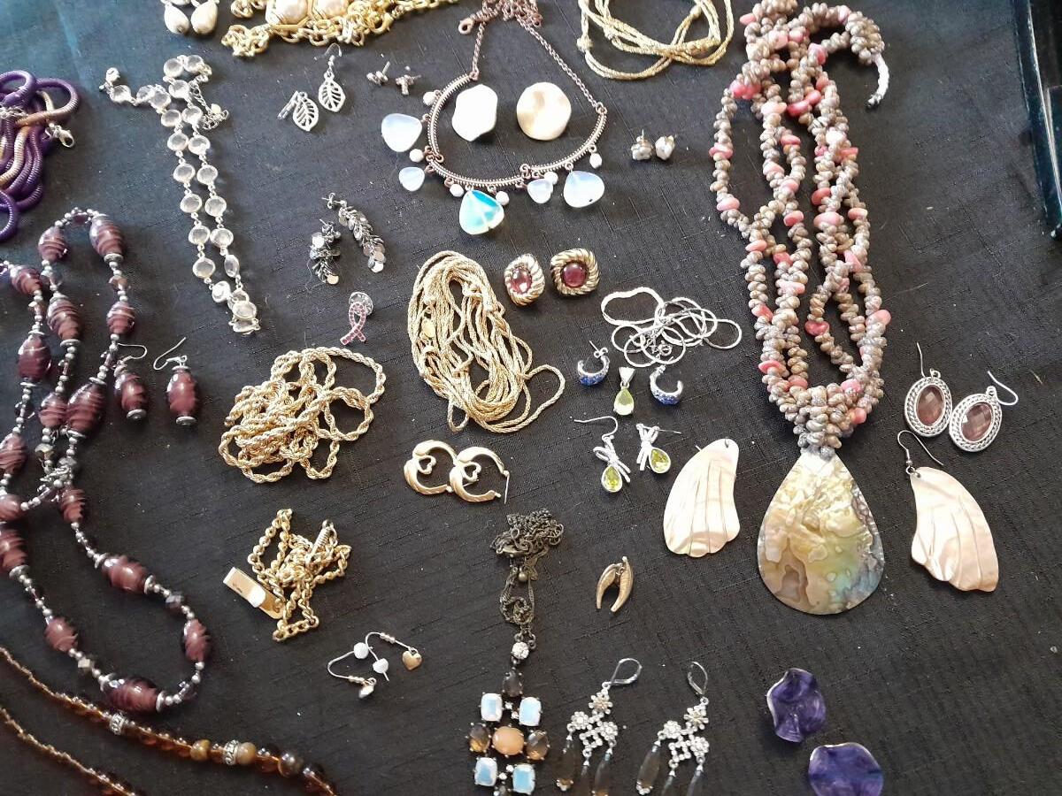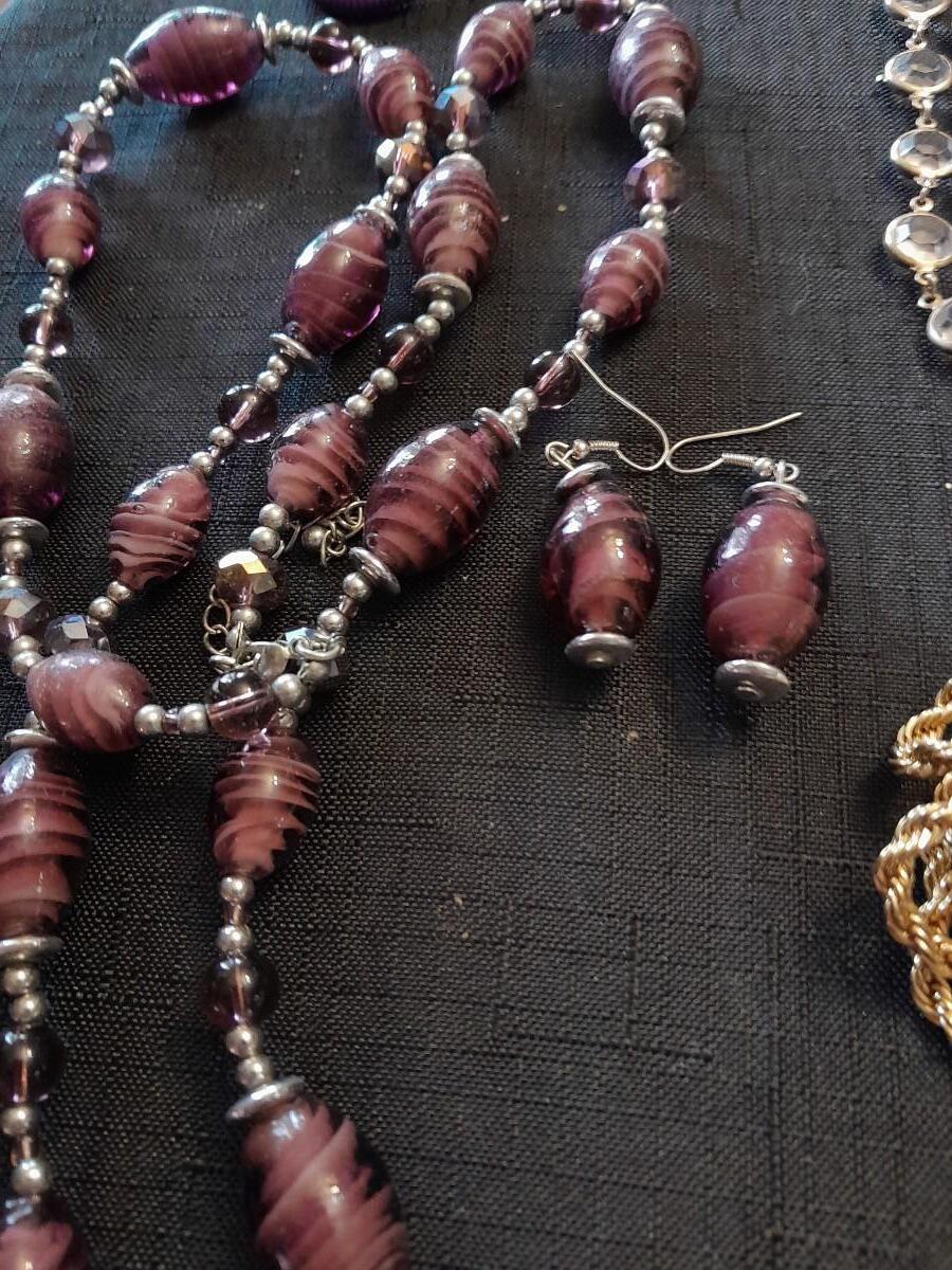 LOT 87 COSTUME JEWELRY NECKLACES WITH MATCHING EARINGS, A WATCH, AND MORE