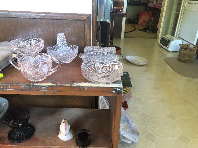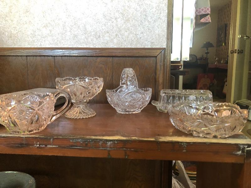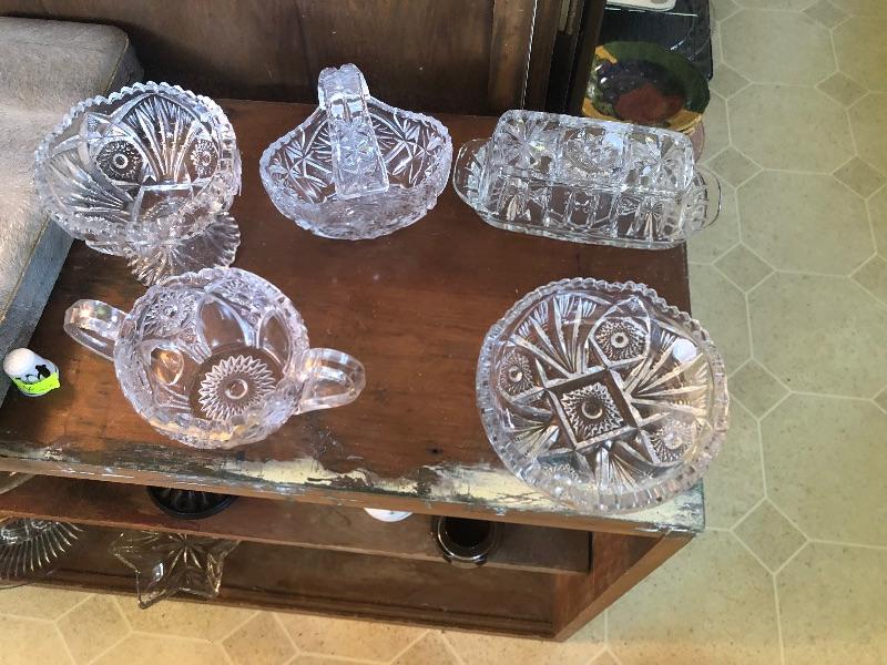 Lot of cut class including a butter dish, pedestal candy dish, plate, handled candy dish and 2 handled cup 5 in total