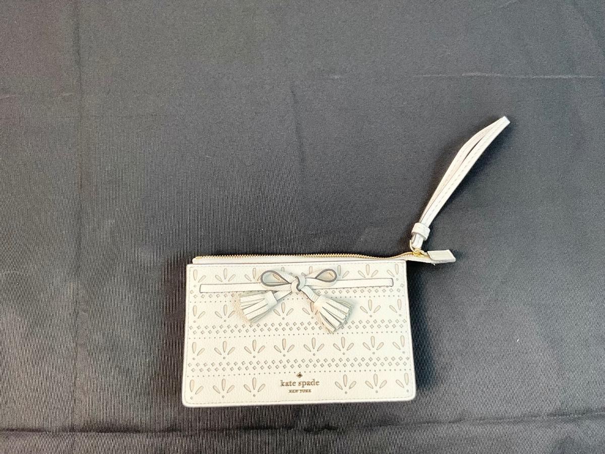 New With Tags Kate Spade white leather Hayes Perf Camera clutch measures 6” wide and 4” high
