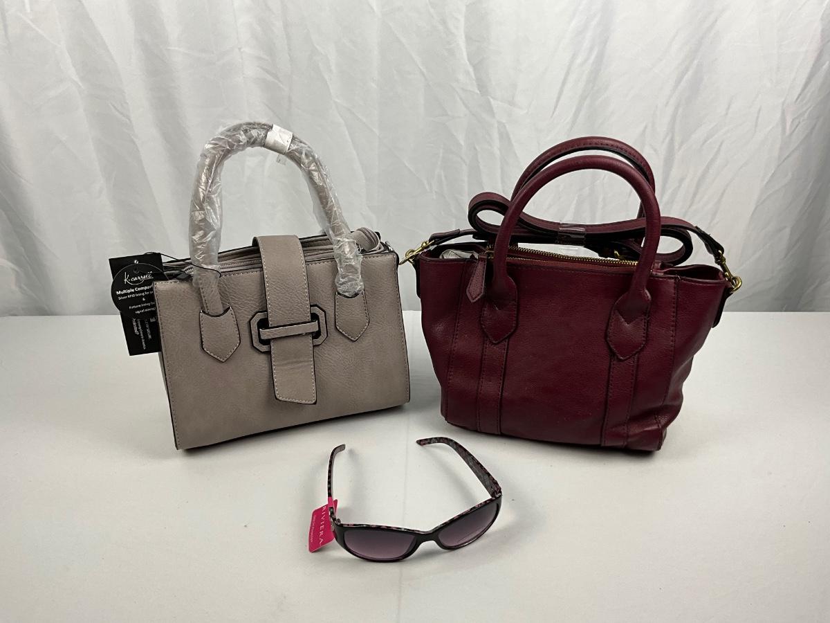 New With Tags.Tow leather handbags and a pair of Riviera sunglasses.