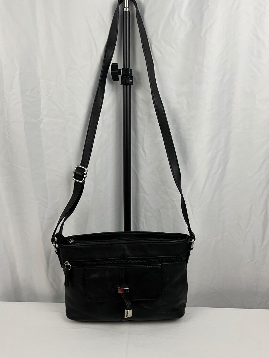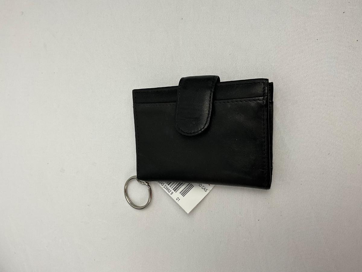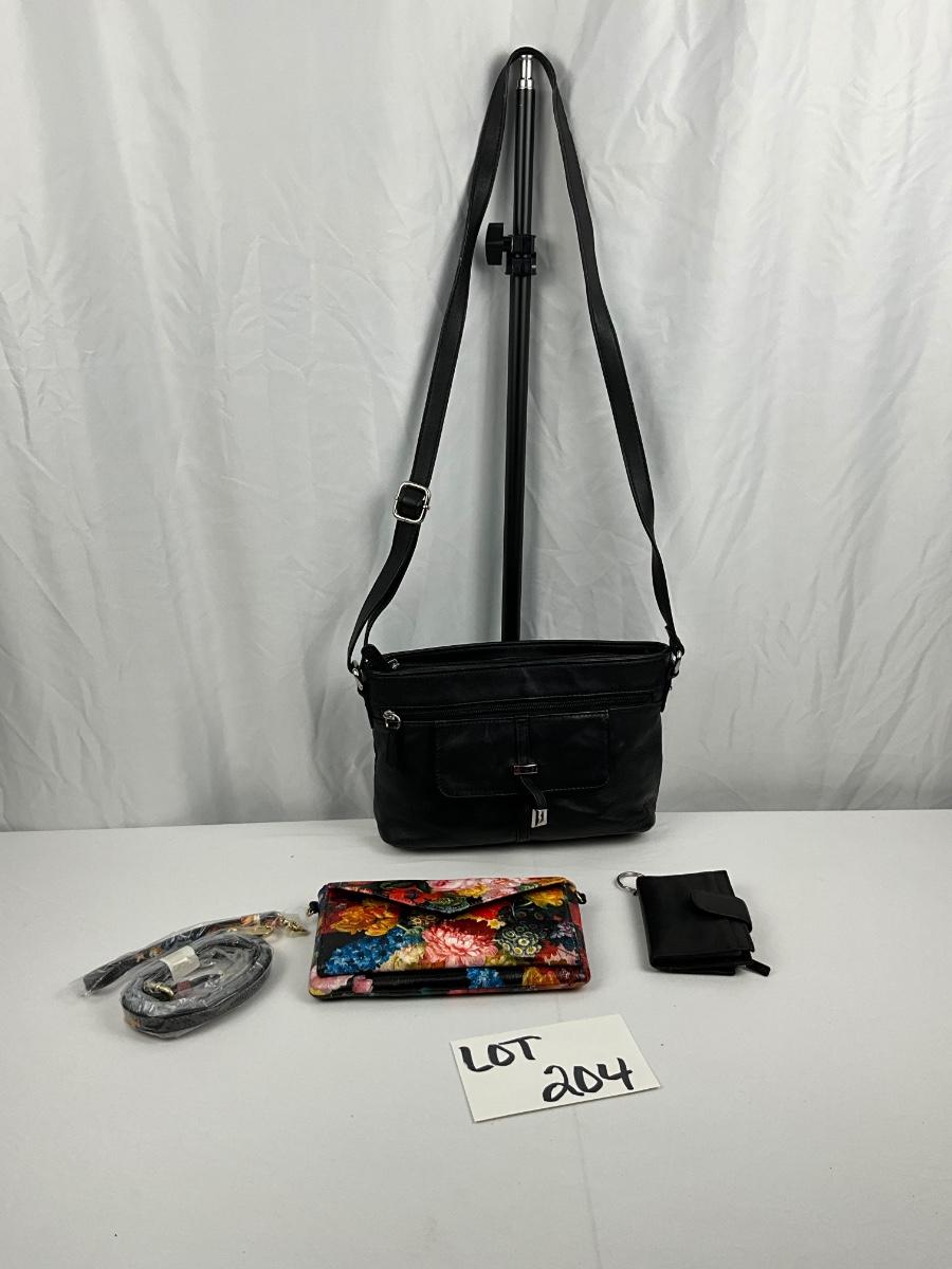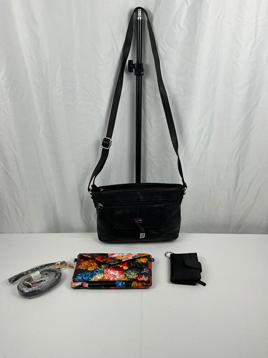 New Lodi’s floral wristlet, black leather card holder and black leather shoulder bag.