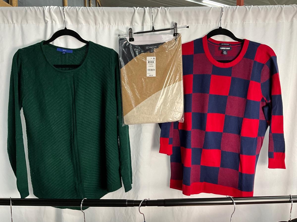 The lot contains several items that are brand new with tags. All tops/sweaters are a size XL, pants are a size 18. Brands included in this lot are Loft, Lands End, Mossimo, Apt. 9, INC, Tommy Hilfiger. There are 9 items in this lot.
