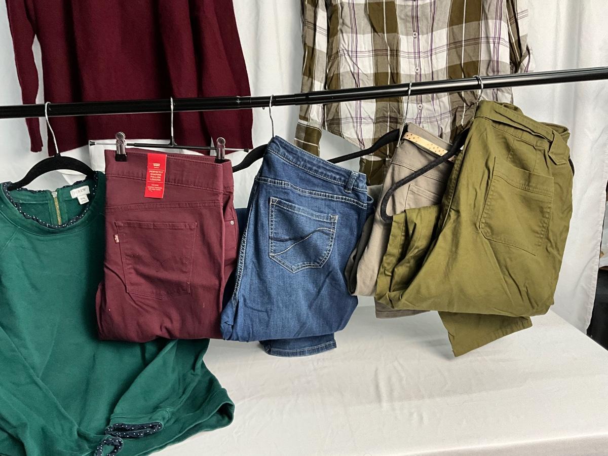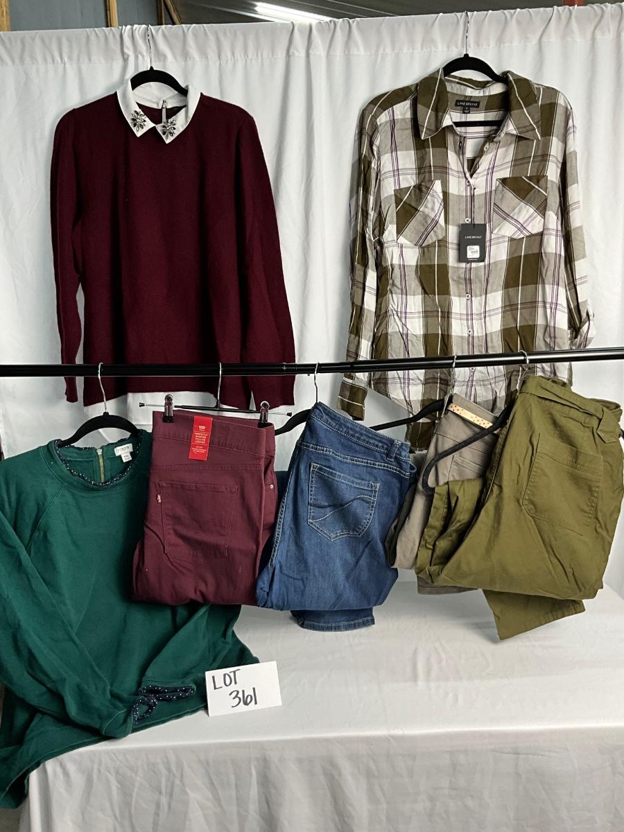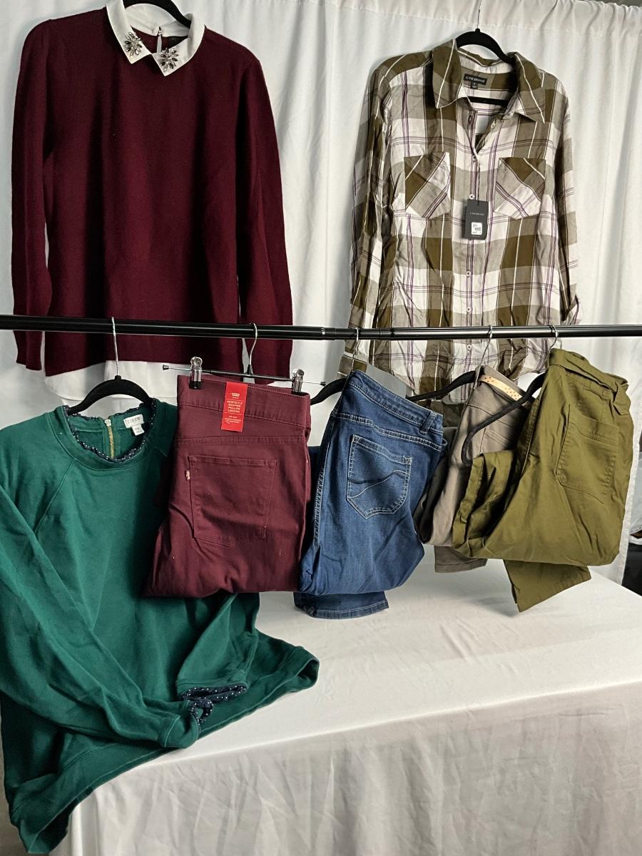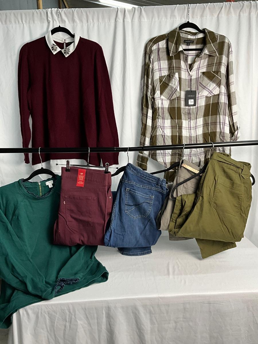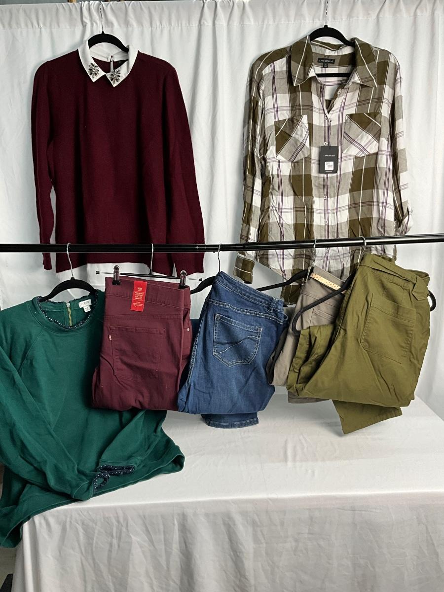 The lot contains 7 items, some are new with tags, sized 18. Brands included are Charter Club cashmere, Lauren Conrad, Lane Bryant and Levi’s.