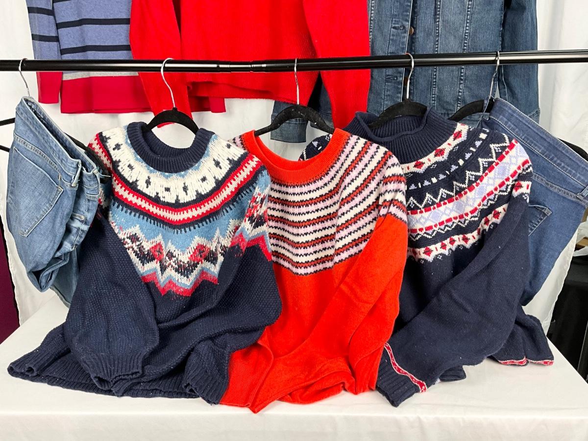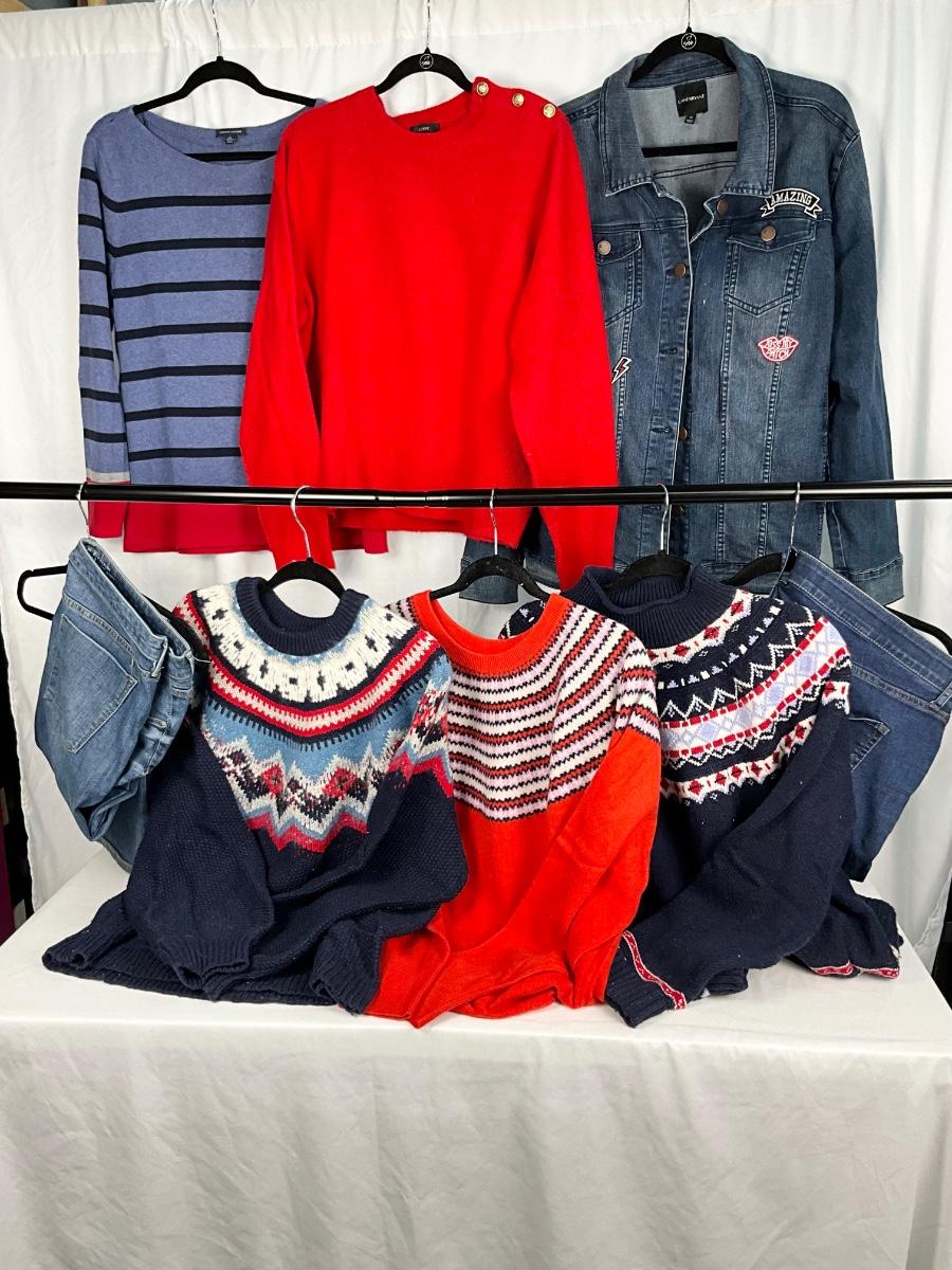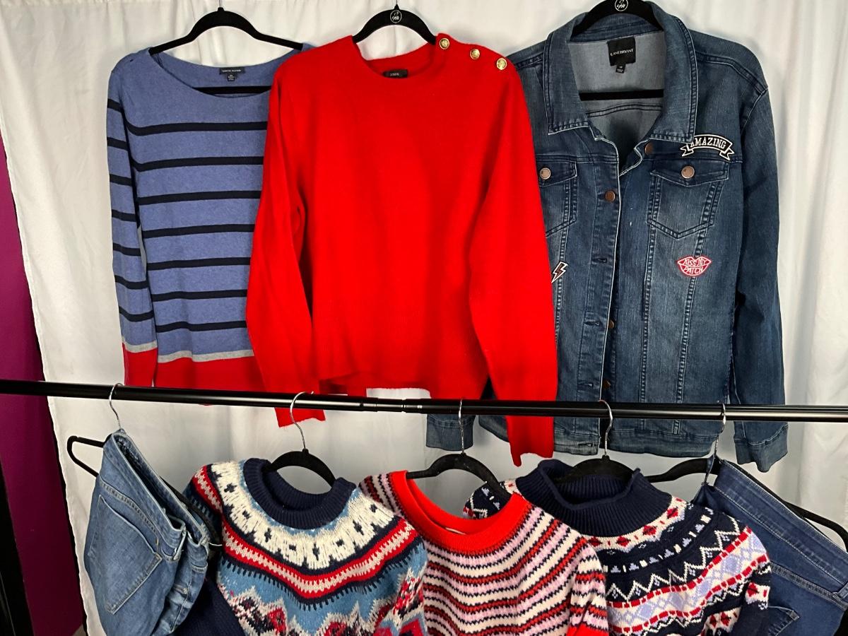 There are 5 sweaters in this lot, one denim jacket and two pair of jeans. Most are new with tags. Brands included are Lane Bryant, Ava & Viv, Mossimo, J. Crew, Tommy Hilfiger.