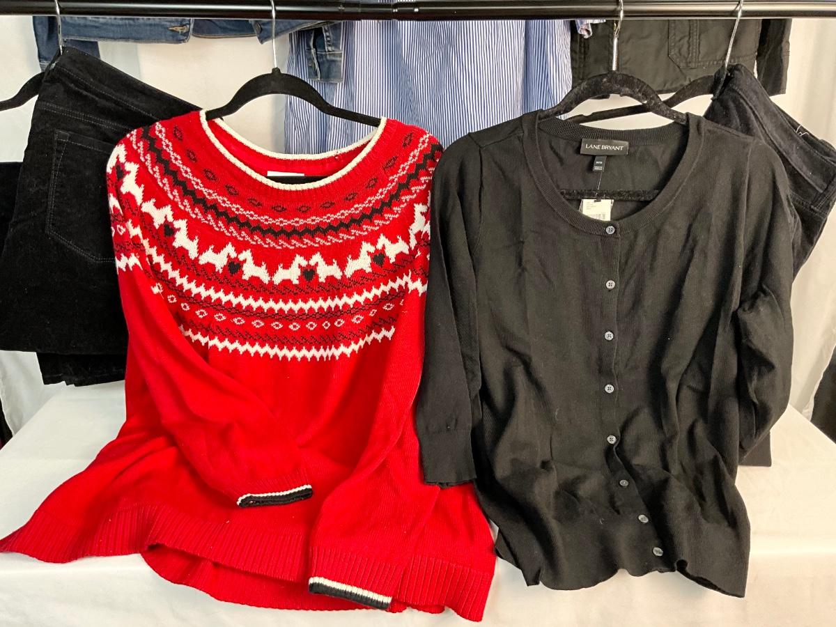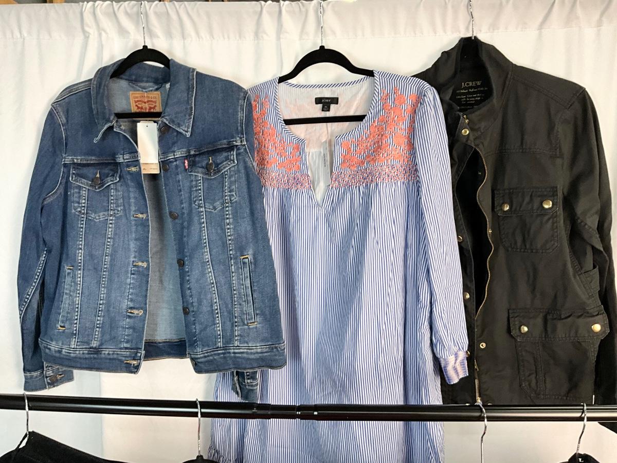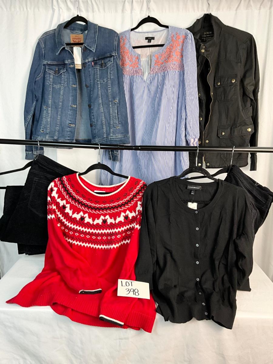 The lot contains jackets, tops, sweater and pants. The tops are size XL and the pants are size 16. Brands included are Lane Bryant, Charter Club, J. Crew, Levi’s and more.