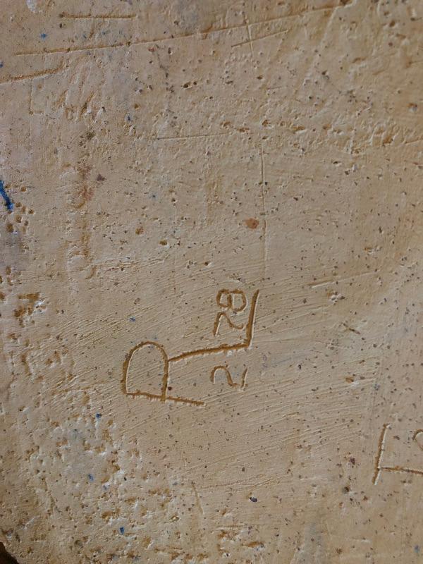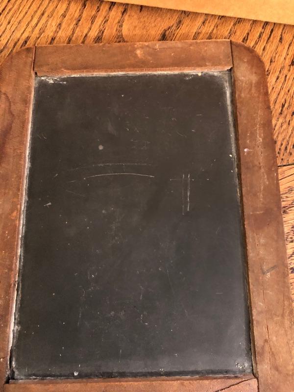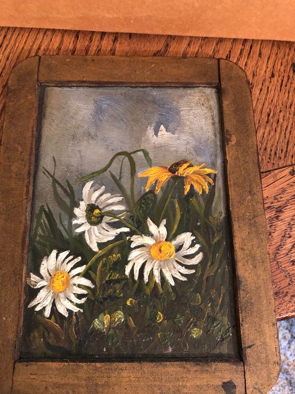 Lot of decor including a daisy picture on chalkboard 9x6 1/2, flowered vase 8 1/2 inches and a numbered blue pottery bowl 7 in wide