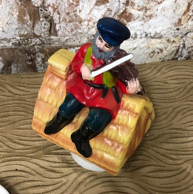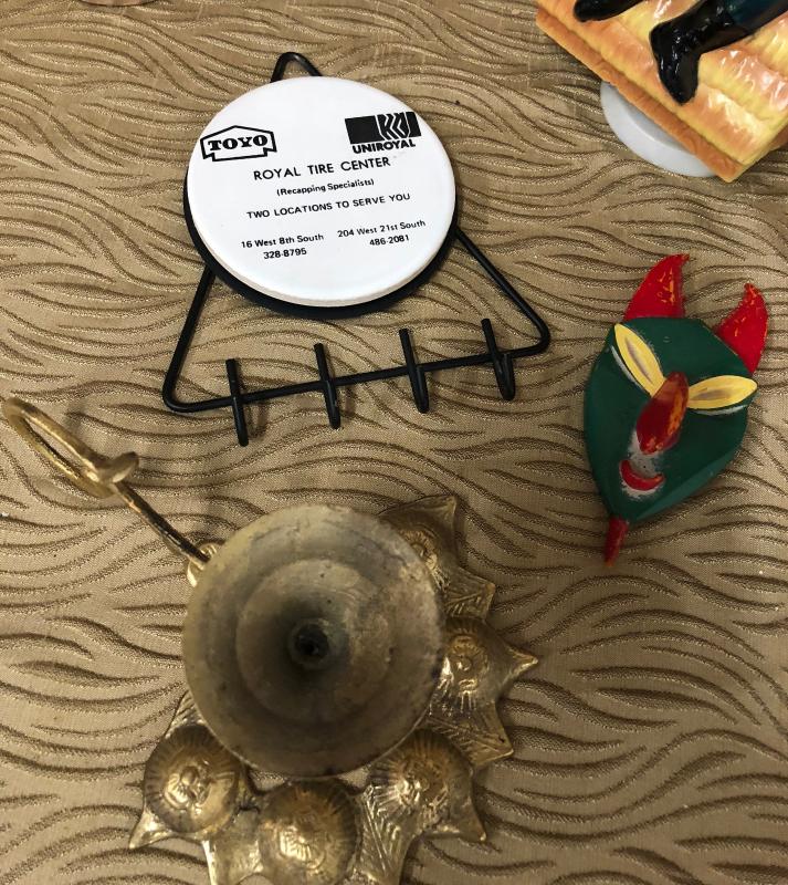 As shown a mixed lot of household decor items...with an old ceramic milk pitcher and tire advertising rack...India brass...and an old neckerchief slide...lest we forget the Tevya figure...