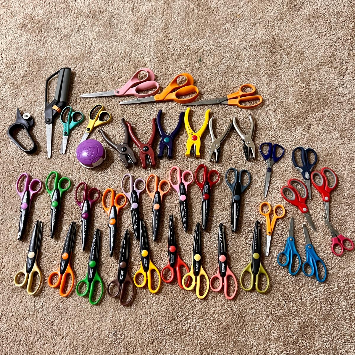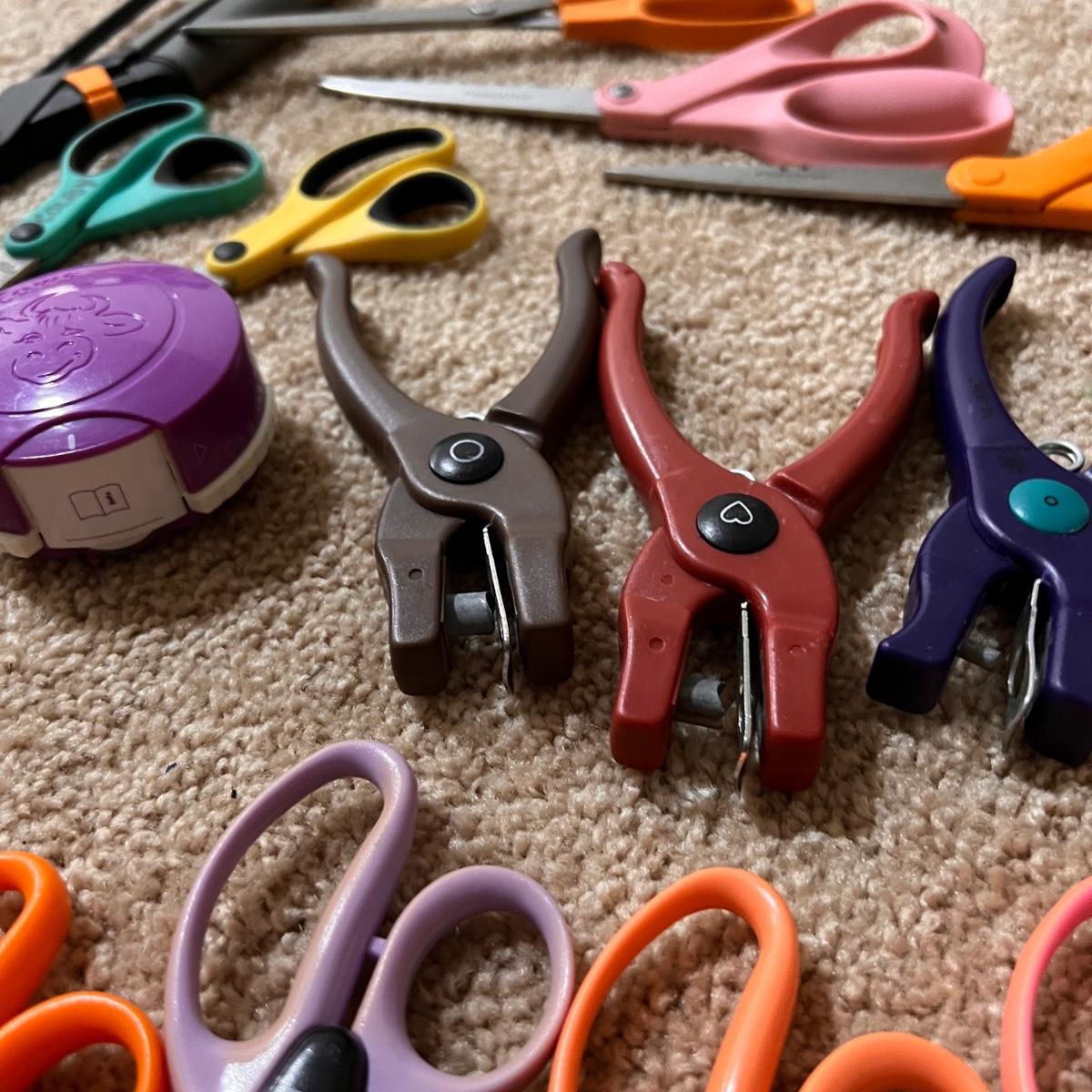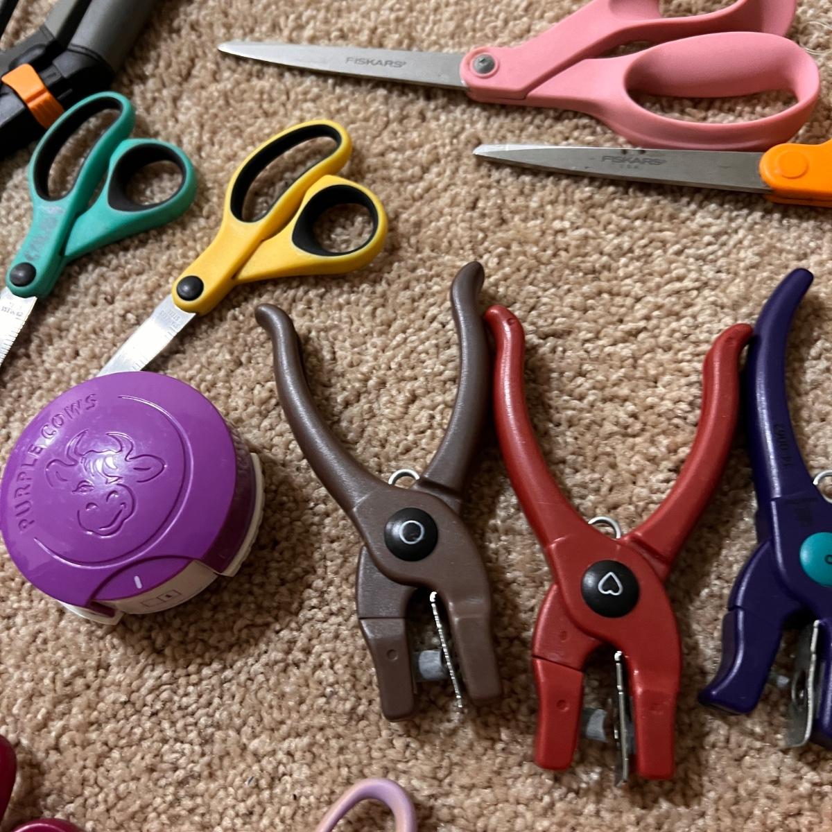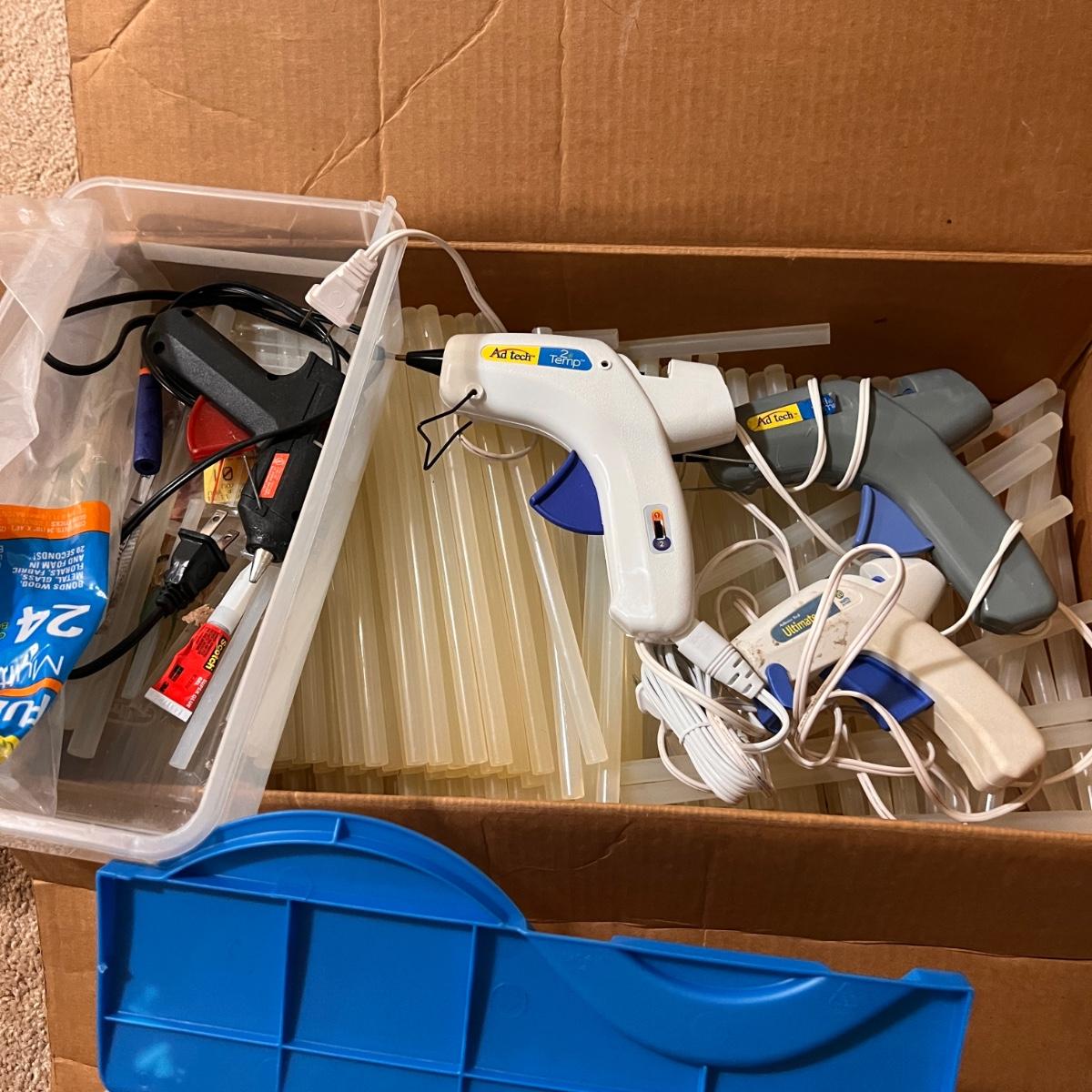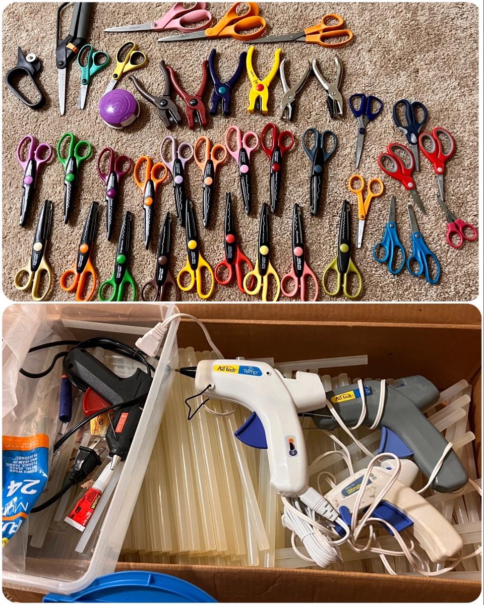 Big box of glue sticks, multiple glue guns, decorative shaped scissors, fabric scissors, decorative hole punches, specialty scissors.
