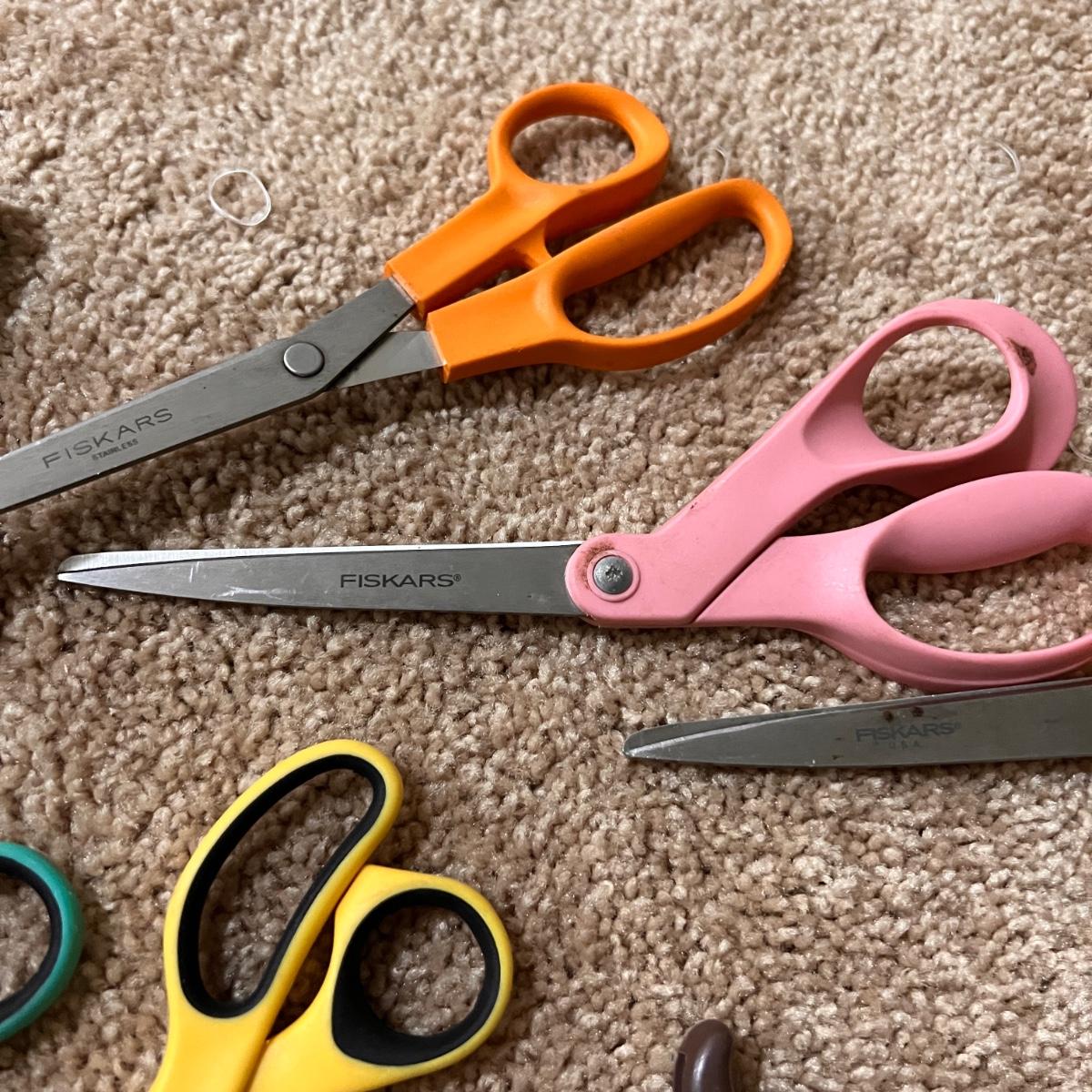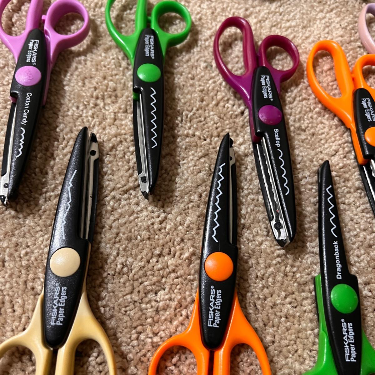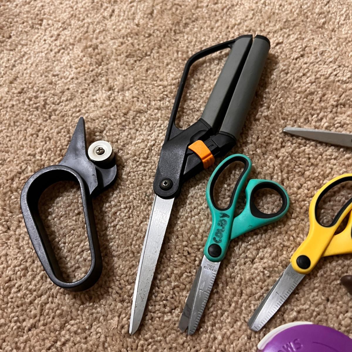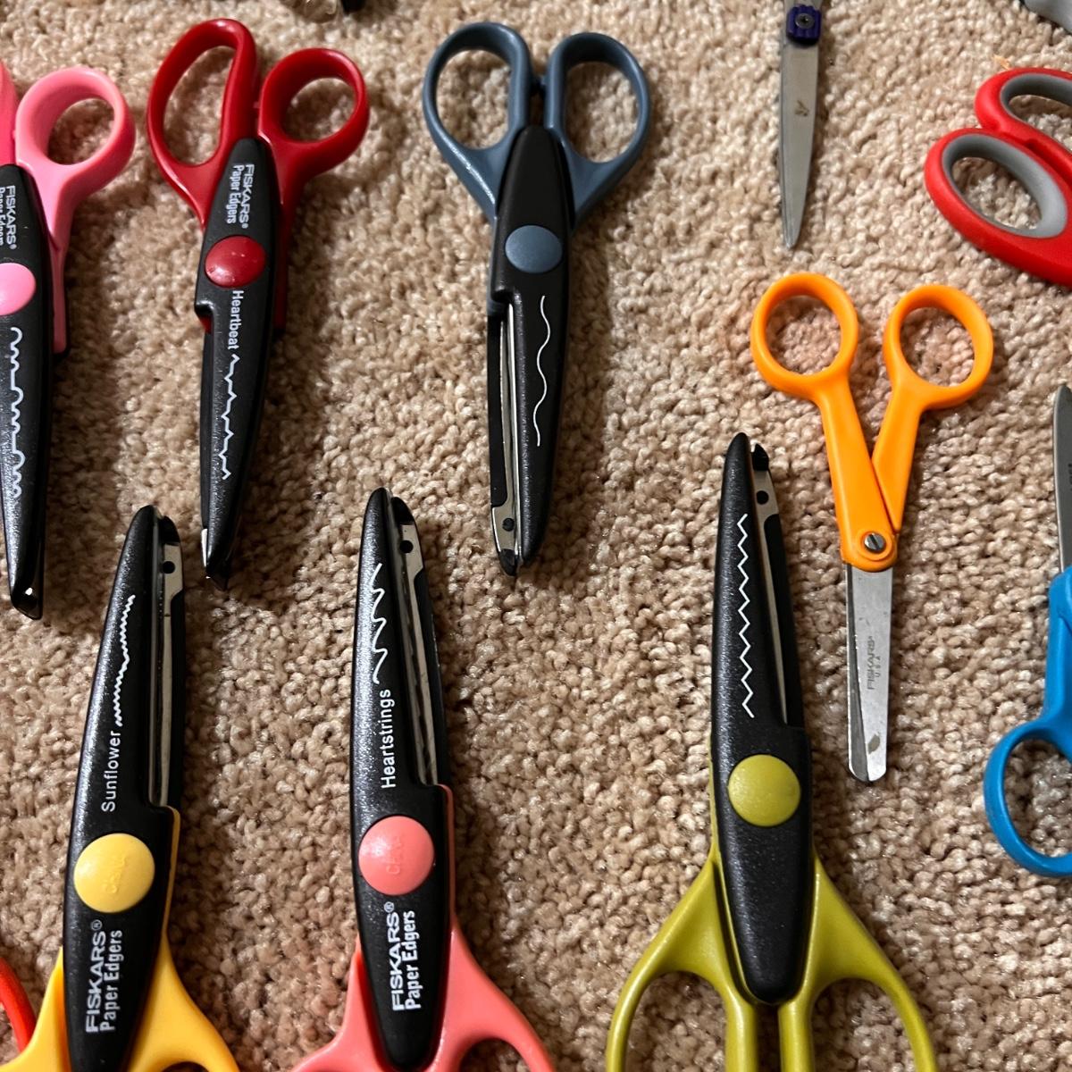Big box of glue sticks, multiple glue guns, decorative shaped scissors, fabric scissors, decorative hole punches, specialty scissors.