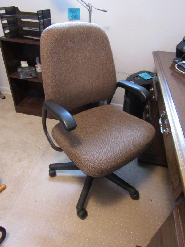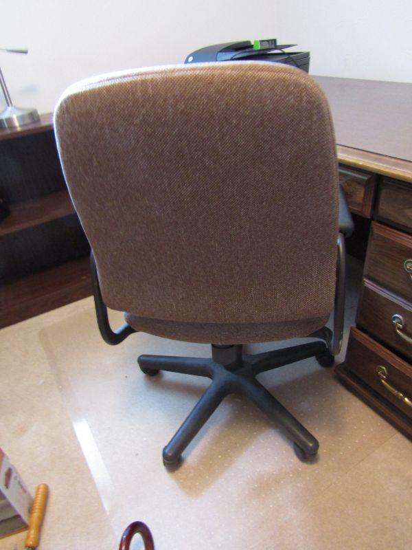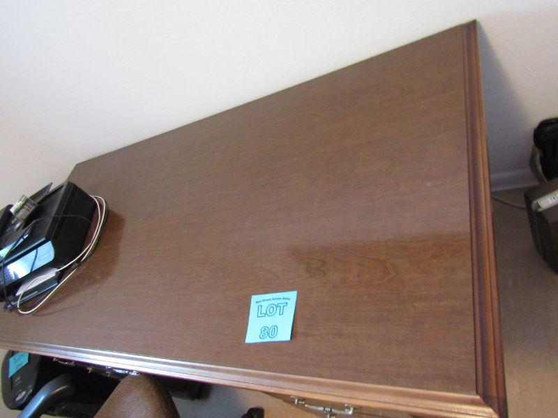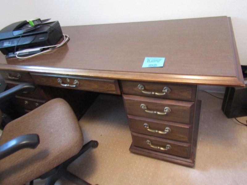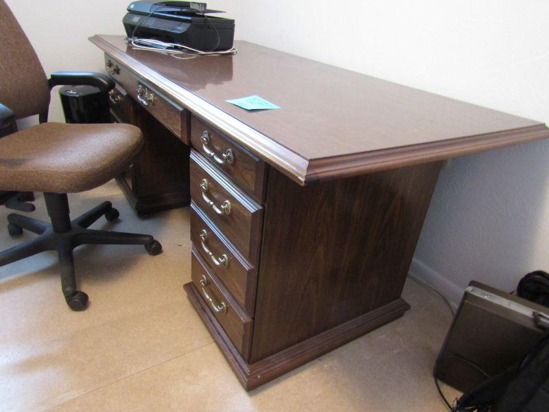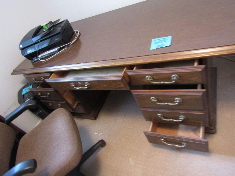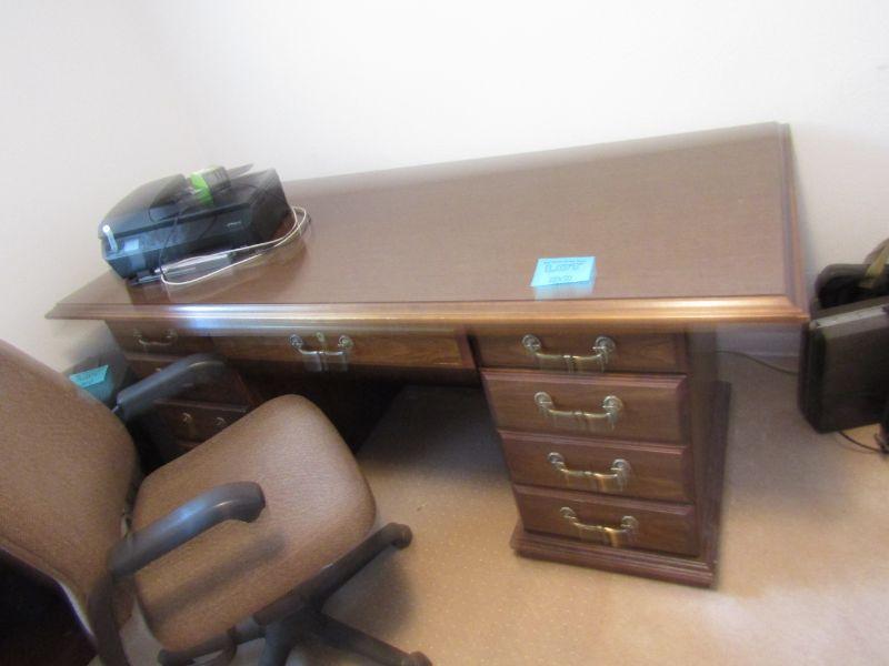6 DRAWER WOODEN DESK AND UPHOLSTERED ARM DESK CHAIR ON CASTORS