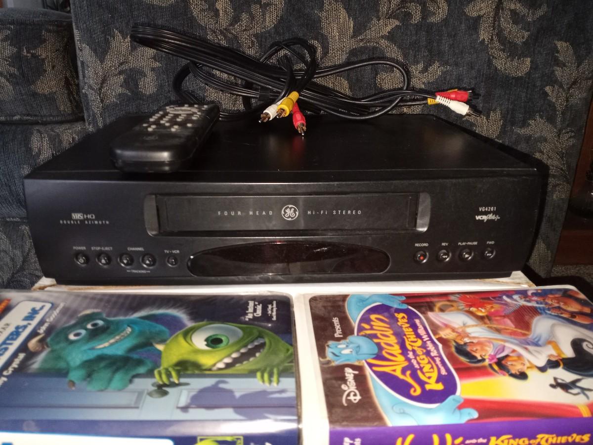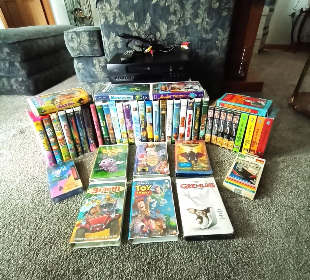 VHS HI FI STEREO VCR PLAYER AND LARGE VARIETY OF DISNEY VHS MOVIES AND OTHERS