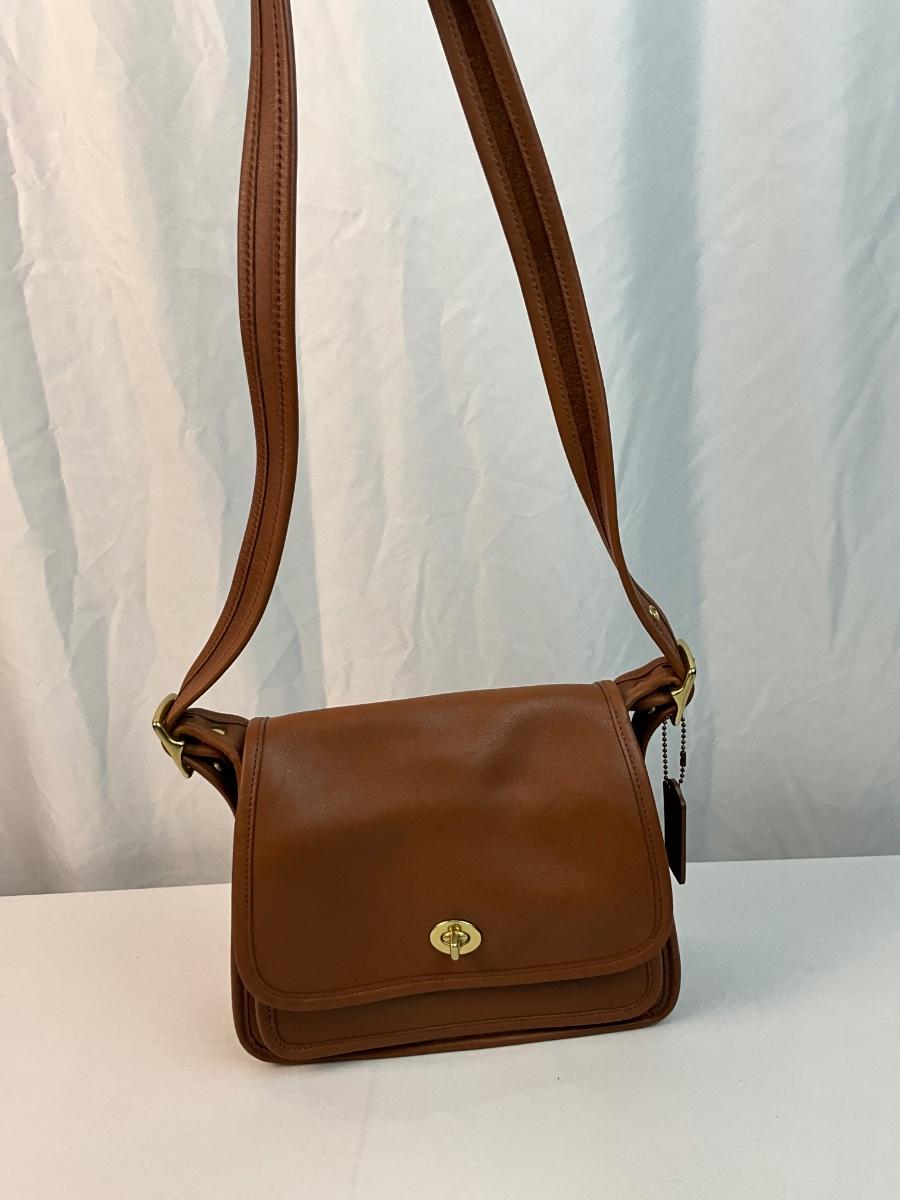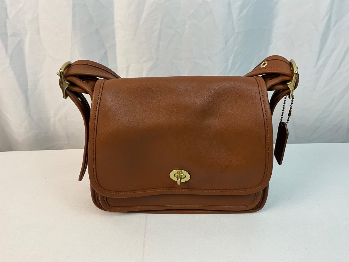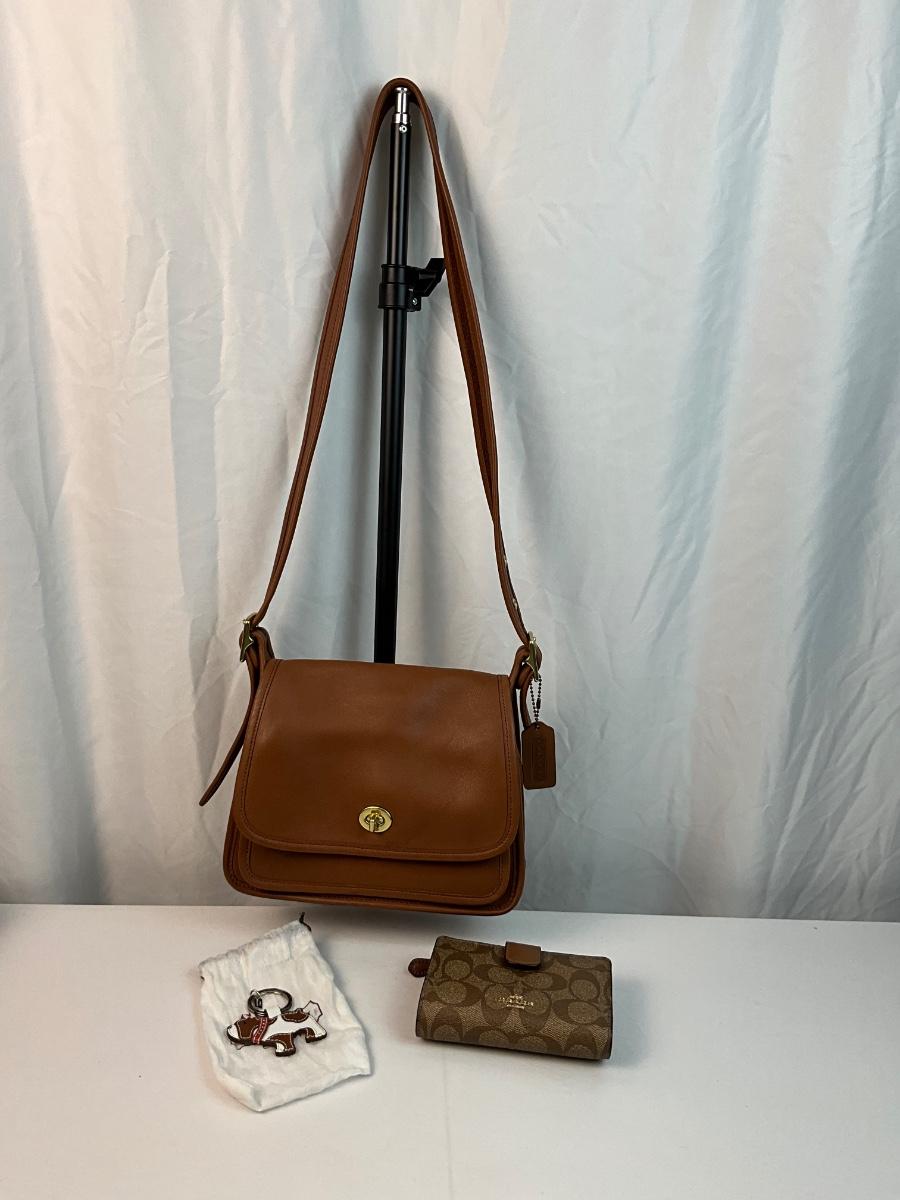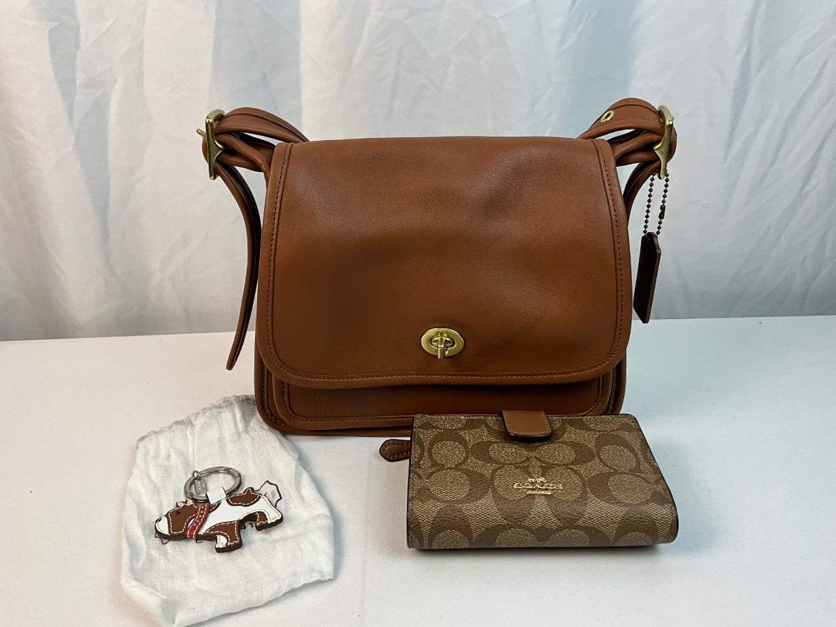 Vintage Coach Ramblers Legacy flap leather shoulder bag. Coach Signature bi-fold wallet. Coach dog keychain