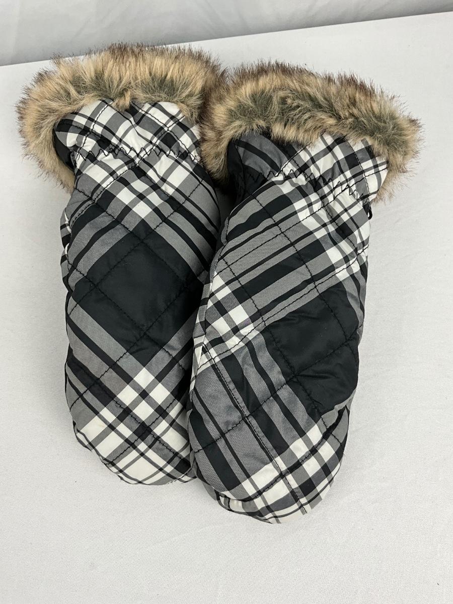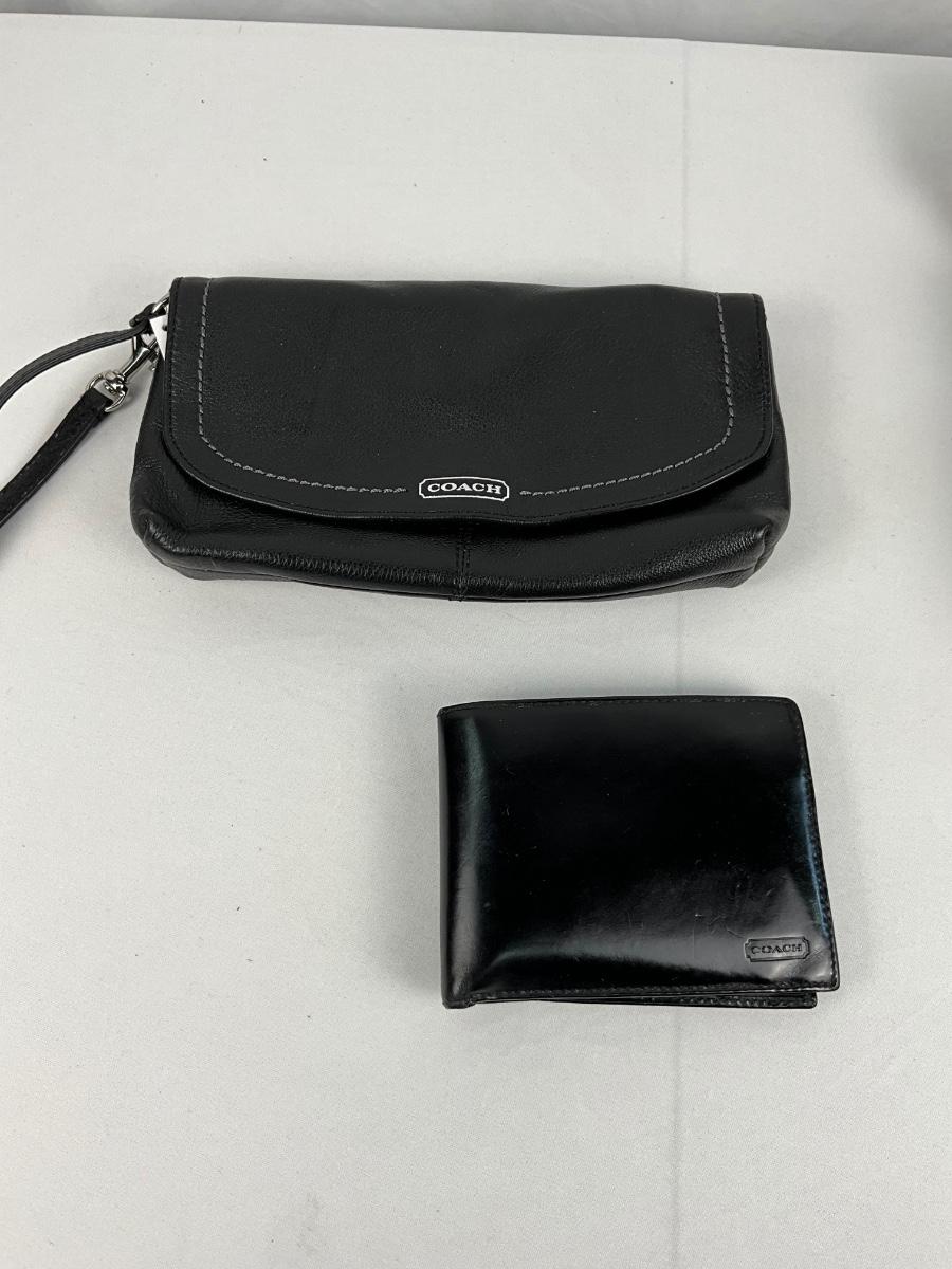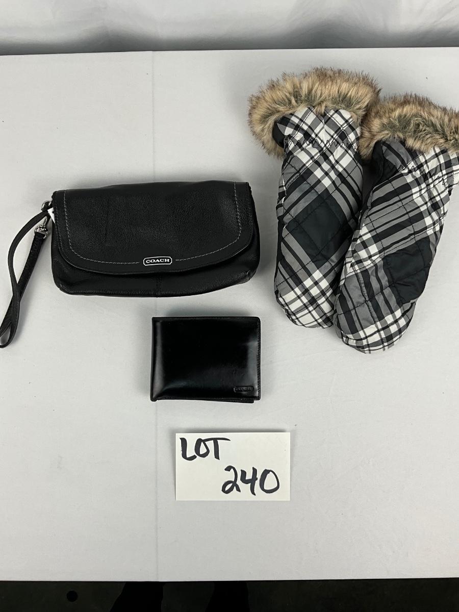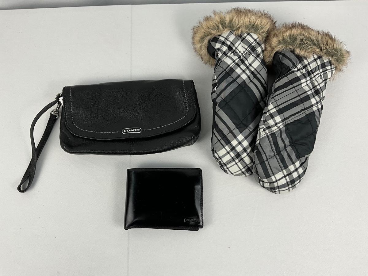 New With Tags Coach black leather clutch. Gently used Coach bifold wallet. Pair of black and white mittens.